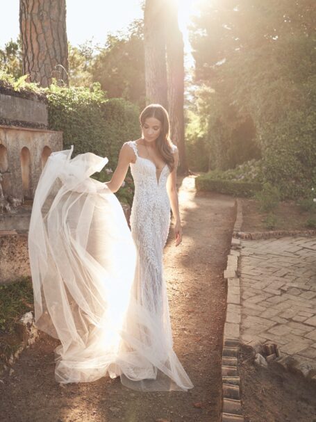 This sheath Jade dress is made of lace and tender fabric. Lace wedding dress with floristic motives is decorated with beads and crystals. The V-shaped low neck makes the dress more feminine. Moreover, the bridal gown has two underarms cuts аnd one at the back of a wedding gown. Veiling cape with lace insertion complete this look.
