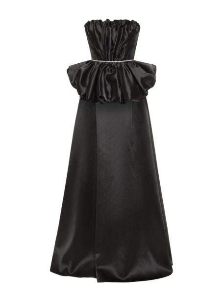 Спокуслива і сексуальна – ця весільна сукня точно не залишить вас непоміченою. Виготовлена з атласу, який зібраний у складки з лівого боку. V-подібний виріз з глибоким декольте також має тонкі бретелі. Спідниця має асиметричний крій і розріз на одній нозі. Атласна спідниця спадає в повну довжину і створює гарний короткий шлейф.