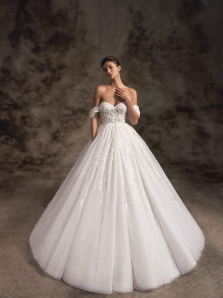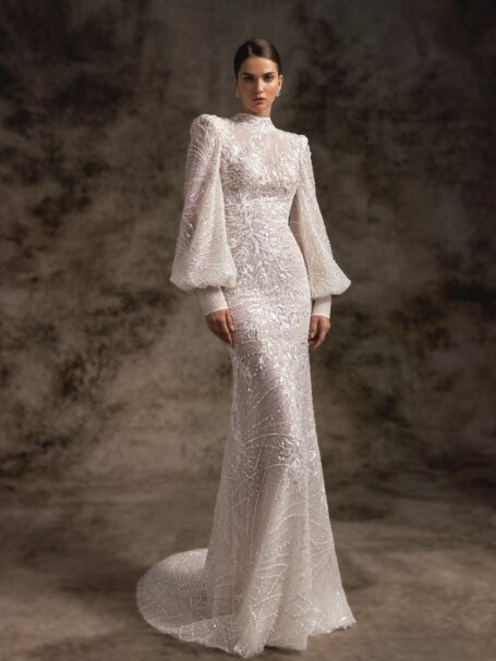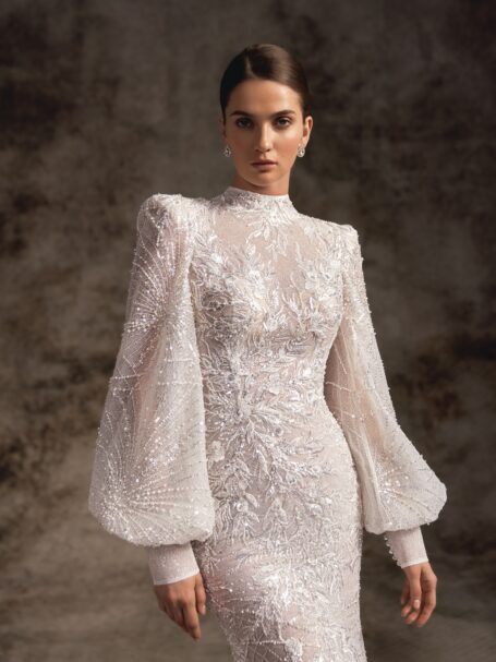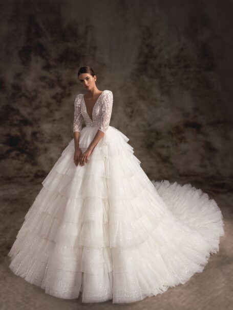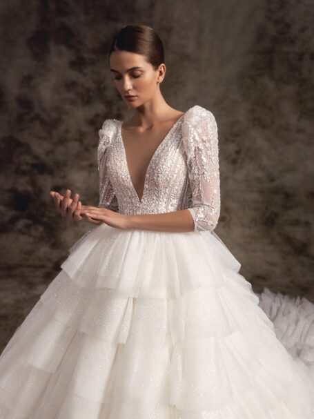 “Vintage” – це справжня бальна сукня, натхненна стилем королеви, прикрашена масивною вишивкою, яка спадає вниз по об’ємній повній спідниці з фантастичним шлейфом. Красивий закритий корсет з високою стійкою прикритий тією ж самою вишивкою, що і довгий болеро з високою стійкою і рядом гудзиків на спині.