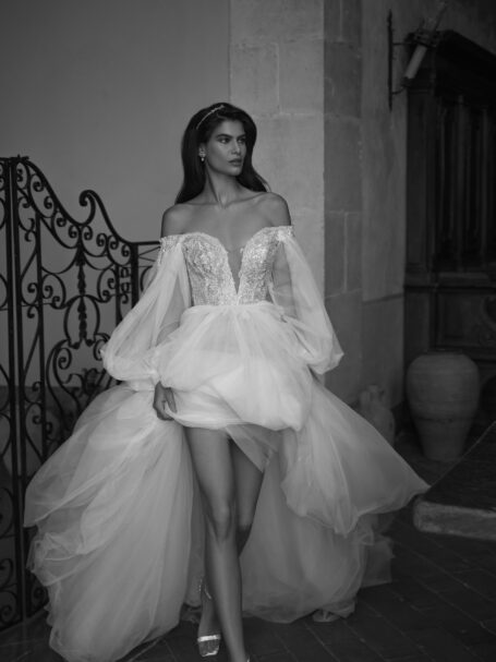 Це спокусливе і романтичне весільне плаття у стилі “А-силует”. Воно має глибокий V-подібний корсет з тонкими бретелями на спагетті і відкритим спинним вирізом. Корсет прикрашений мініатюрними вишивками квітів, а легкі шари легкого тюлю на спідниці переходять у шлейф катедральної довжини, який закінчується у формі загостреного хвоста.
