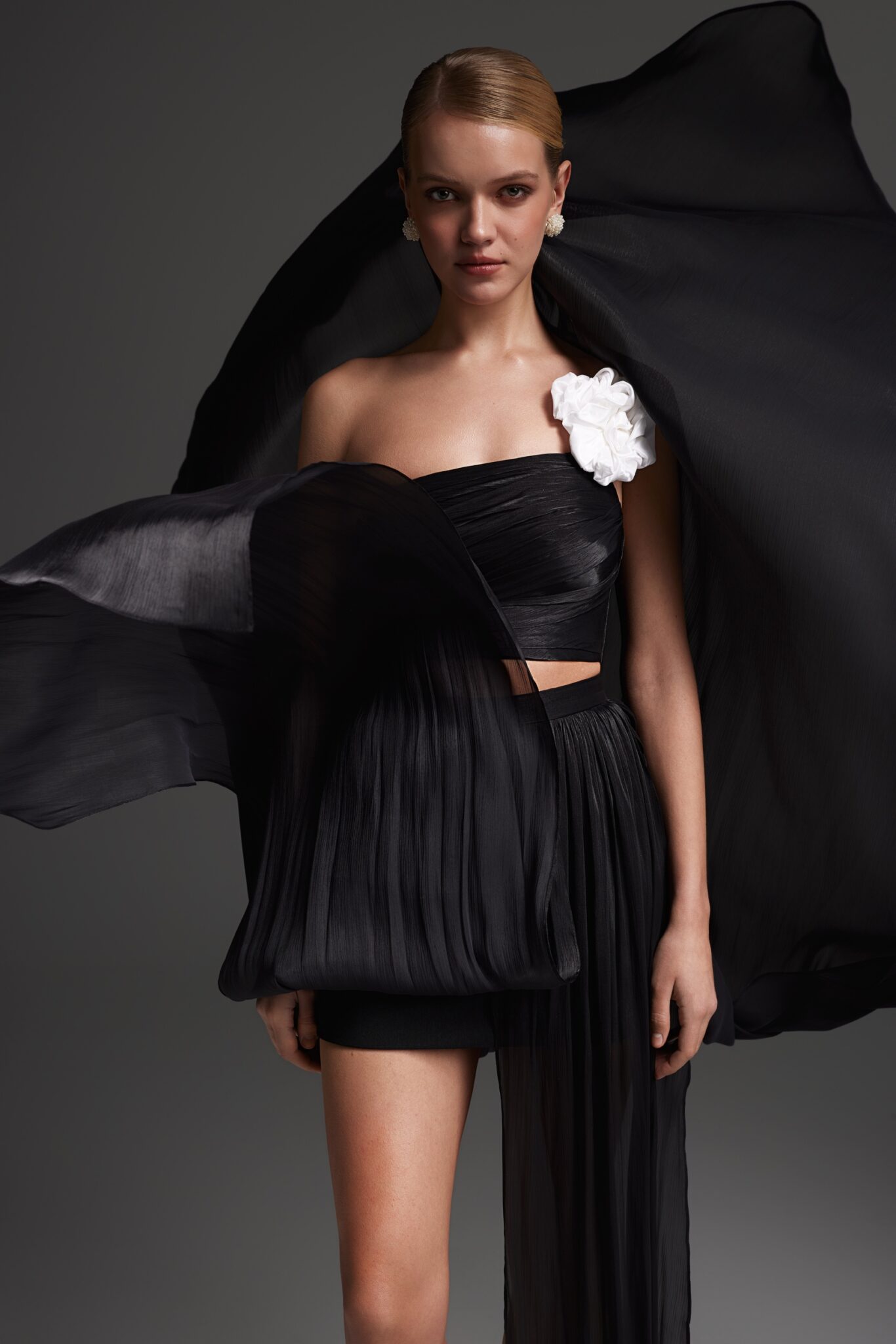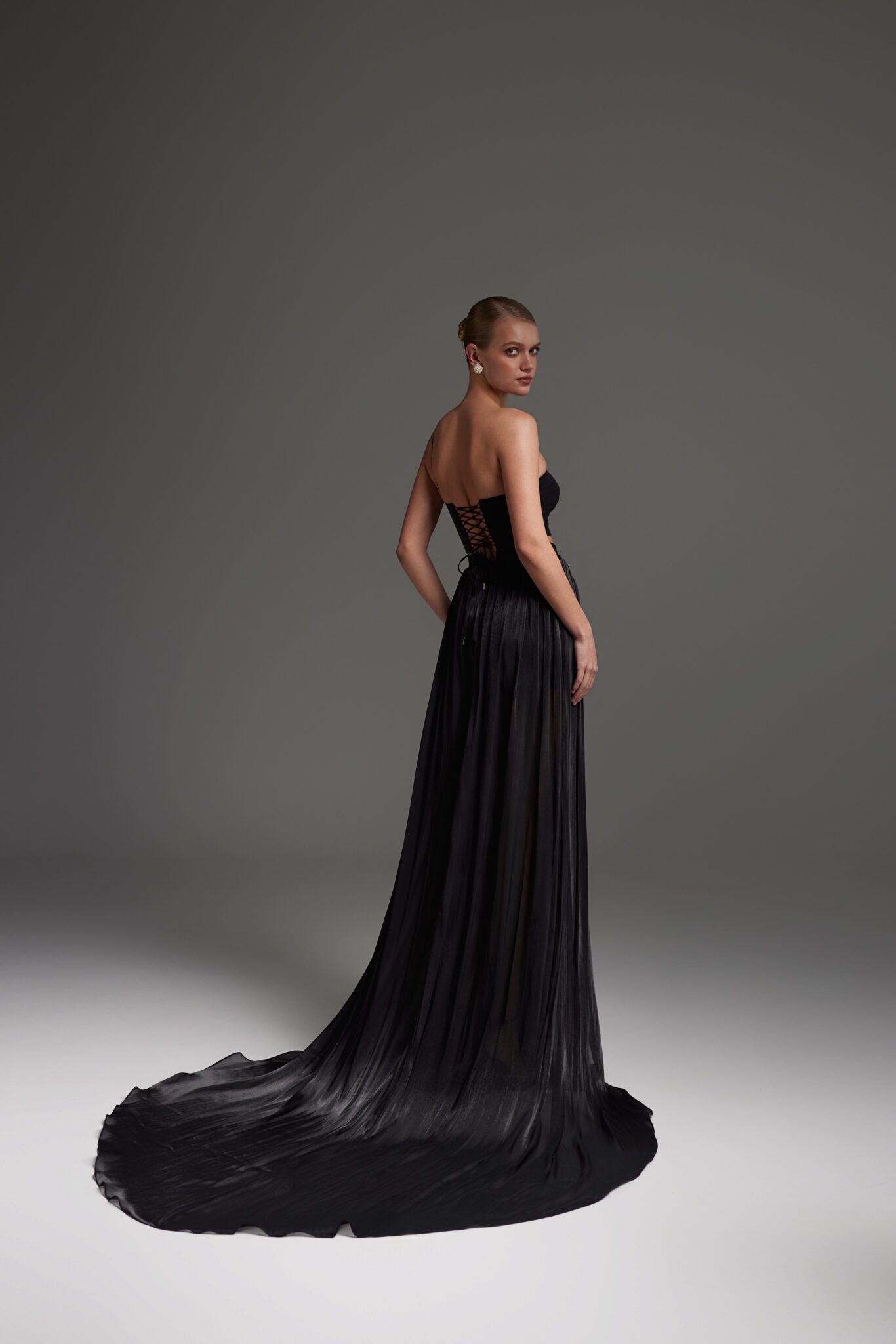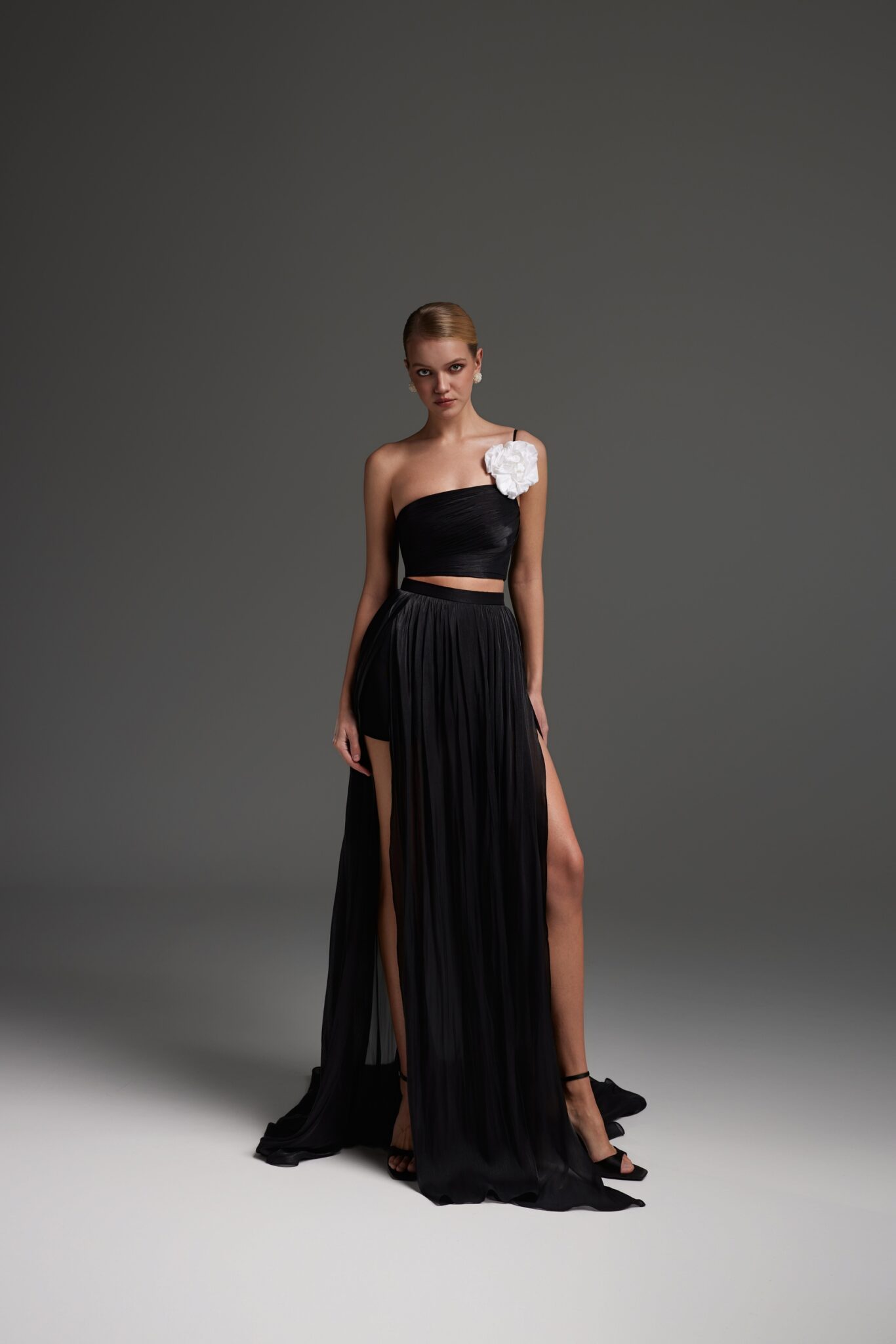 Сукня 2710 складається з двох окремих елементів — топа та спідниці. Топ має ніжну драпіровку спереду та шнурівку ззаду для посадки та регулювання, декорований квітковим елементом. Довга спідниця легка, повітряна та прозора, коротка спідниця забезпечує комфорт. Доступна в чорному кольорі.