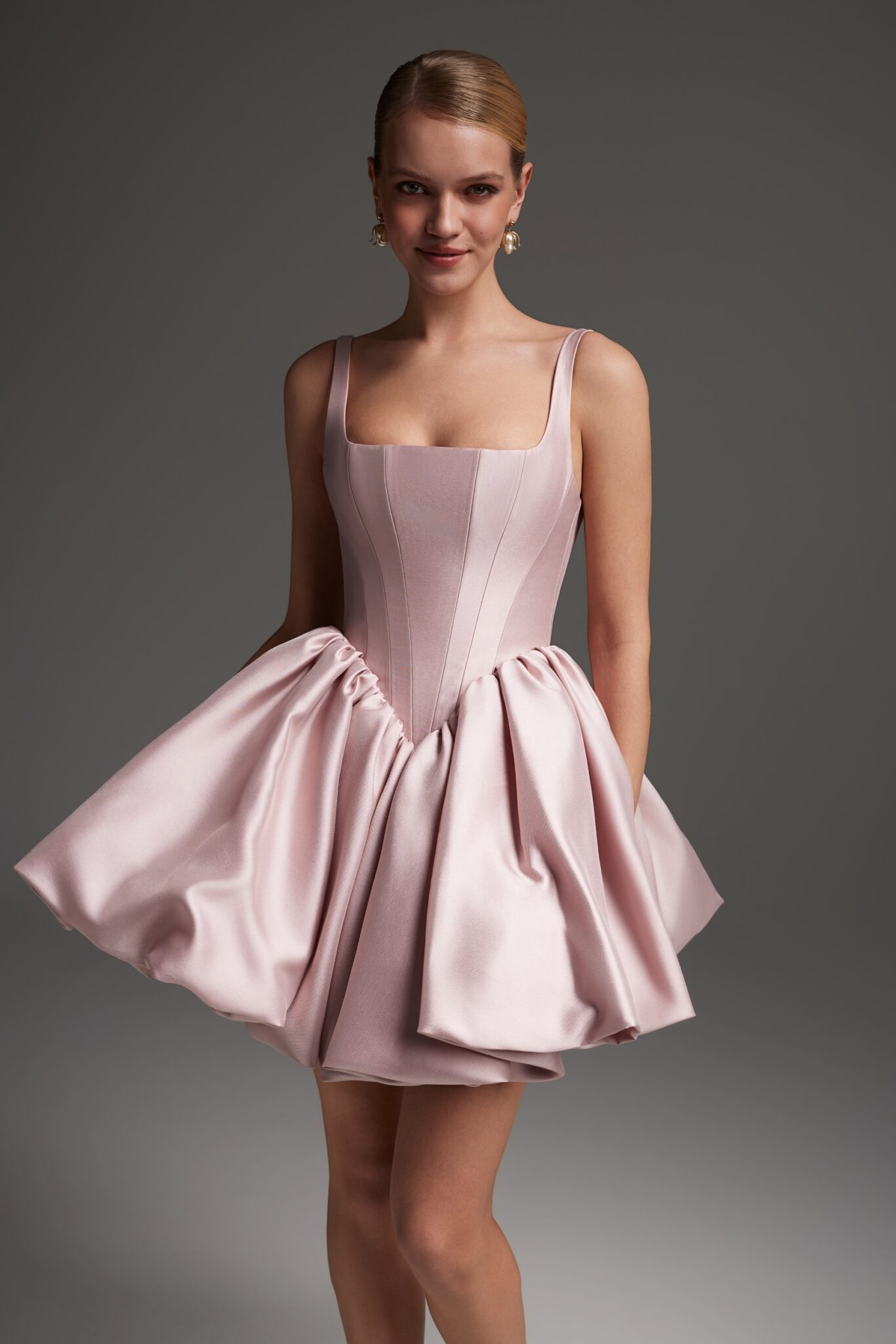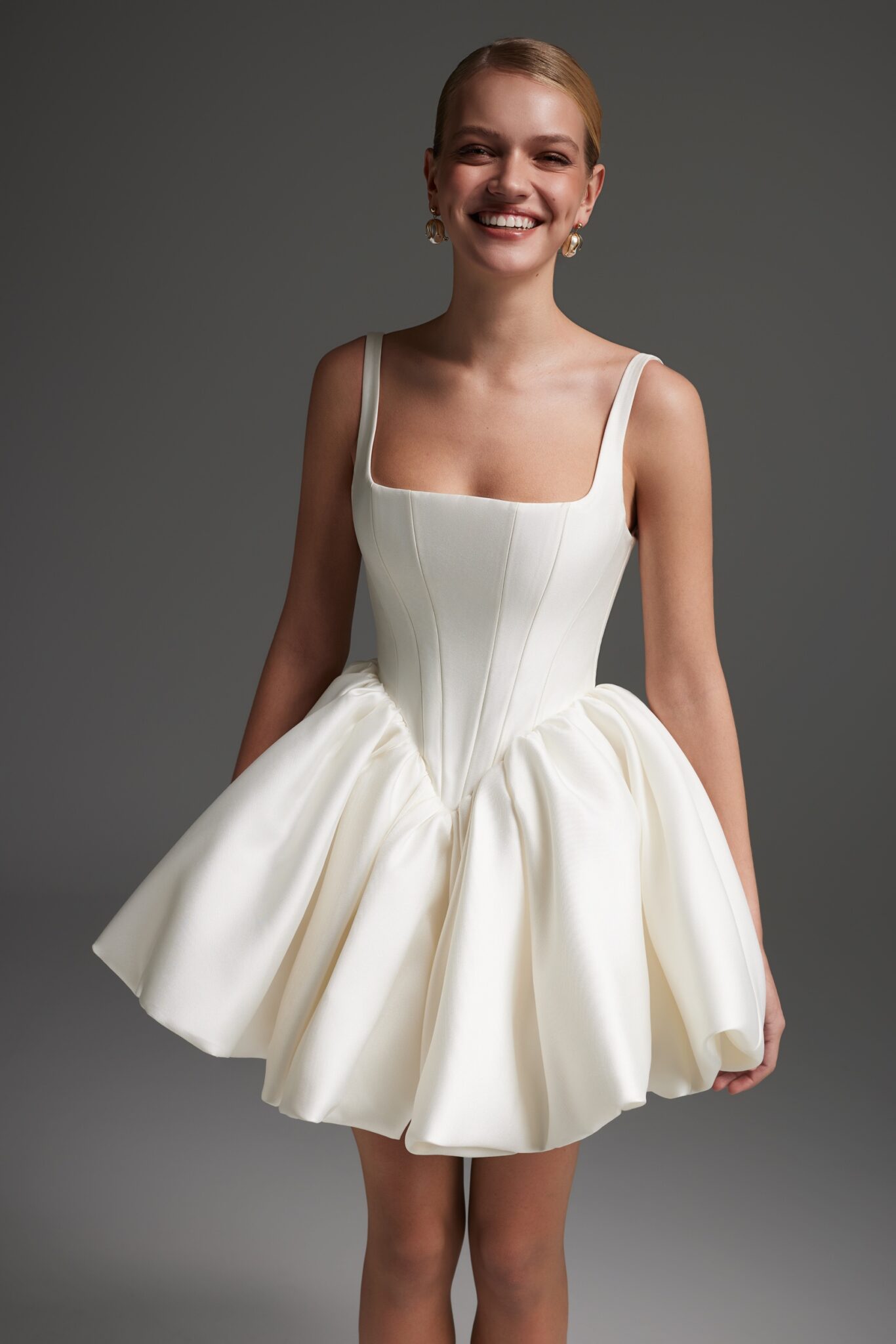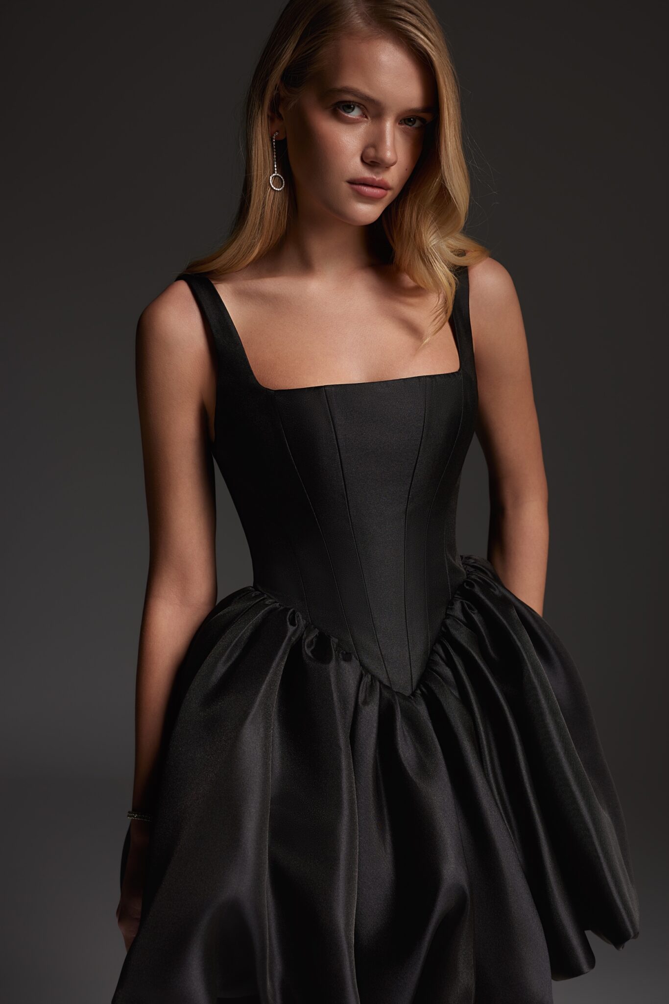 Міні-сукня з гладкого мікадо на базі корсету зі шнурівкою. Прямий виріз і прості бретелі додають елегантності, а пишна спідниця — легкості та грайливості. Доступна в чорному, айворі та рожевому.
