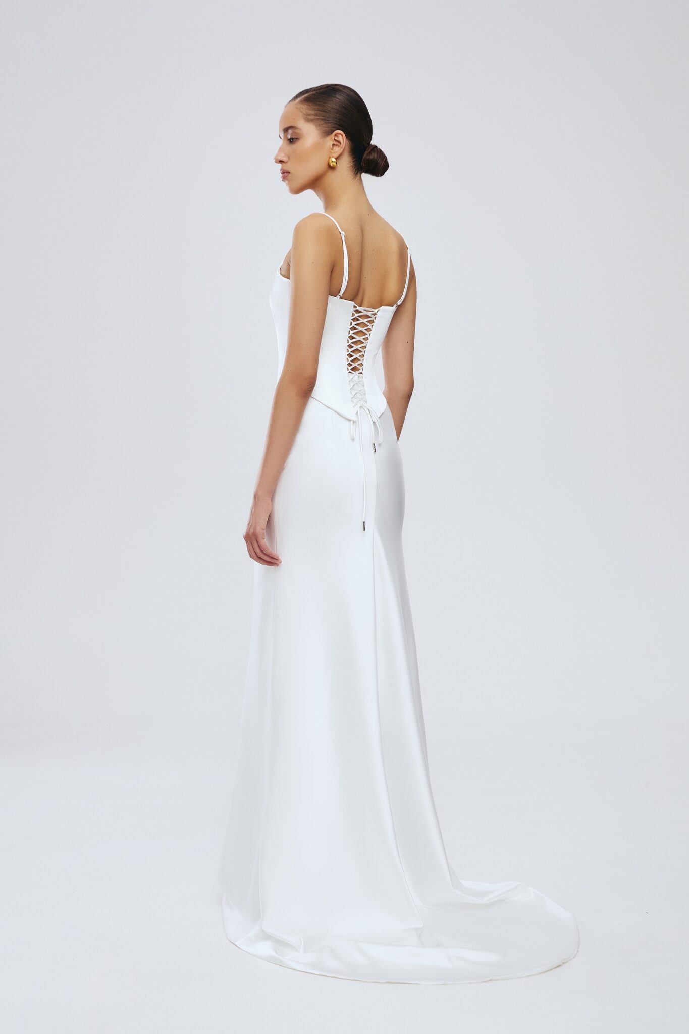 Ця приголомшлива атласна максі-спідниця кольору слонової кістки елегантно спадає до підлоги, пропонуючи витончений силует, який підкреслить будь-який образ. Створена для бездоганного поєднання з корсетом, ця спідниця поєднує в собі розкіш та універсальність, що робить її ідеальною як для офіційних заходів, так і для стильних вечорів.