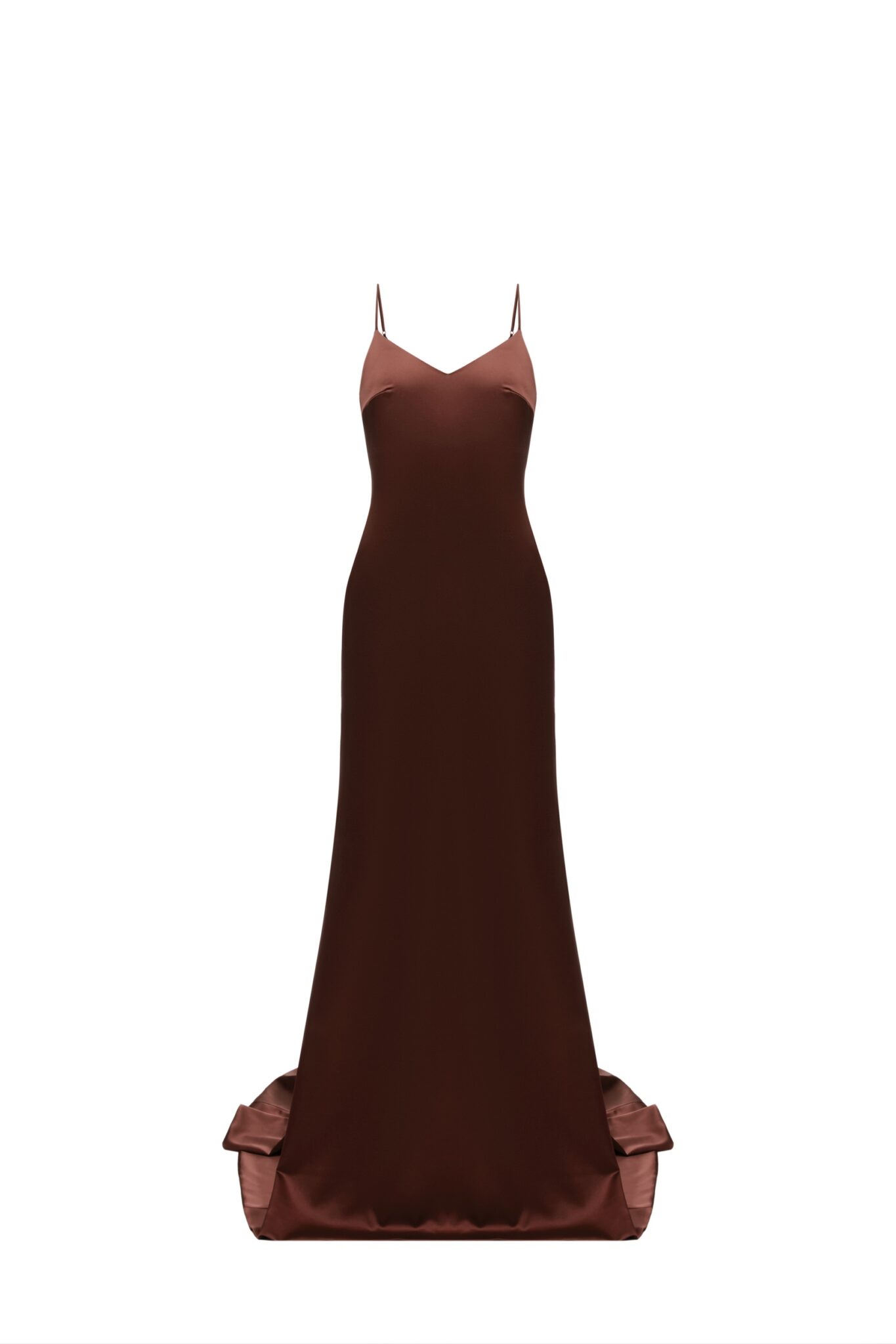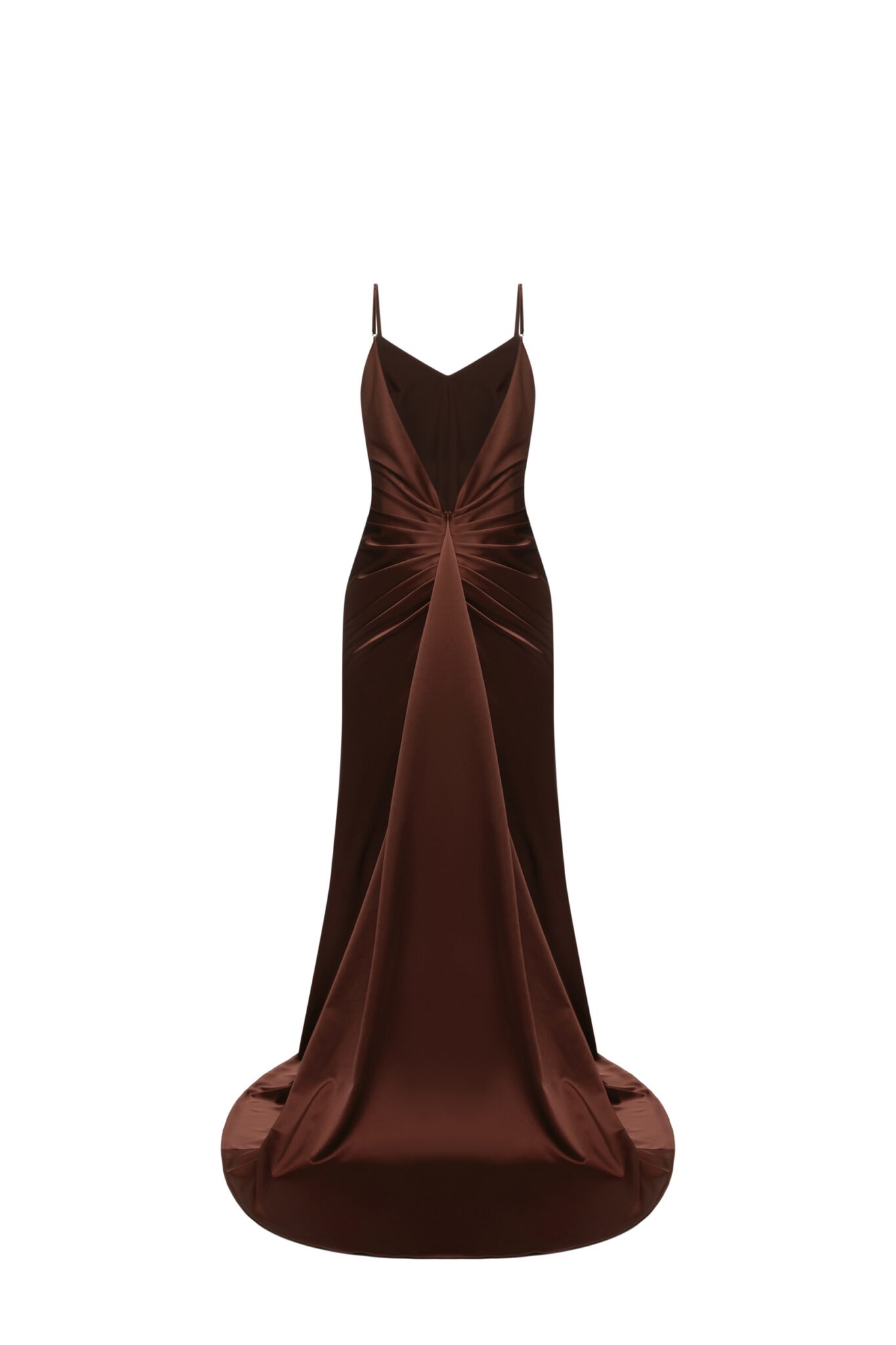 Ця розкішна сукня з шоколадного атласу має приголомшливий дизайн спинки, що додає спокусливого штриху до елегантного силуету. Декоративні елементи підкреслюють вишуканість сукні, створюючи ідеальний баланс стилю та чарівності. Ідеальна для особливого вечора, ця сукня випромінює позачасову елегантність та сучасну привабливість.