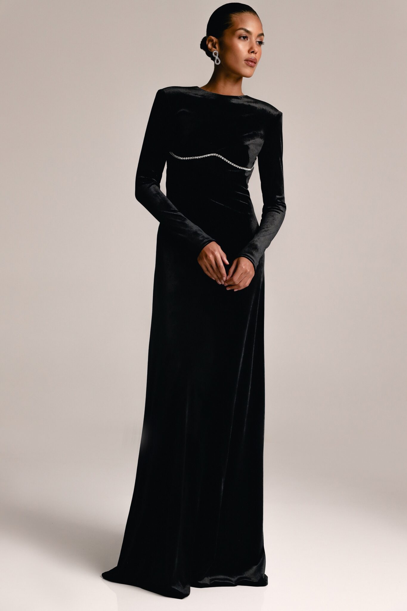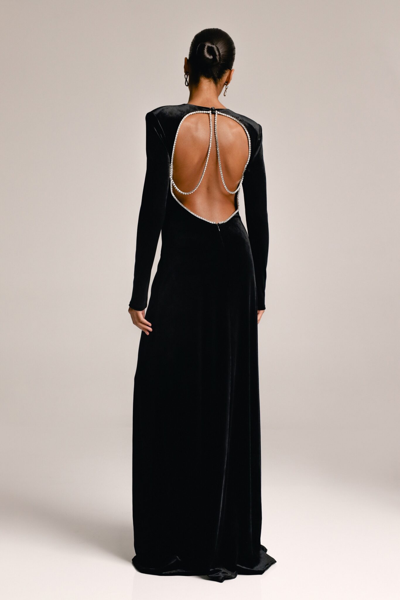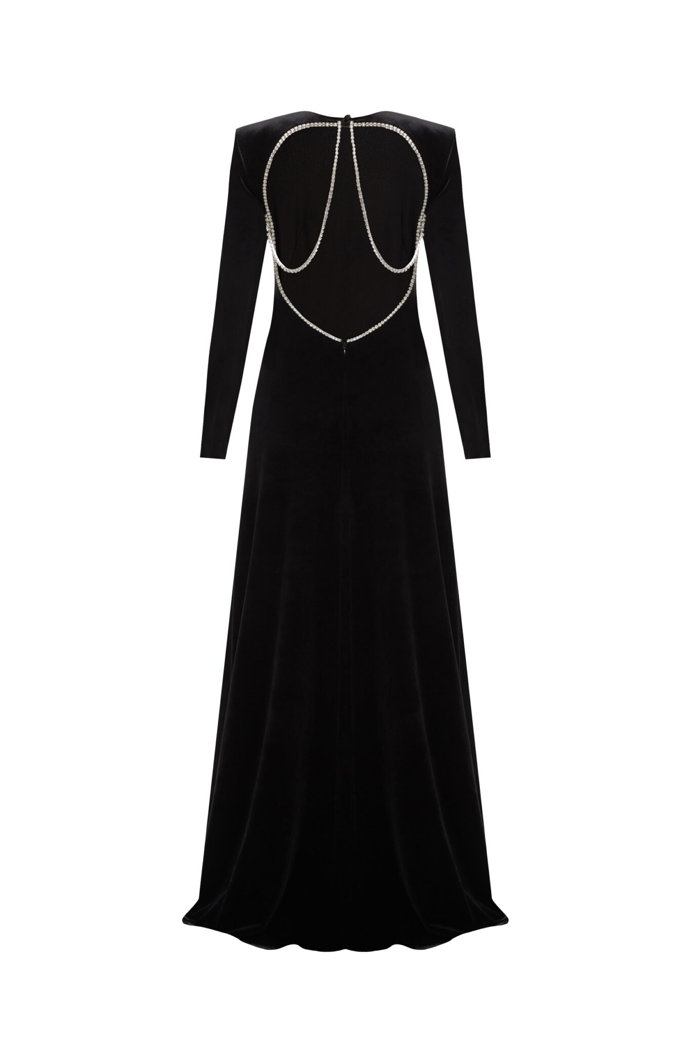 Ця розкішна оксамитова сукня з довгими рукавами прикрашена мерехтливими кристалами для гламурного ефекту. Приголомшлива відкрита спинка, акцентована кристалами, додає дизайну драматизму та елегантності. Ідеальна для особливого вечора, ця сукня випромінює вишуканість та витончену привабливість.