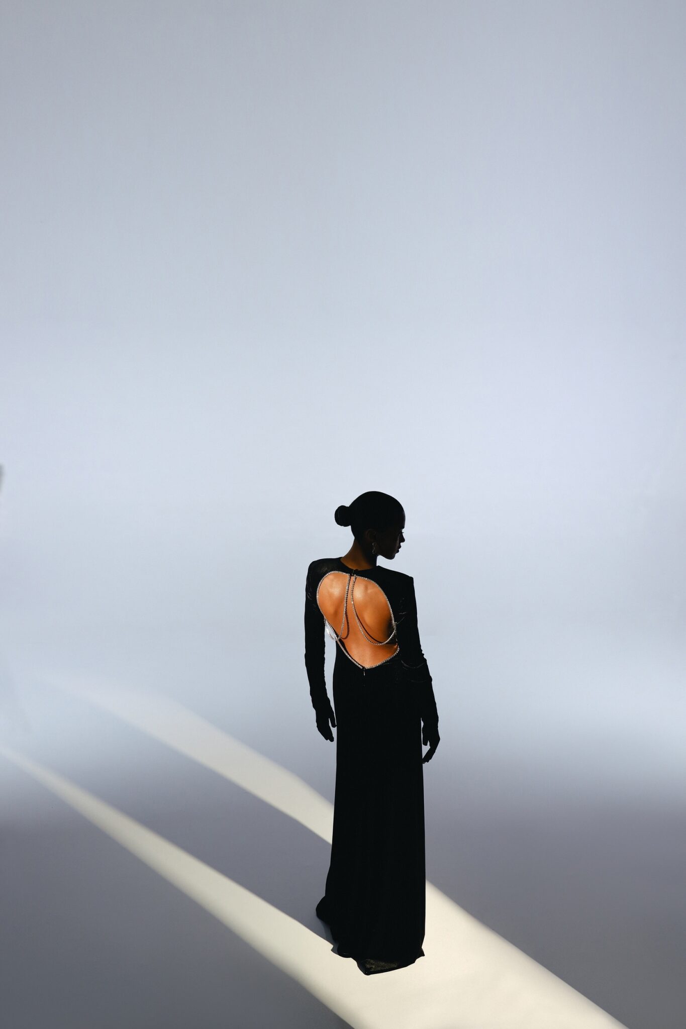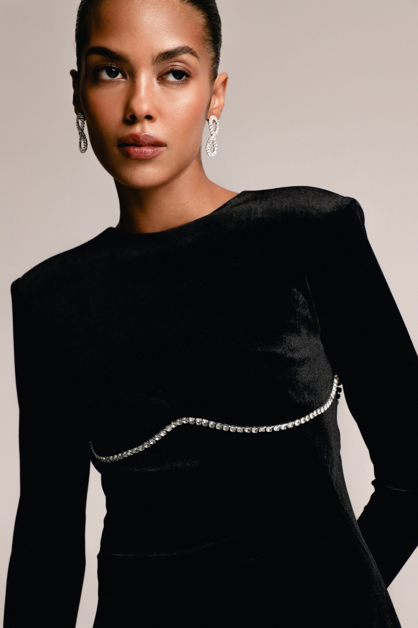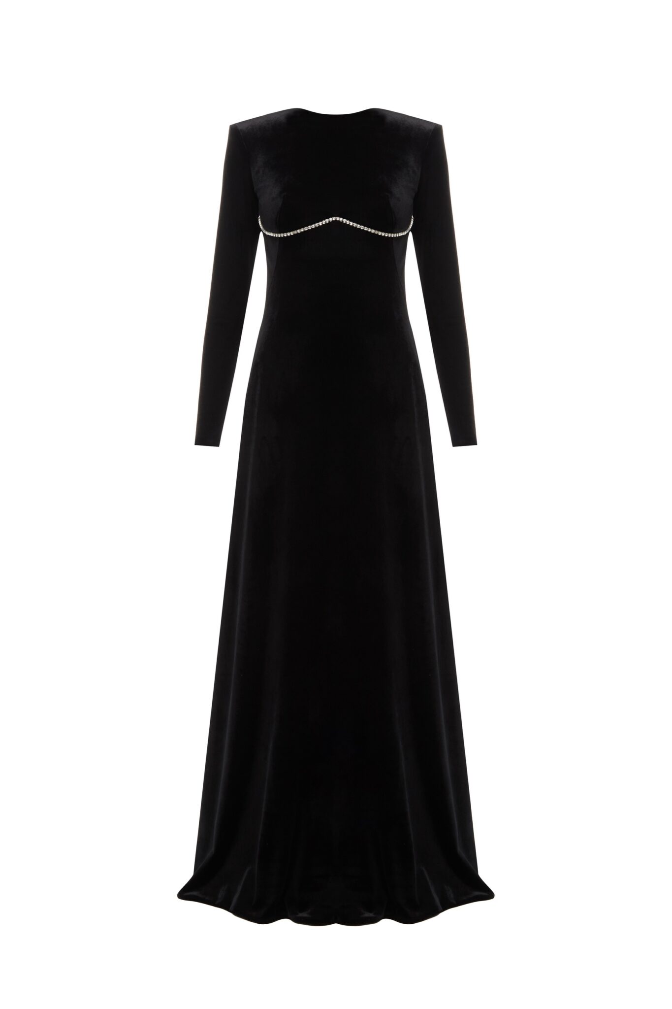 Ця розкішна оксамитова сукня з довгими рукавами прикрашена мерехтливими кристалами для гламурного ефекту. Приголомшлива відкрита спинка, акцентована кристалами, додає дизайну драматизму та елегантності. Ідеальна для особливого вечора, ця сукня випромінює вишуканість та витончену привабливість.