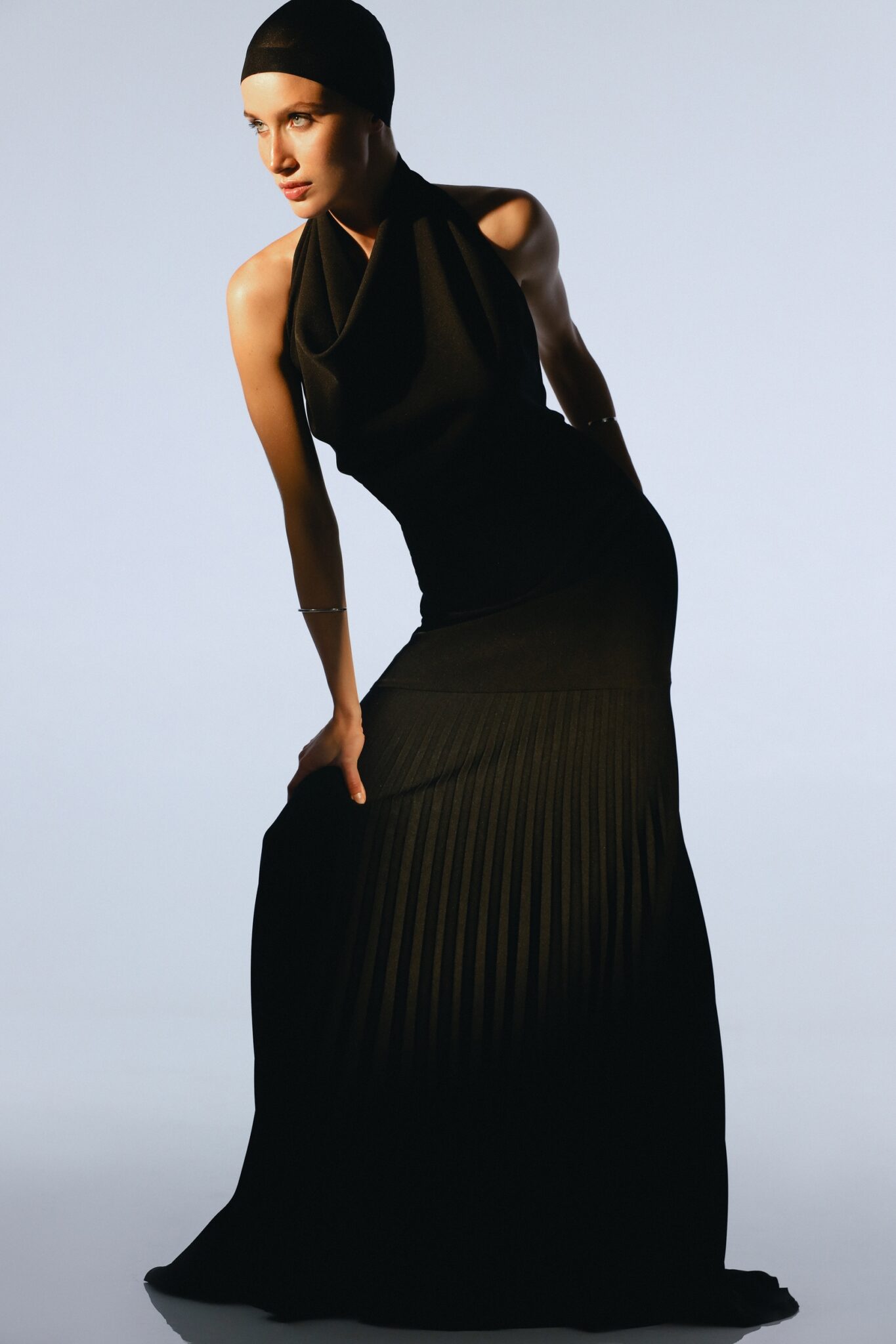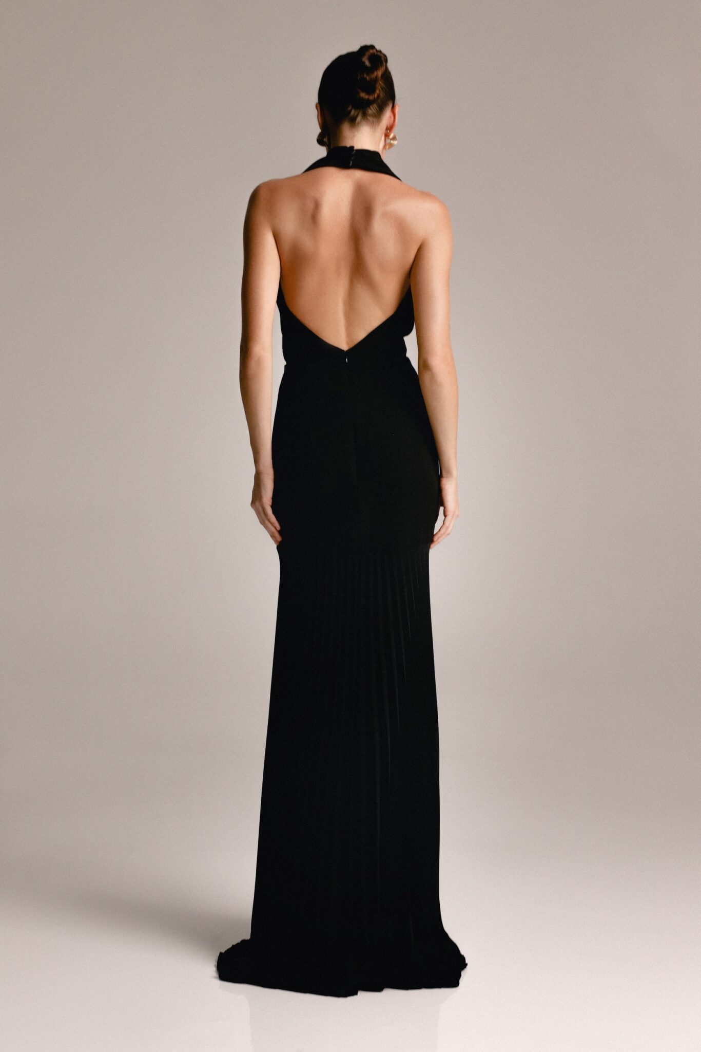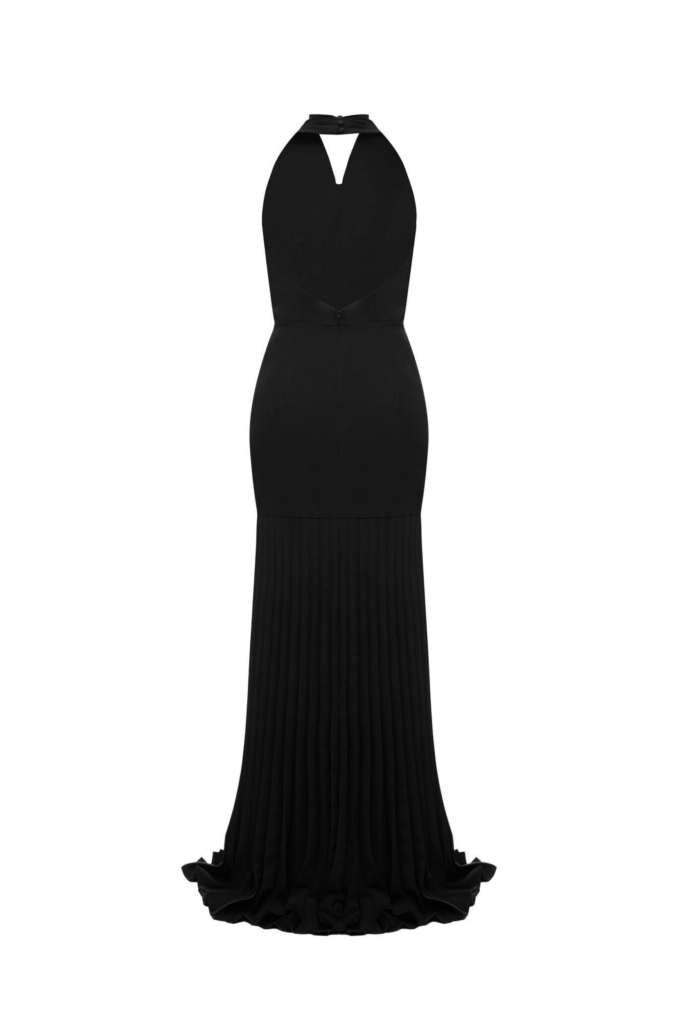 Ця вишукана чорна сукня до підлоги має плісировані деталі, що додають текстури та руху витонченому силуету. Високий виріз підкреслює її витончену привабливість, що робить її ідеальним вибором для офіційних заходів. Позачасовий дизайн, що випромінює елегантність та врівноваженість.