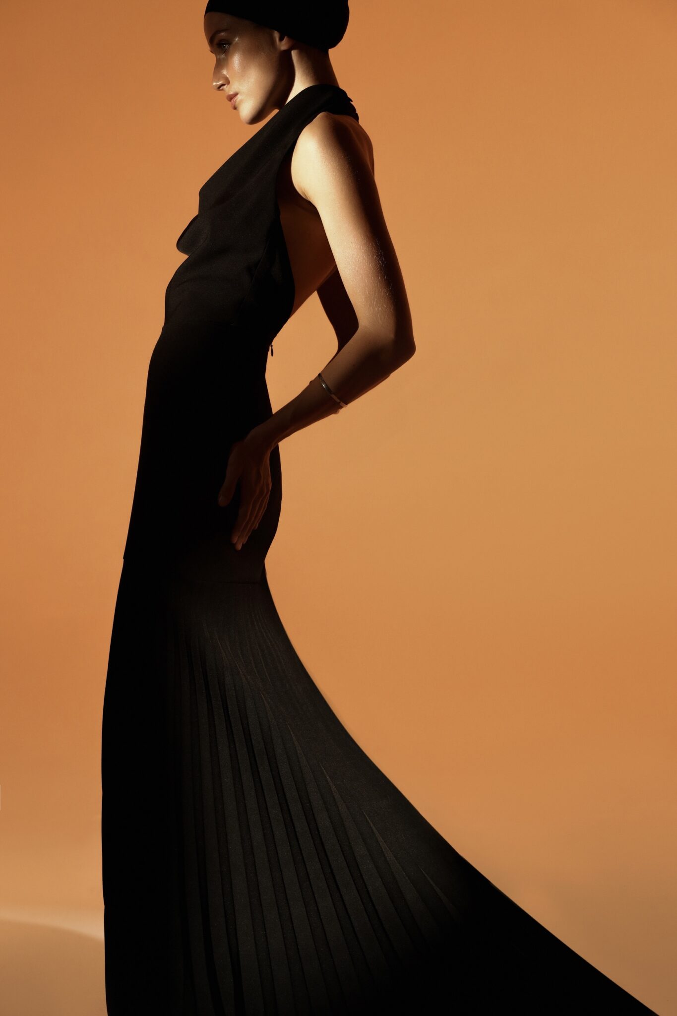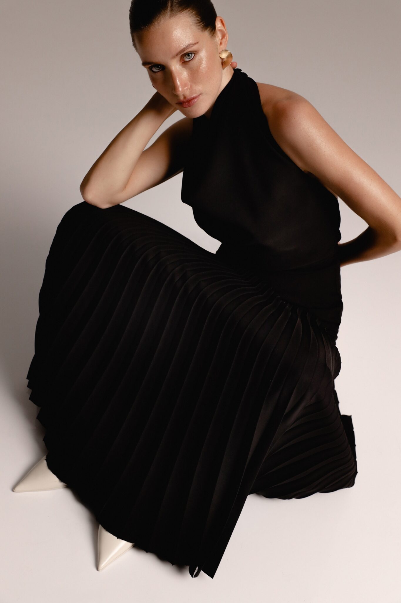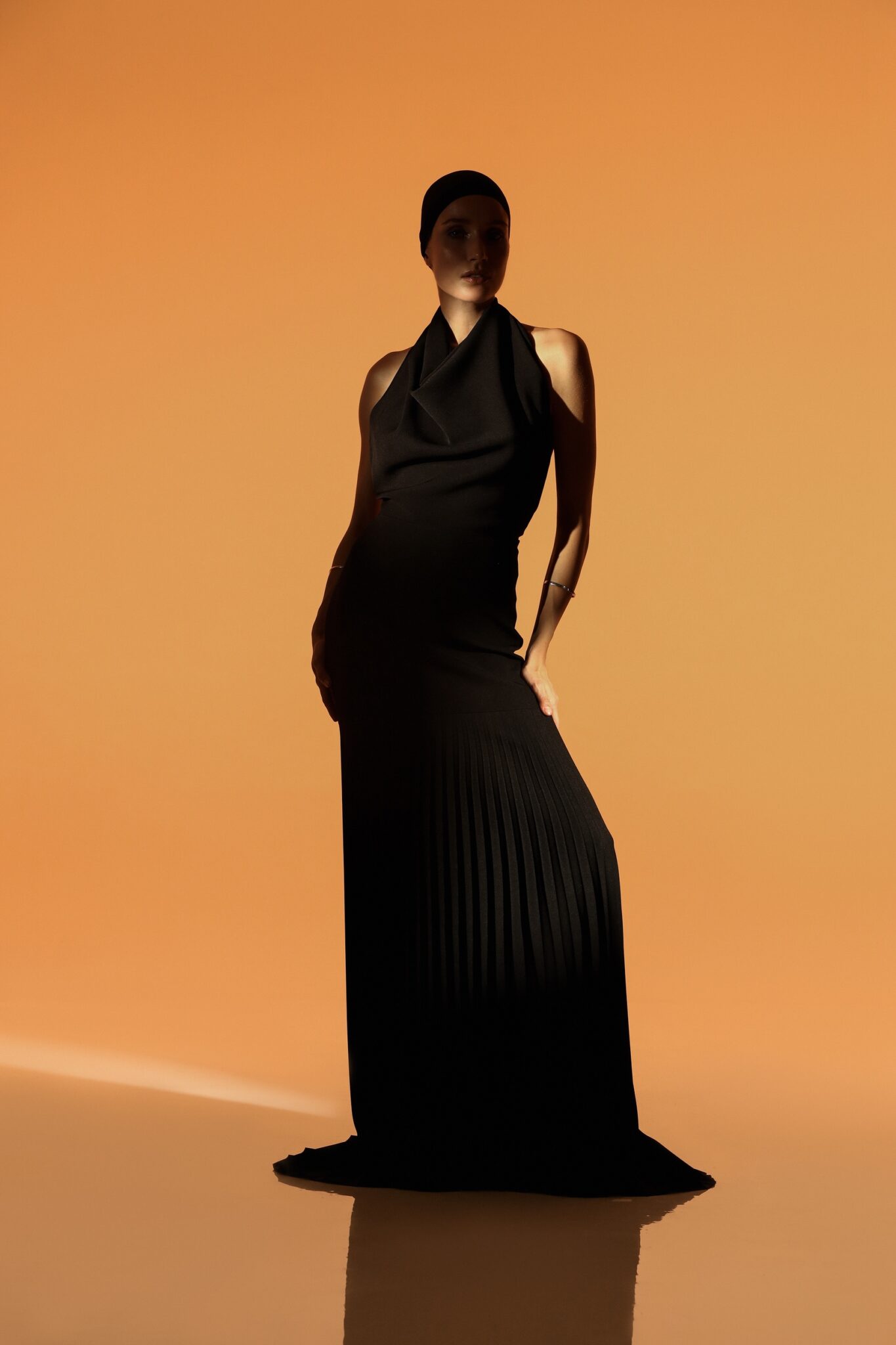 Ця вишукана чорна сукня до підлоги має плісировані деталі, що додають текстури та руху витонченому силуету. Високий виріз підкреслює її витончену привабливість, що робить її ідеальним вибором для офіційних заходів. Позачасовий дизайн, що випромінює елегантність та врівноваженість.