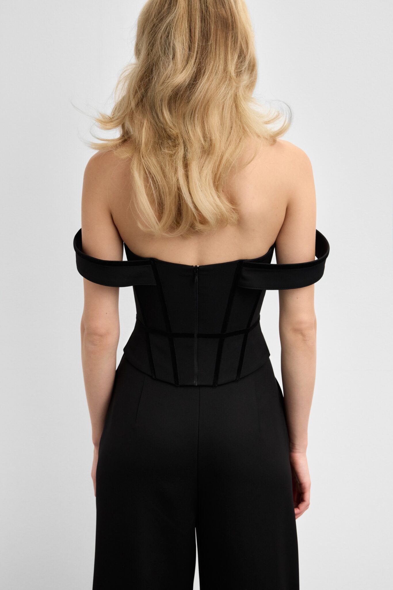 Корсет зі спущеними плечима та силуетними швами, що підкреслюють форму. Шнурівка на спині забезпечує ідеальну посадку. Доступний у двох кольорах: айворі та чорному.