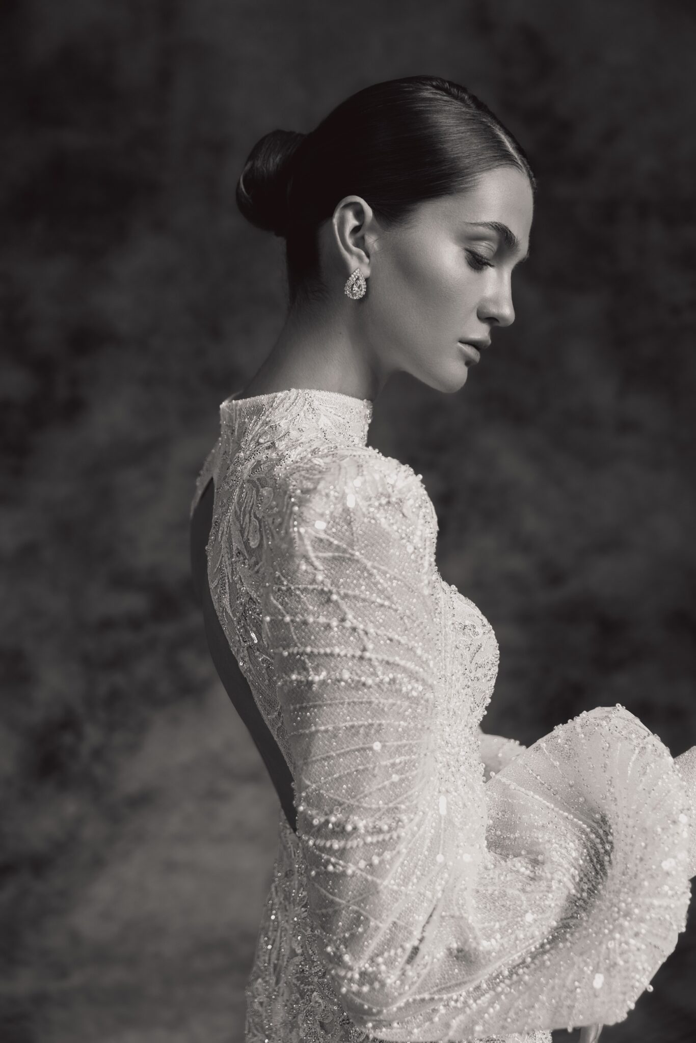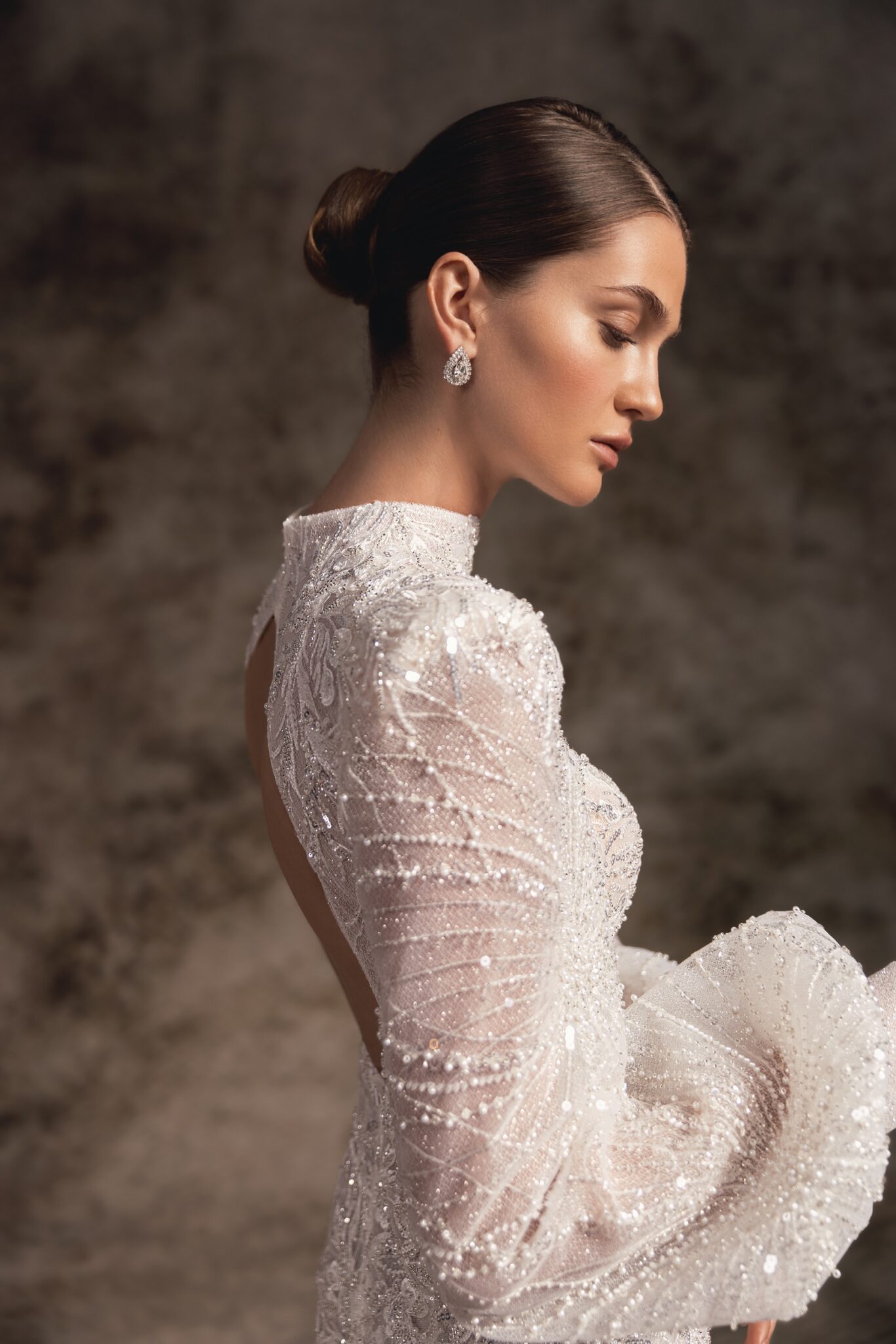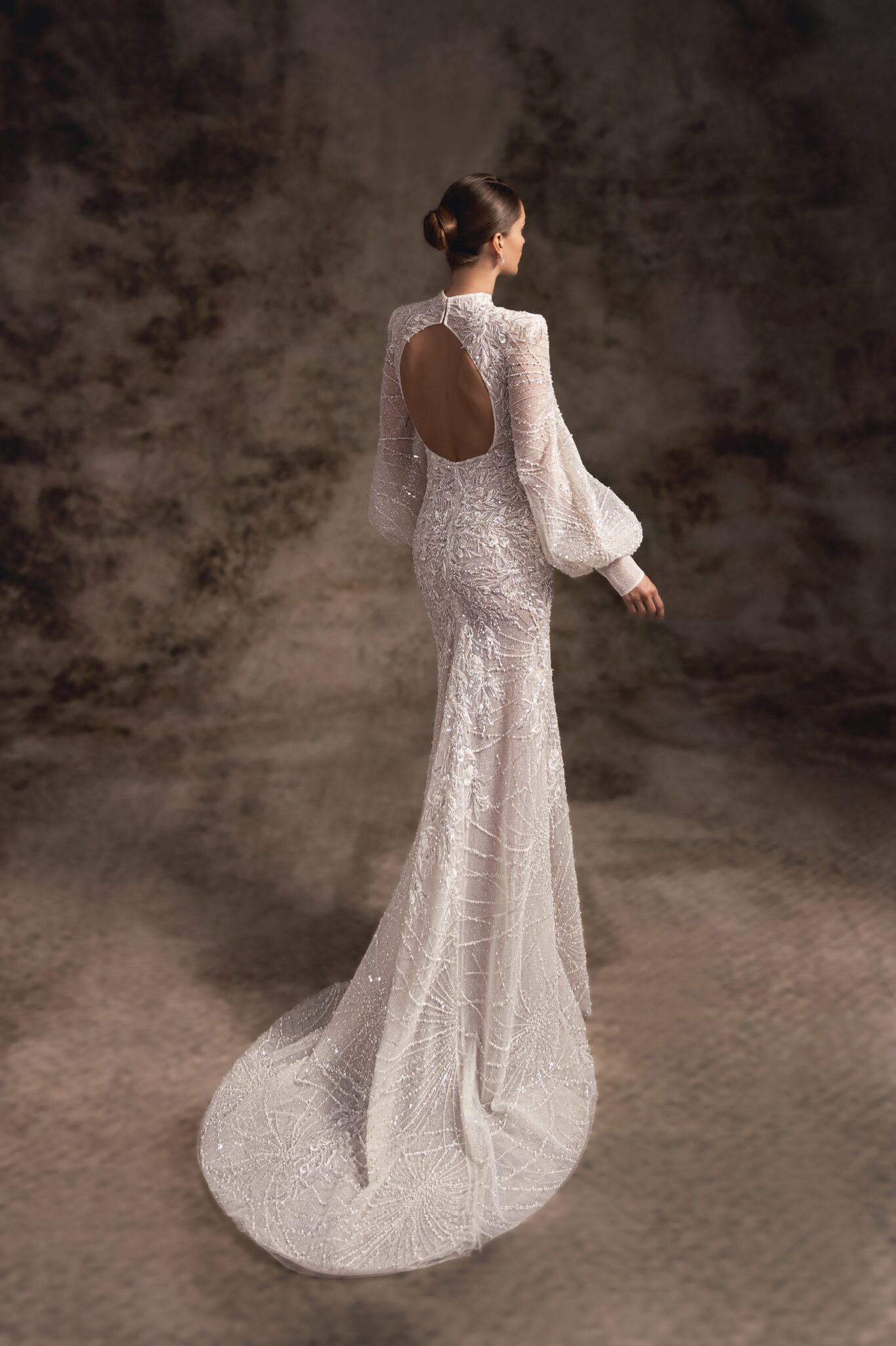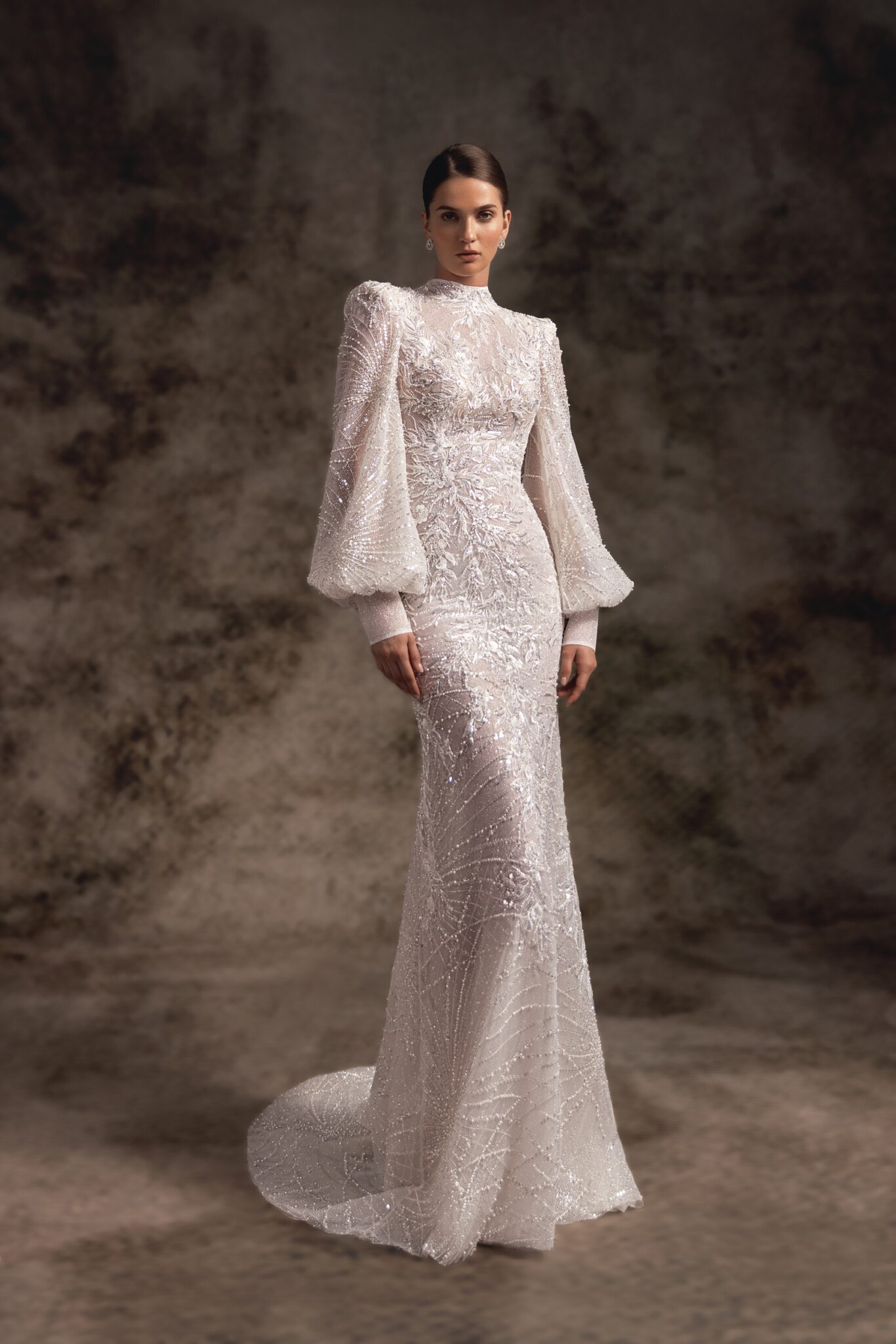 Alana – це блискуча весільна сукня з прозорою спинкою та прилеглим силуетом, виготовлена з ніжного вишитого мережива з довгими ліхтарними рукавами та високою горловиною. Вишукане вишите мереживо у вигляді павутинки робить цю захоплюючу сукню елегантним вибором для стильної та сучасної нареченої.