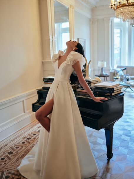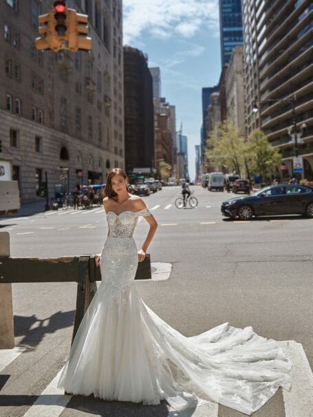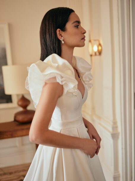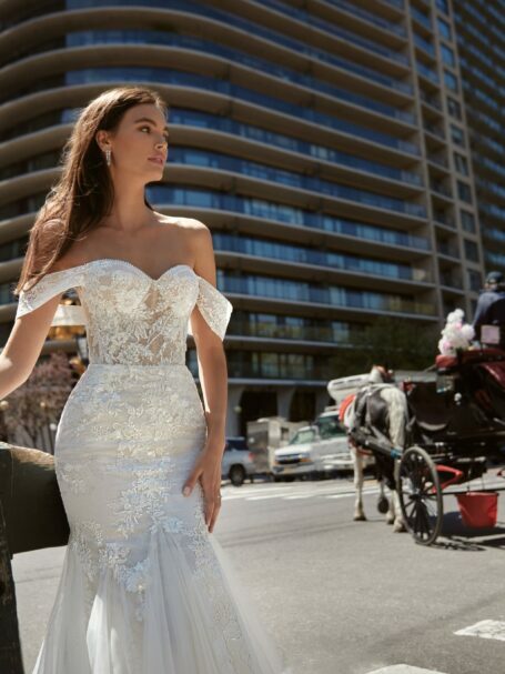 Alma – унікальна сукня силуету рибка з вишуканим шлейфом. Верх сукні прикрашений V-подібним вирізом, вкритий мереживом, розшитим штучними намистинами та блискітками. Плечі вкривають короткі мереживні рукави, а спинка сукні відкрита через глибокий V-подібний виріз. Спідниця приталена на стегнах і розширюється від колін донизу, спадаючи пишними фатиновими рюшами.