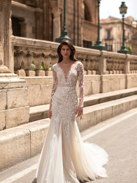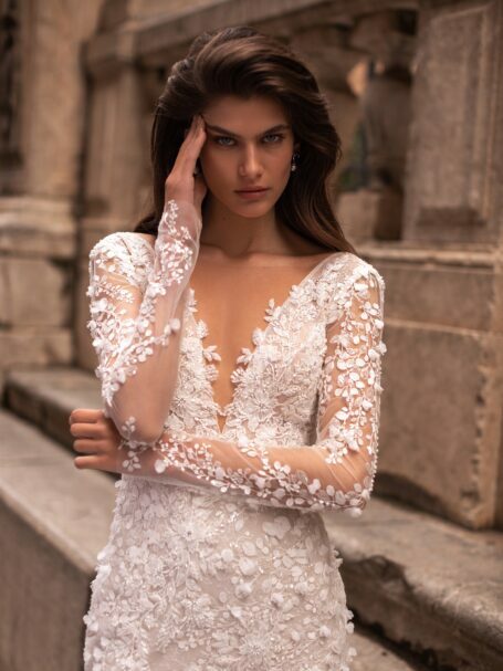 Жіночна сукня-рибка з атласним корсетом та вирізом у формі серця. Прикрашена драпіруванням і довгими об’ємними рукавами з великими бантами на плечах. Асиметрична атласна спідниця прямого крою з витонченим шлейфом, прикрашена м’якими складками та розрізом до стегна.
