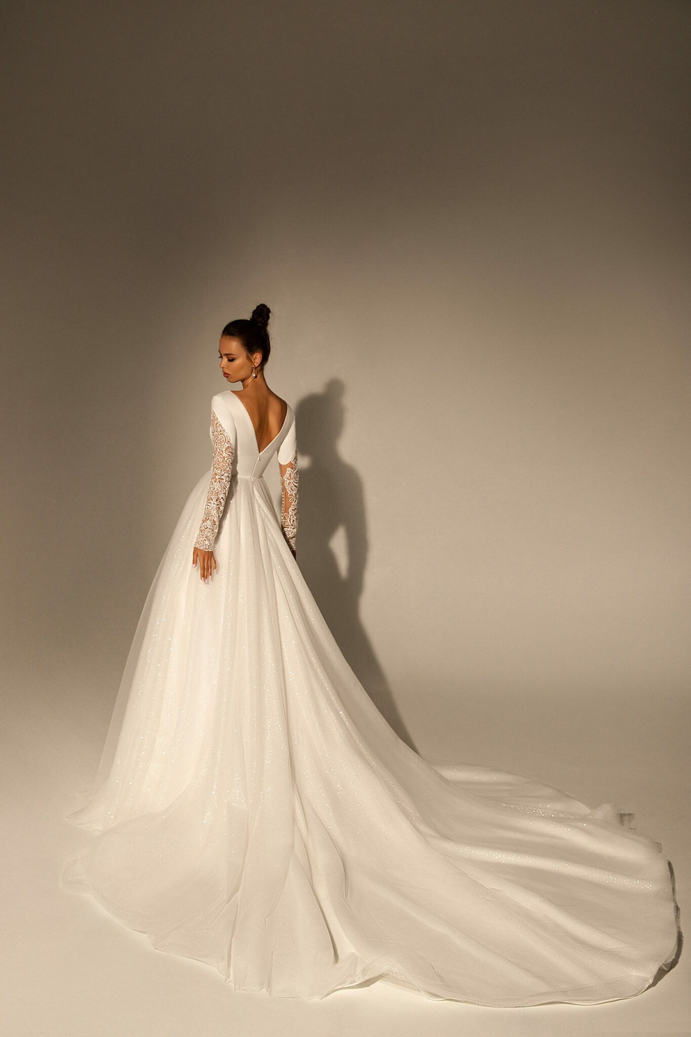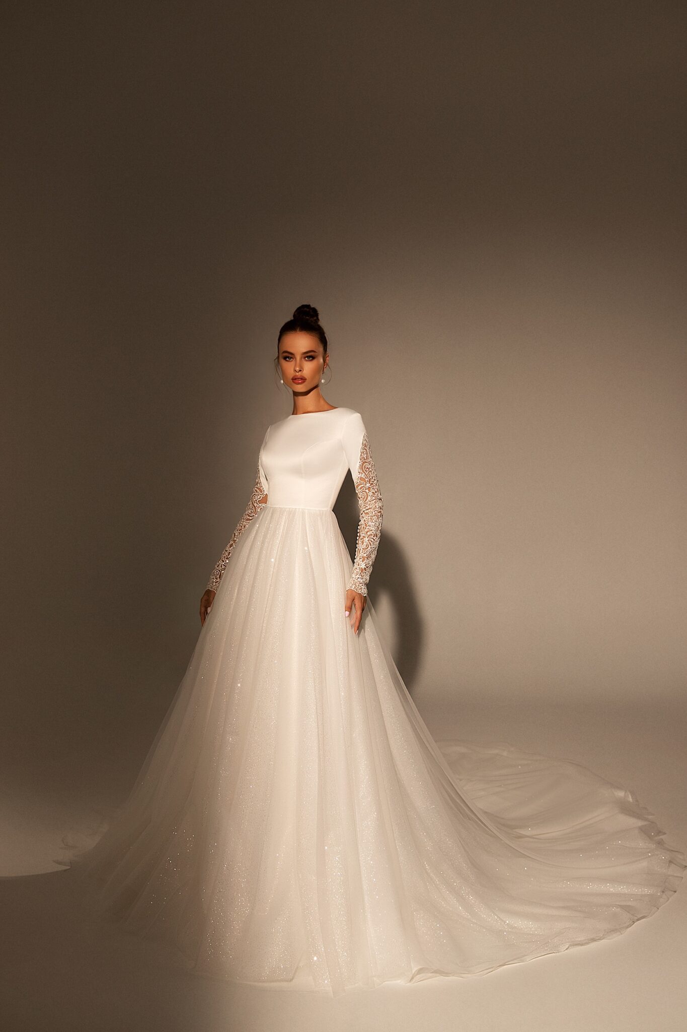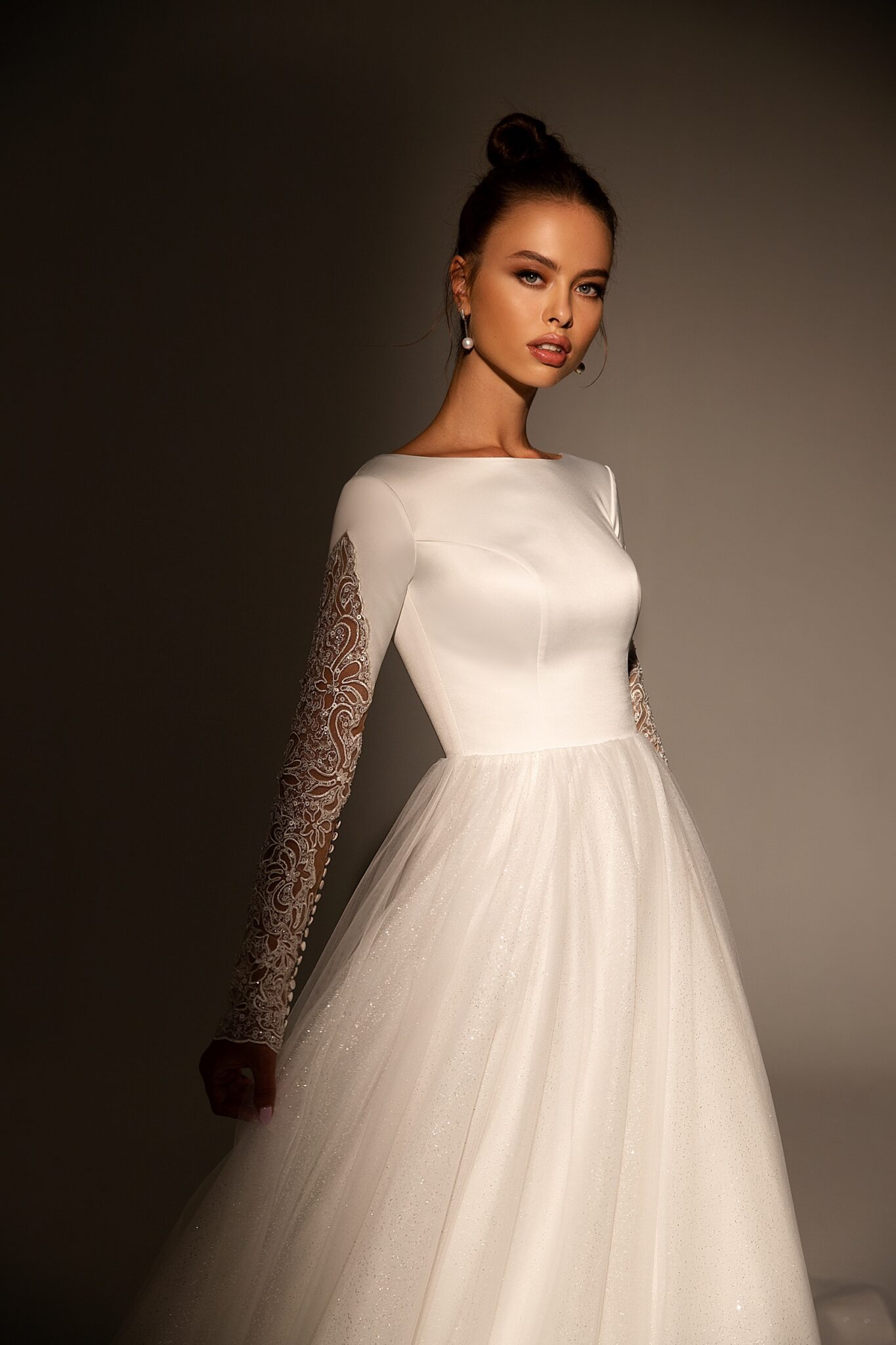 Весільна сукня Annanelle – це поєднання різних елементів. Саме плаття виконано з блискучого атласу. Тулуб прикрашений горловиною у вигляді ромба. Довгі рукава виконані з прозорої тканини з квітковим візерунком. Вони також прикрашені вишивкою з мережива, яке прикрашене намистинами. Краї рукавів також прикрашені намистинами. Спідниця переходить у довгий шлейф.