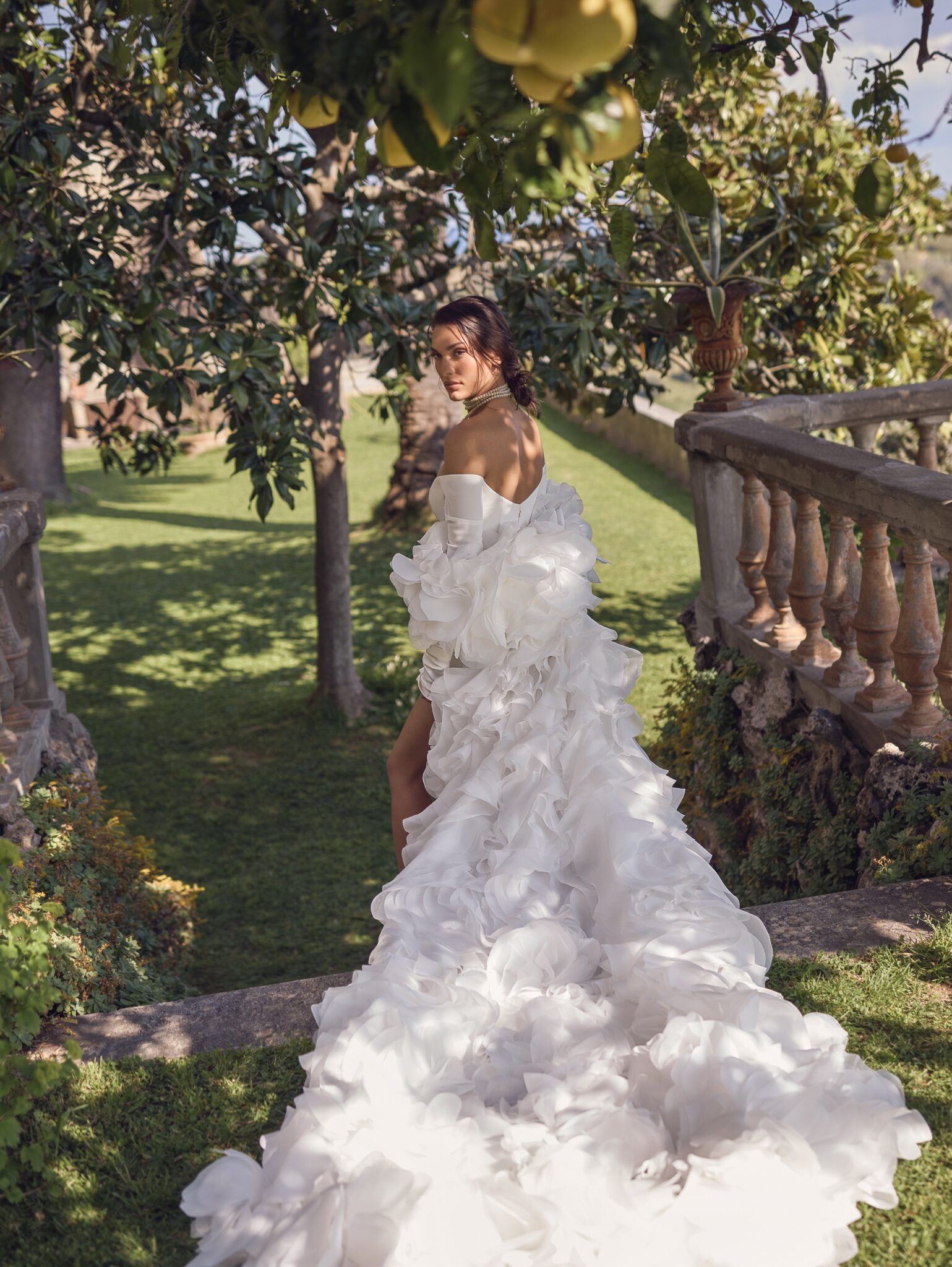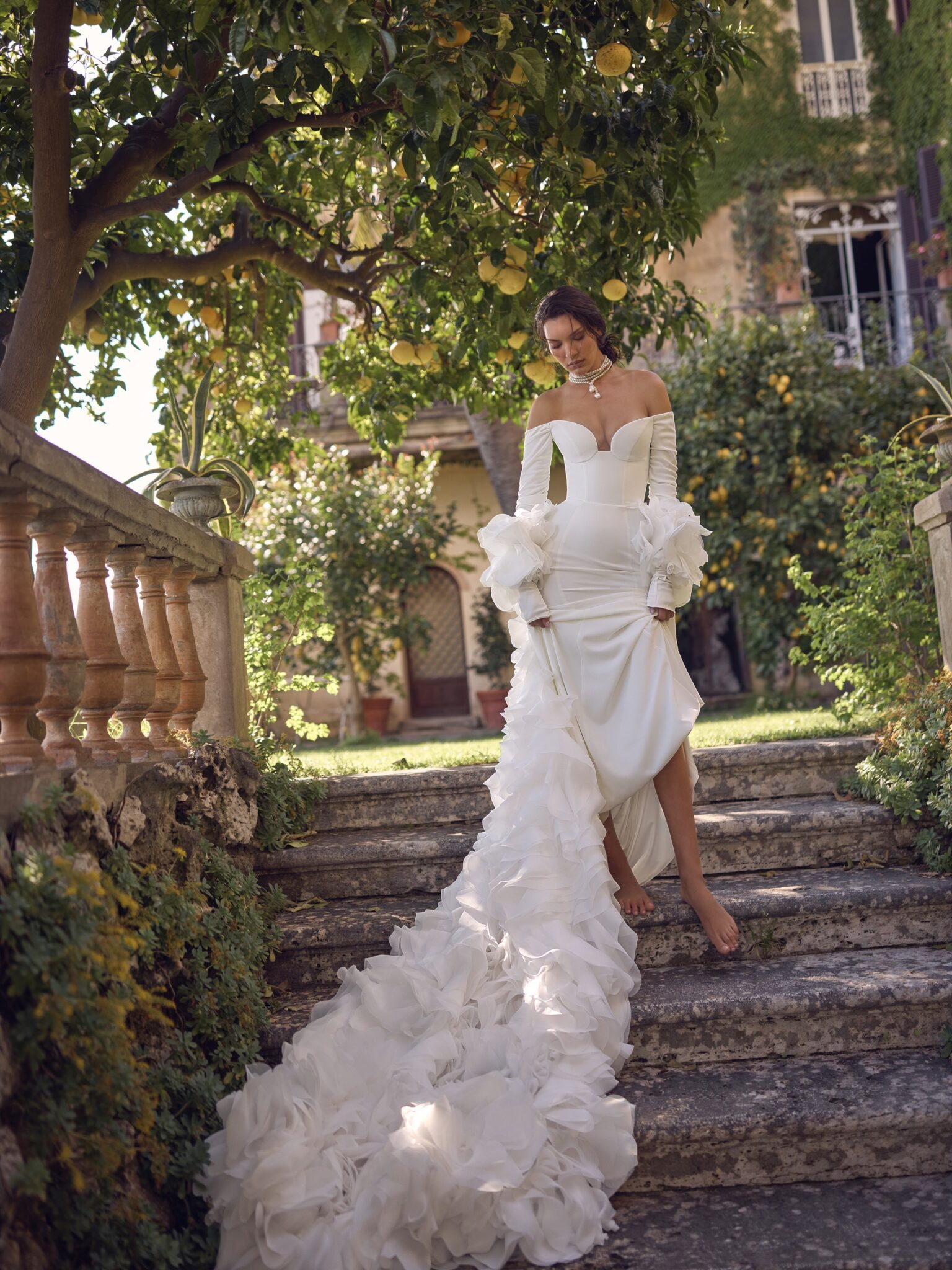 Сукня Arcadia – це чарівне поєднання мінімалізму та романтики, виготовлене зі структурованої костюмної тканини, що гарно моделює силует. Дизайн сукні з відкритими плечима та вирізом у формі серця випромінює сучасну вишуканість, а зйомна накидка з органзи, прикрашена об’ємними квітами ручної роботи, додає драматизму. Кожна квіткова деталь ретельно виготовлена вручну, що робить цю сукню справжнім шедевром високої моди. Ідеальний вибір для наречених, які прагнуть поєднати елегантність та неземну красу.