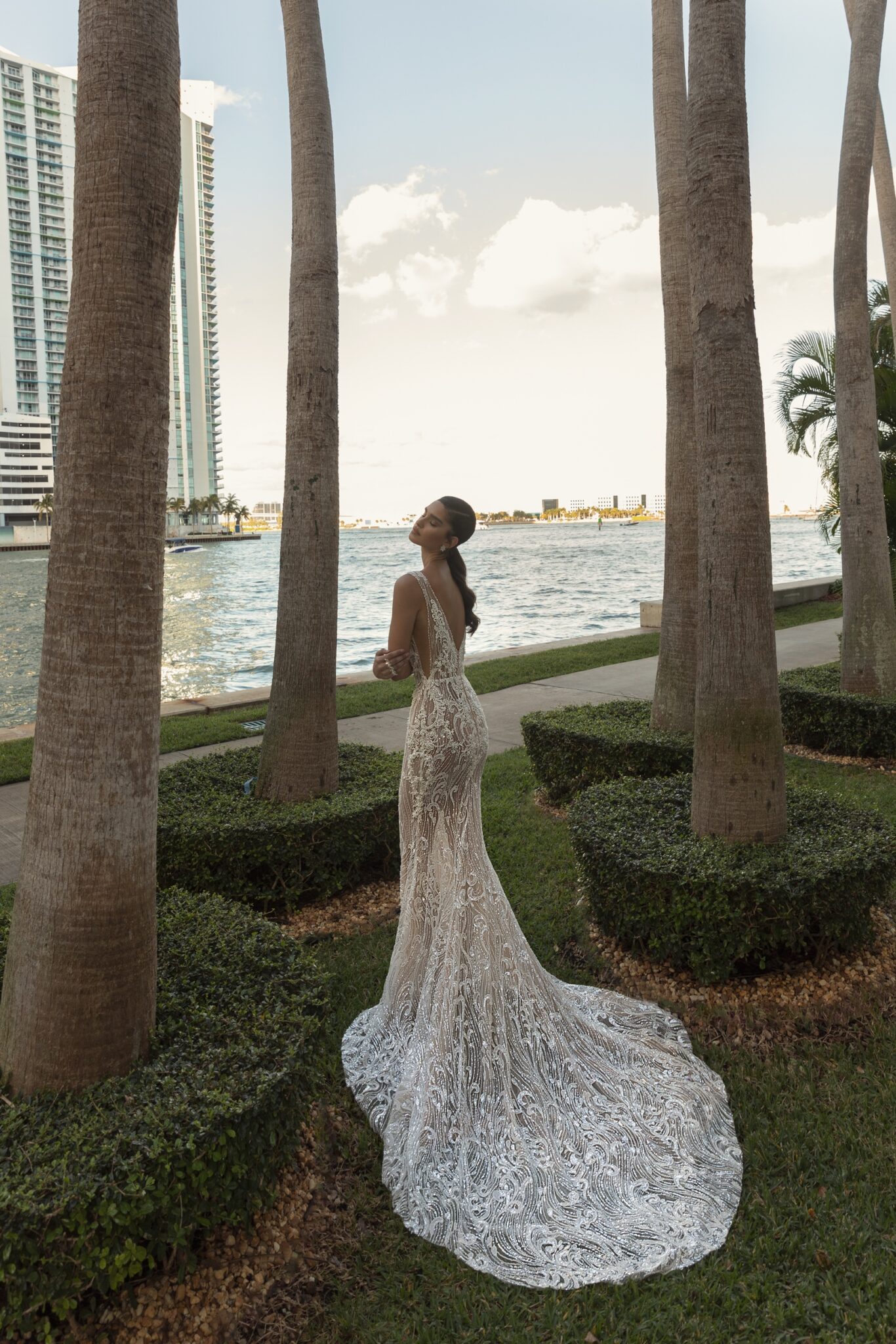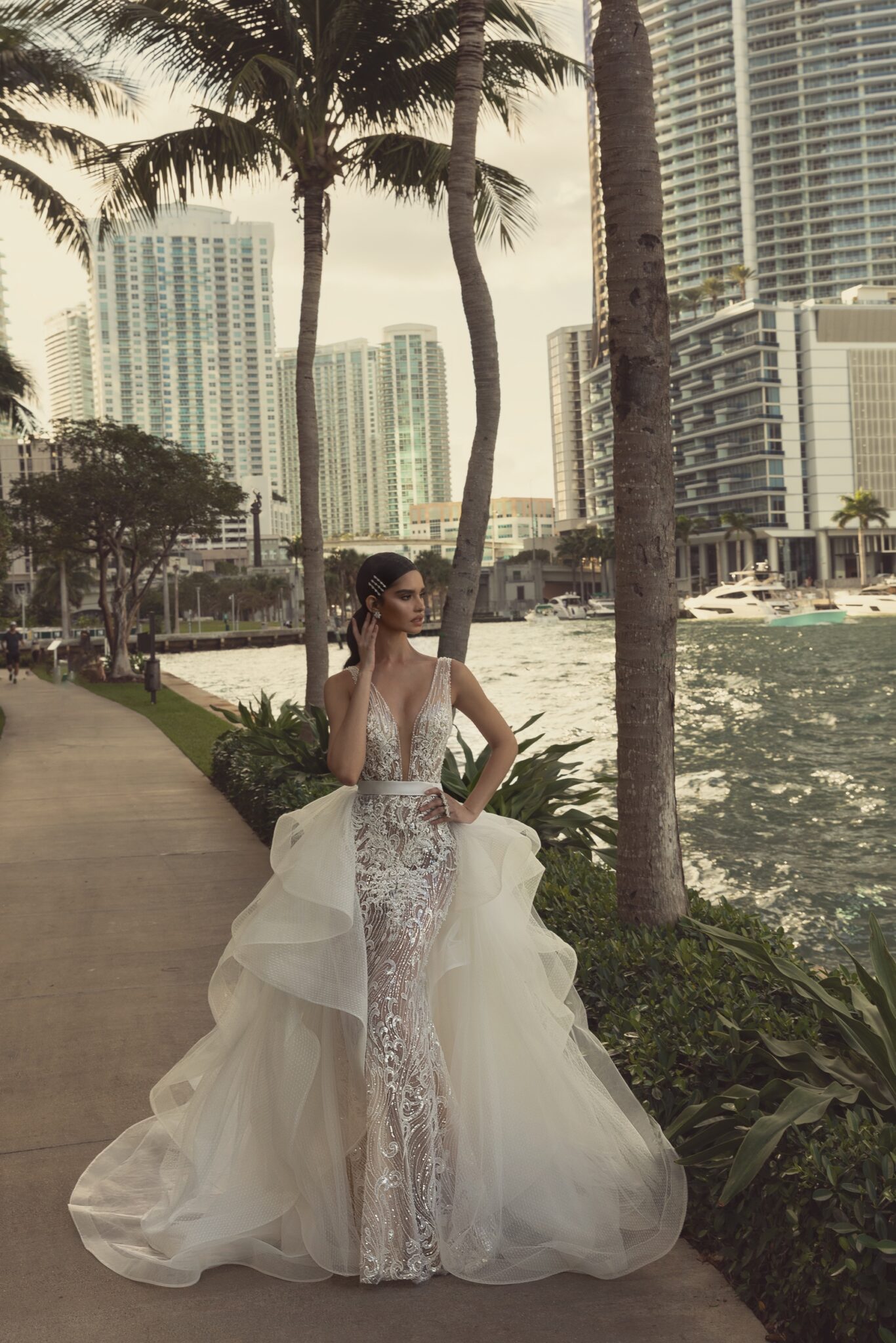 Весільне плаття у стилі “рибка” зі спідницею-фатіном. Воно виготовлене з мережива з квітковим орнаментом і повністю вишите намистинами та пайєтками. Маленькі розширені квіти додають урочистості. Глибокий V-подібний виріз і вирізи під пахвами виглядають спокусливо. Є довгий шлейф і чудова додаткова спідниця. Ця спідниця виготовлена з вишуканої прозорої тканини з малими крапками, які утворюють розширені хвилі.