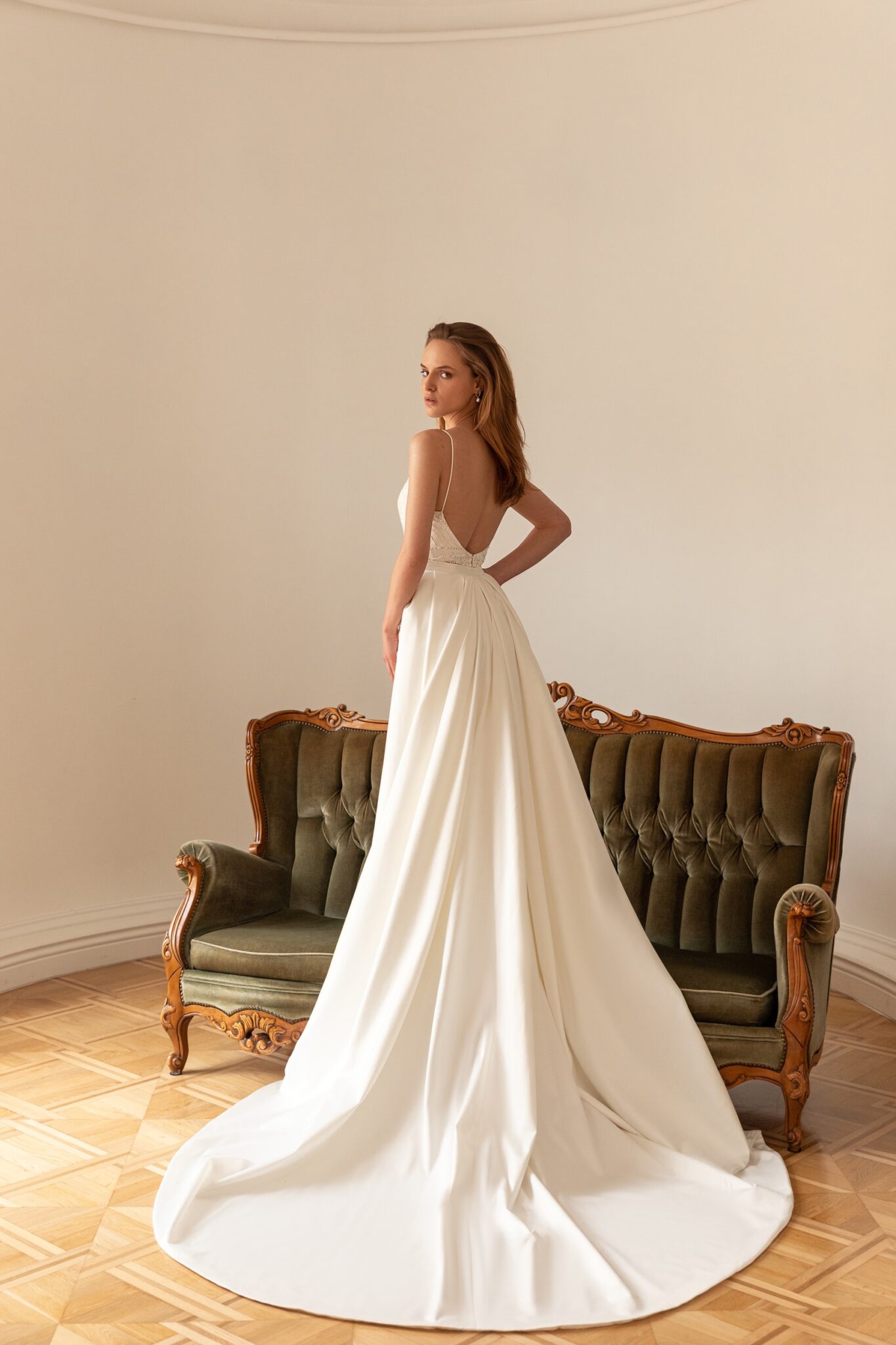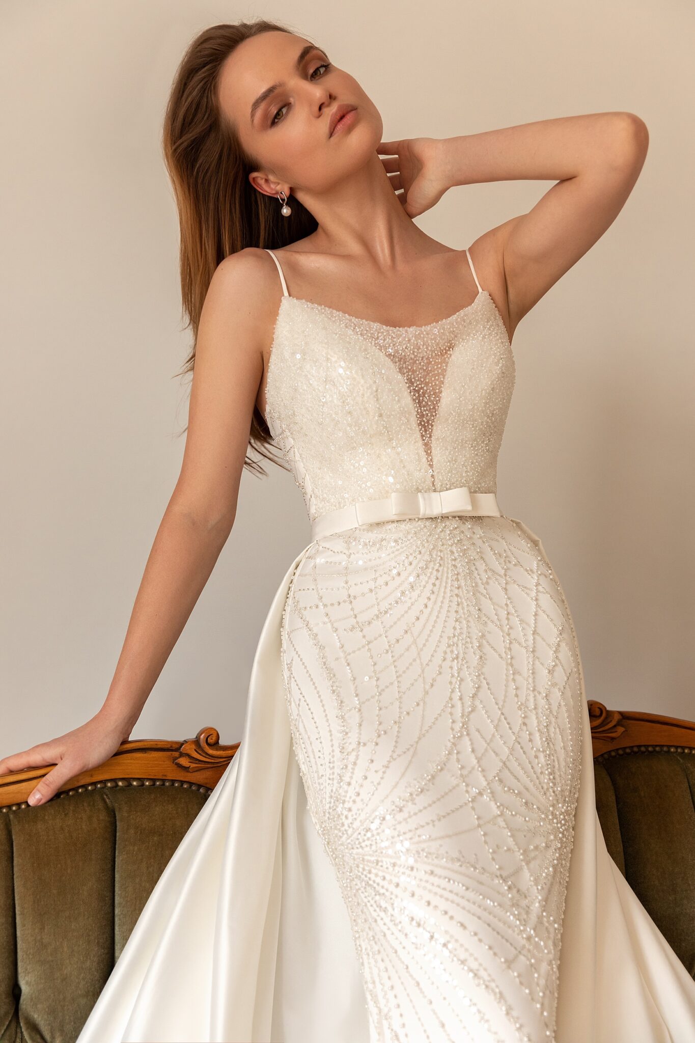 Ayla – чудова сукня в стилі “рибка”. Ця облягаюча сукня вкрита вишуканим мереживом з намистинами та штучними перлами. Верх сукні має форму серця та прикрашений прозорими деталями мережива посередині, що прикріплені до тонких ремінців. Накидка зроблена з атласу і може бути відстібнута. Спідниця переходить у величезний довгий шлейф і прикрашена невеличким бантом на талії.