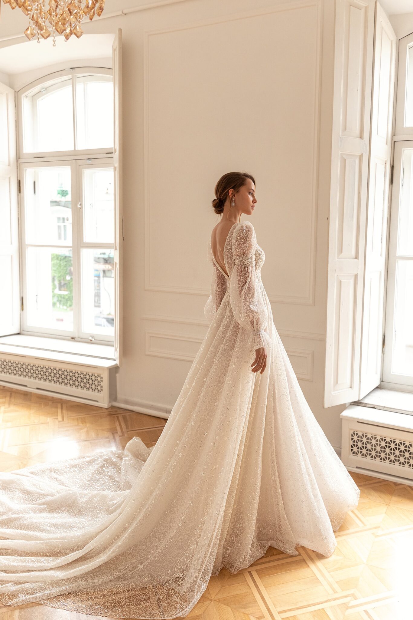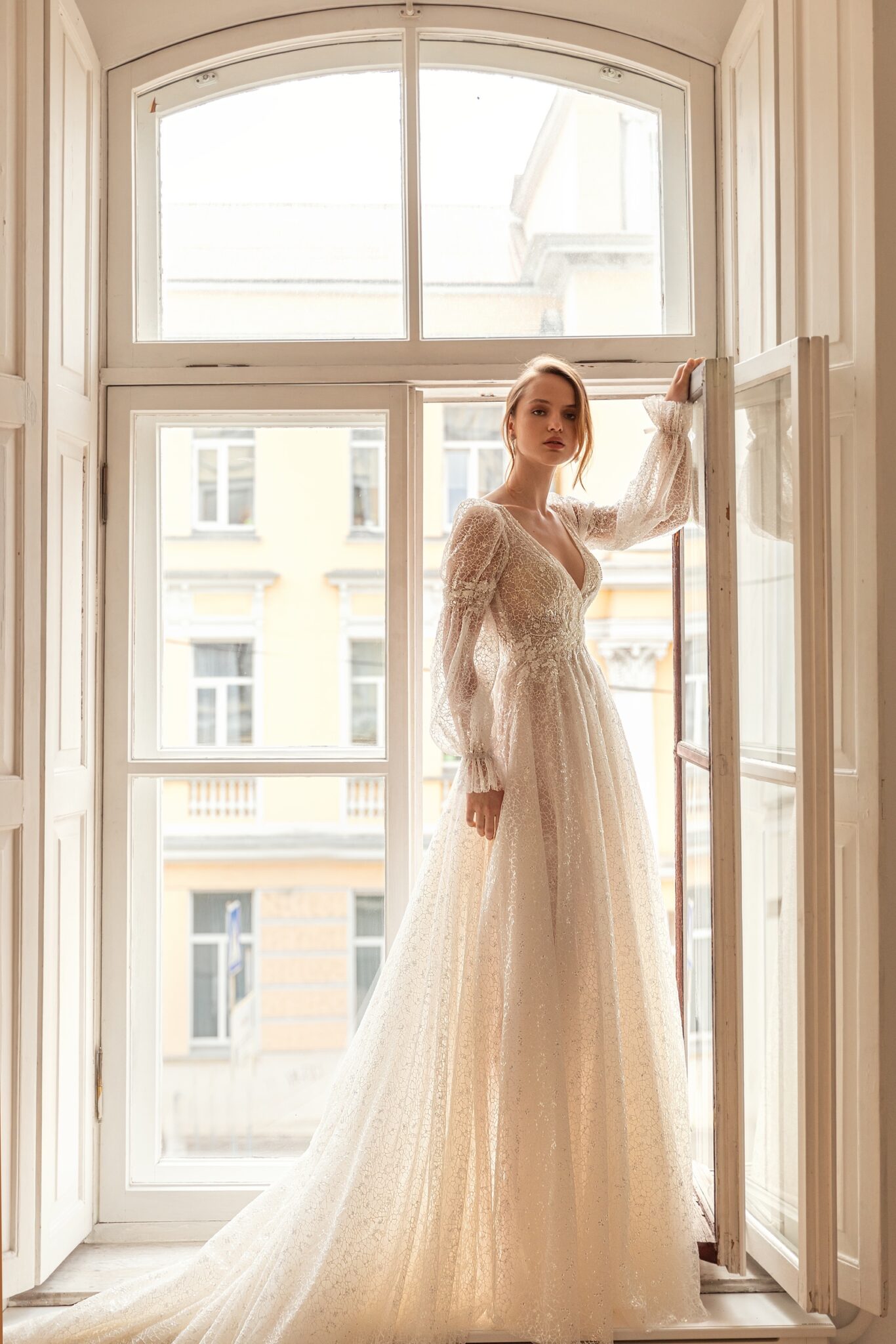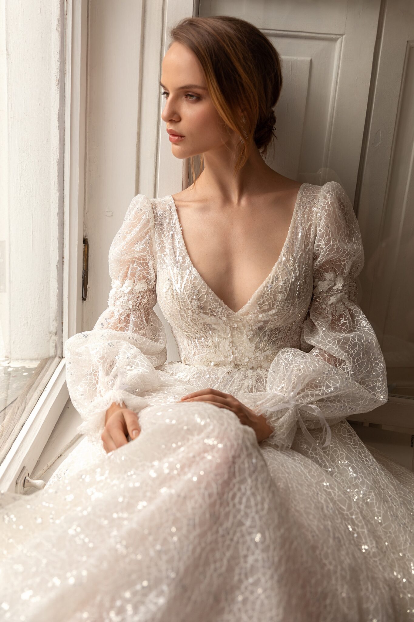 Bliss – цілком блискуча весільна сукня. Сукня-футляр А-силуету виконана з сяючого мережива з візерунком-павутинкою. Сукня прикрашена глибоким V-подібним вирізом і довгими рукавами з тієї ж тканини. Лінія талії, а також вільні рукави прикрашені квітковим мереживом, намистинами та кристалами. Фантастична спідниця А-силуету переходить у чудовий довгий шлейф.
