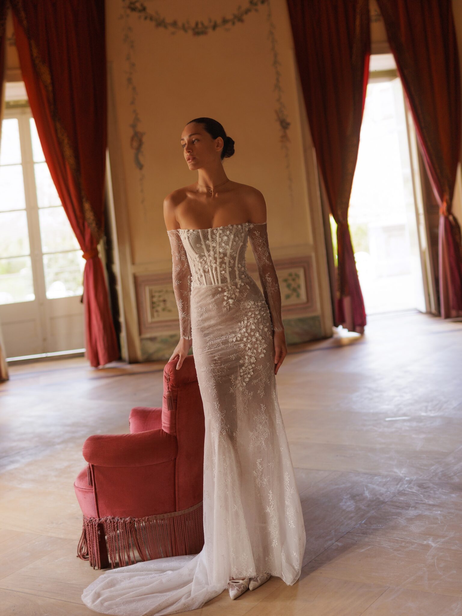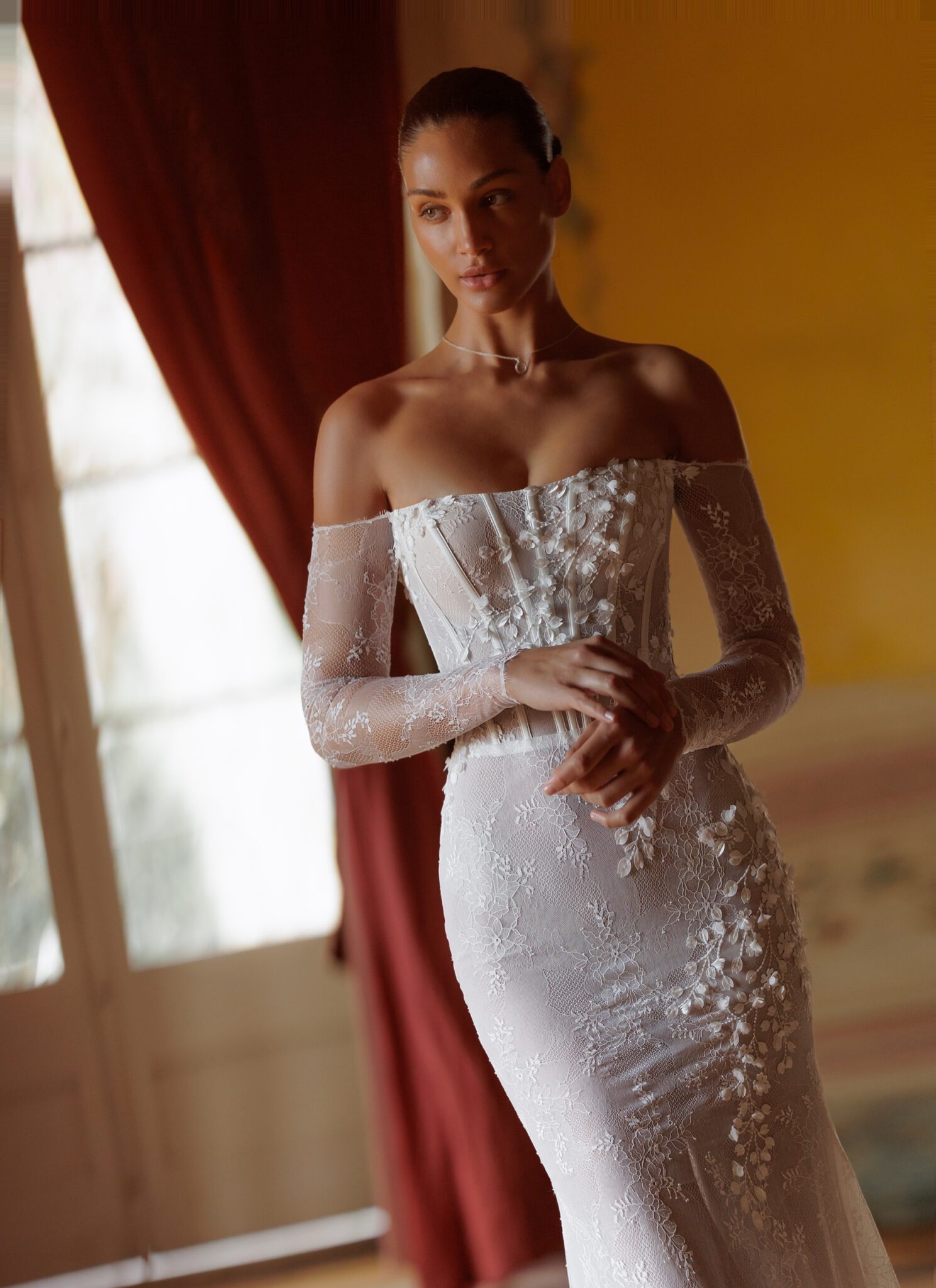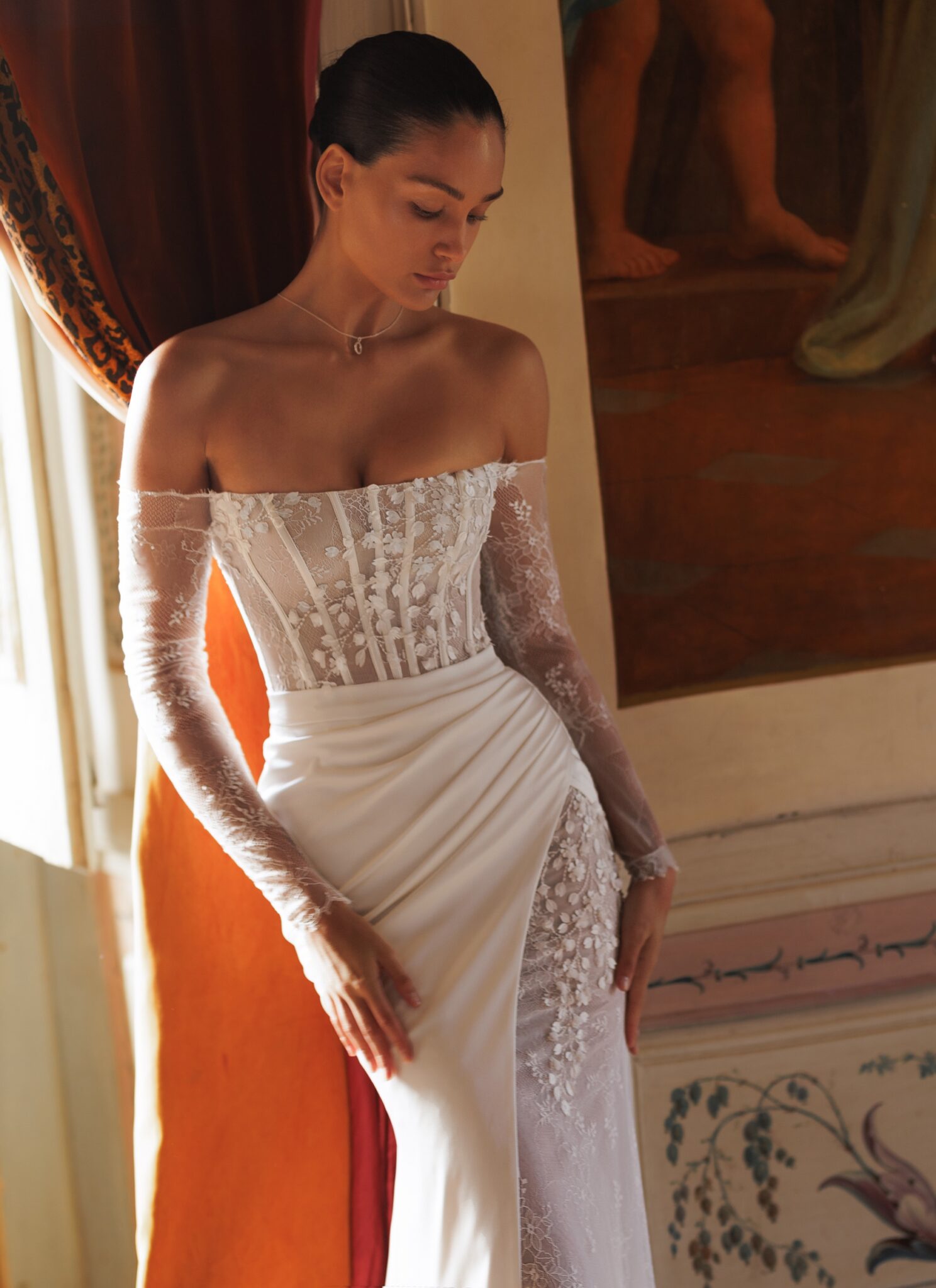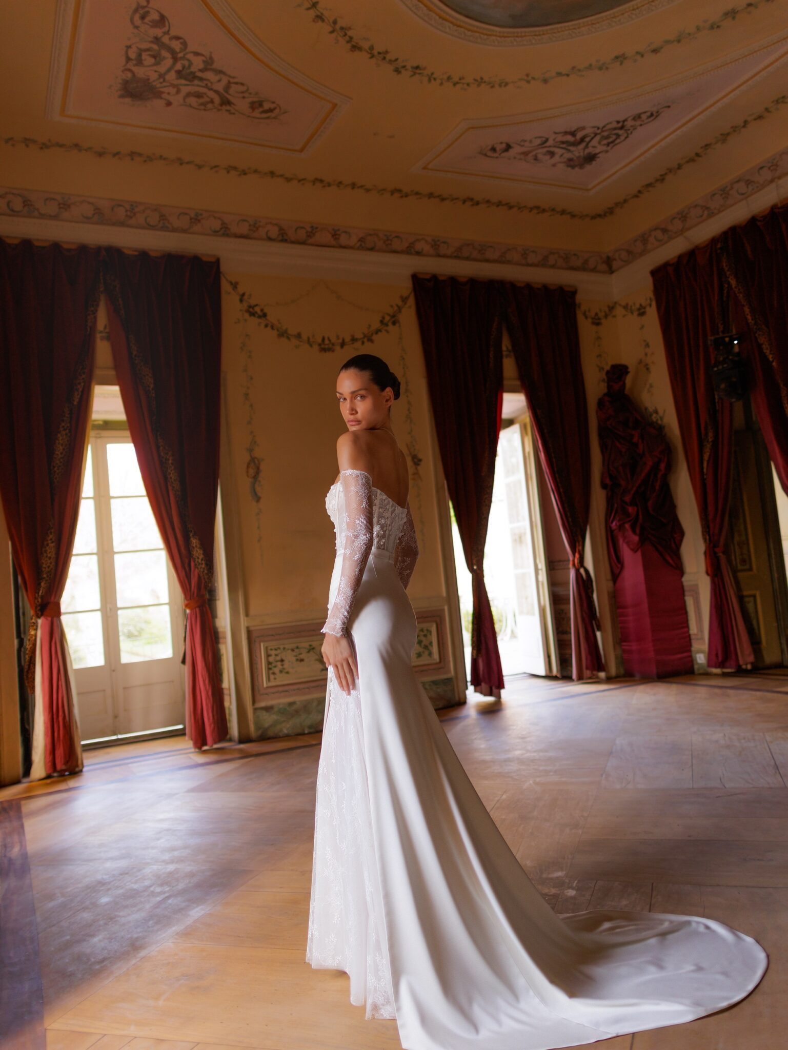 Створена з ніжного мережива шантільї, сукня щедро оздоблена об’ємними 3D-аплікаціями, що створюють романтичну та художню текстуру. Розташування мережива на корсеті навмисно асиметричне, що додає сучасної нотки до вічного дизайну.