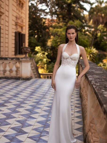 Елегантна весільна сукня, яка ідеально підійде для помпезного образу нареченої. Сукня повністю виготовена з сяючого атласу, що облягає тіло, підкреслюючи фігуру нареченої. Корсет без бретелей з фальбаною підкреслює декольте, а спідниця-олівець переходить у делікатний шлейф. Ефектні об’ємні прозорі рукави-ліхтарики, прикрашені атласними ґудзиками, легко знімаються. Доповнена накидкою, сукня отримує додатковий об’єм та закінчується чудовим шлейфом акуратної довжини.