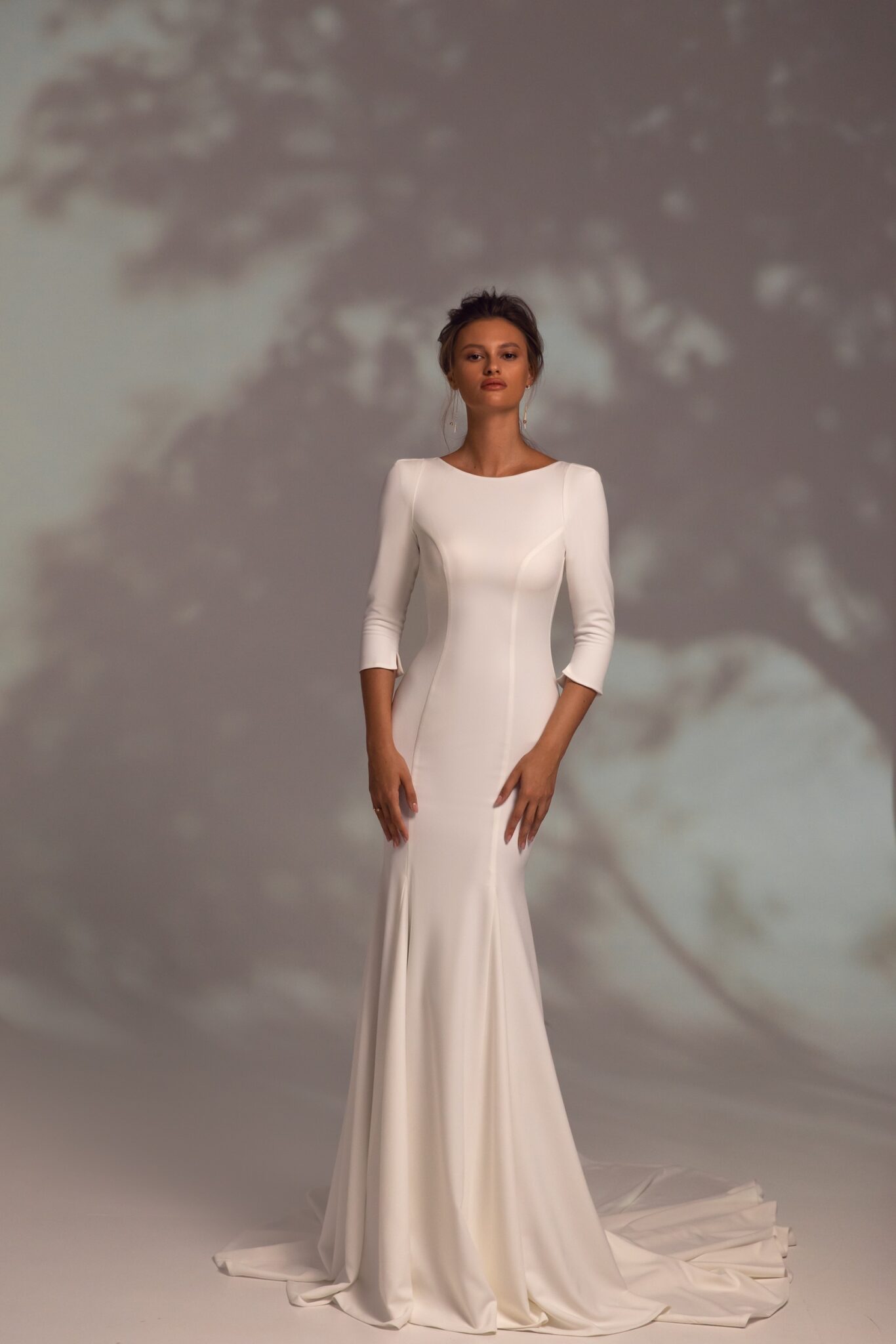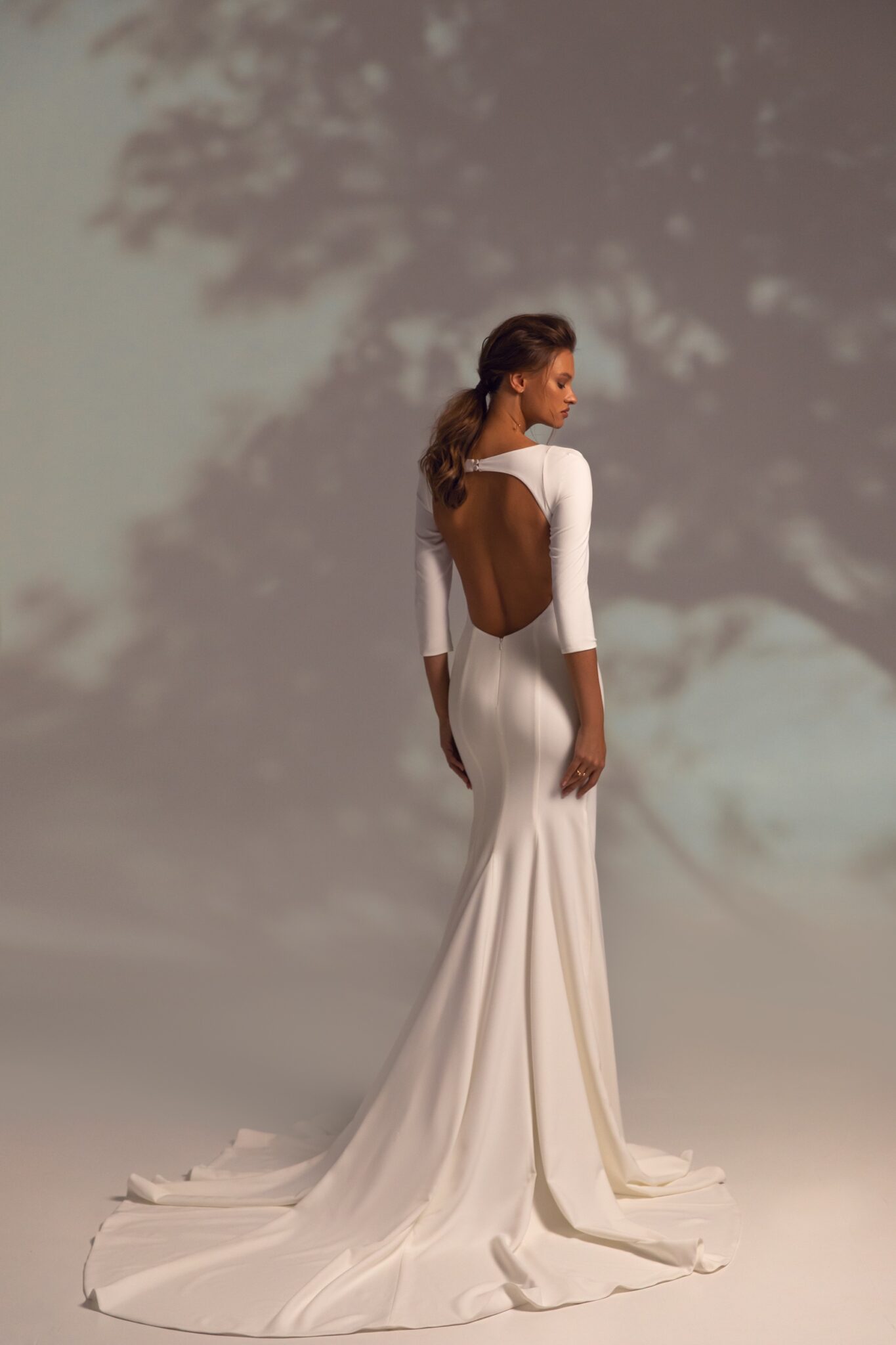 Стримана та розкішна весільна сукня з відкритою спиною. Високий виріз-човник прикрашений наплечниками і довгими рукавами до ліктя. Виріз на спині переходить в спідницю-рибку з крепової тканини. Гарний шлейф додає розкоші.