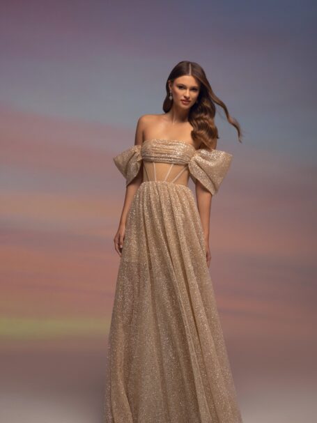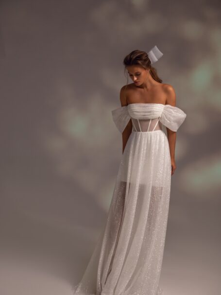 Ця чудова весільна сукня – справжній шедевр весільної моди. Уважно пророблені деталі надають нареченій неповторного образу. Вона підкреслить її природну красу та грацію, даруючи впевненість у цей особливий день. Елегантність, розкіш і вишуканість – це основні риси цієї чарівної сукні.