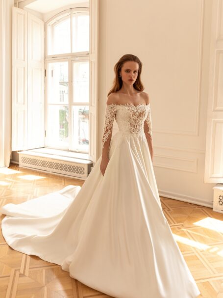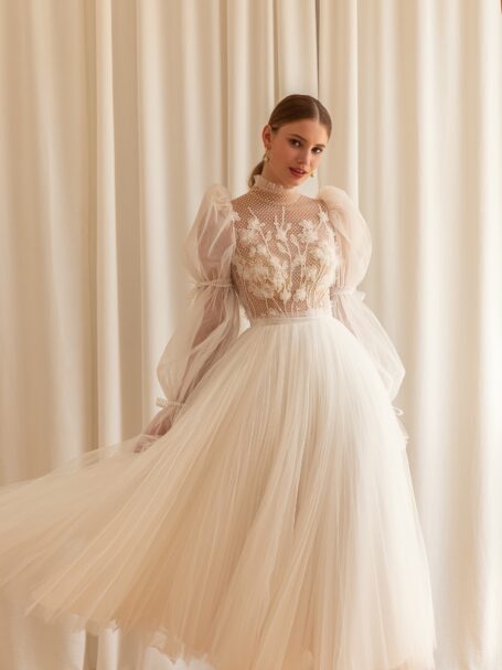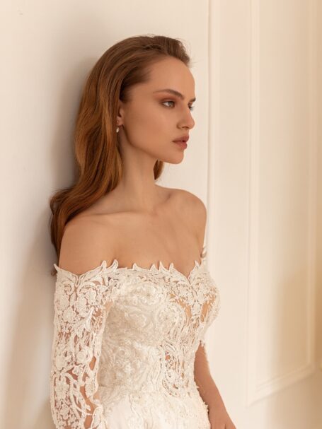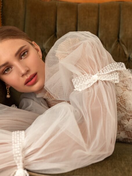 Desiree — фантастична весільна сукня-трансформер. Основна сукня-футляр виконана з вишитого мережива, прикрашеного бісером та паєтками, що створюють візерунок-павутинку. Сукня має глибокий V-подібний виріз, довгі рукави та наплічники. Неймовірна атласна верхня спідниця знімається і застібається на талії, прикрашена бантом спереду. Верхня спідниця переходить в довгий шлейф.