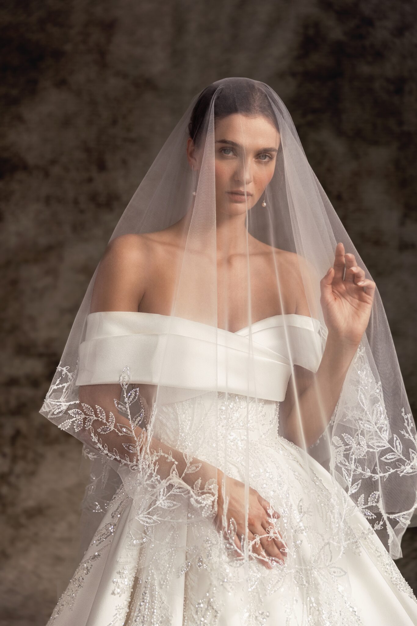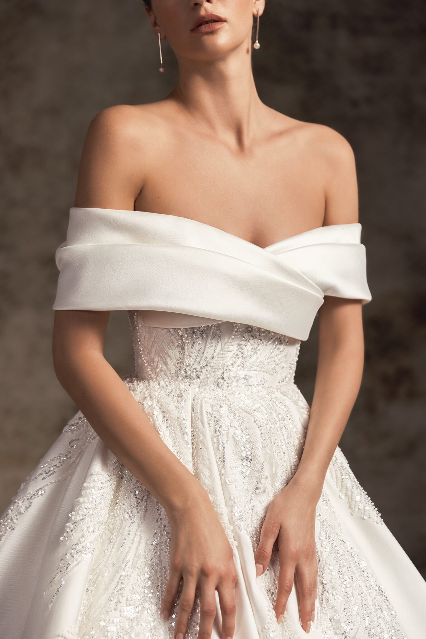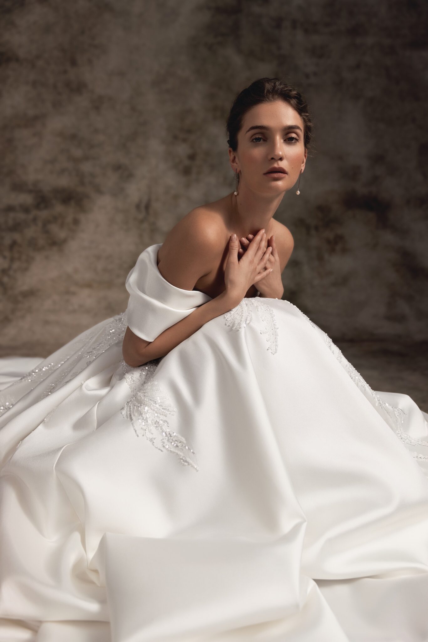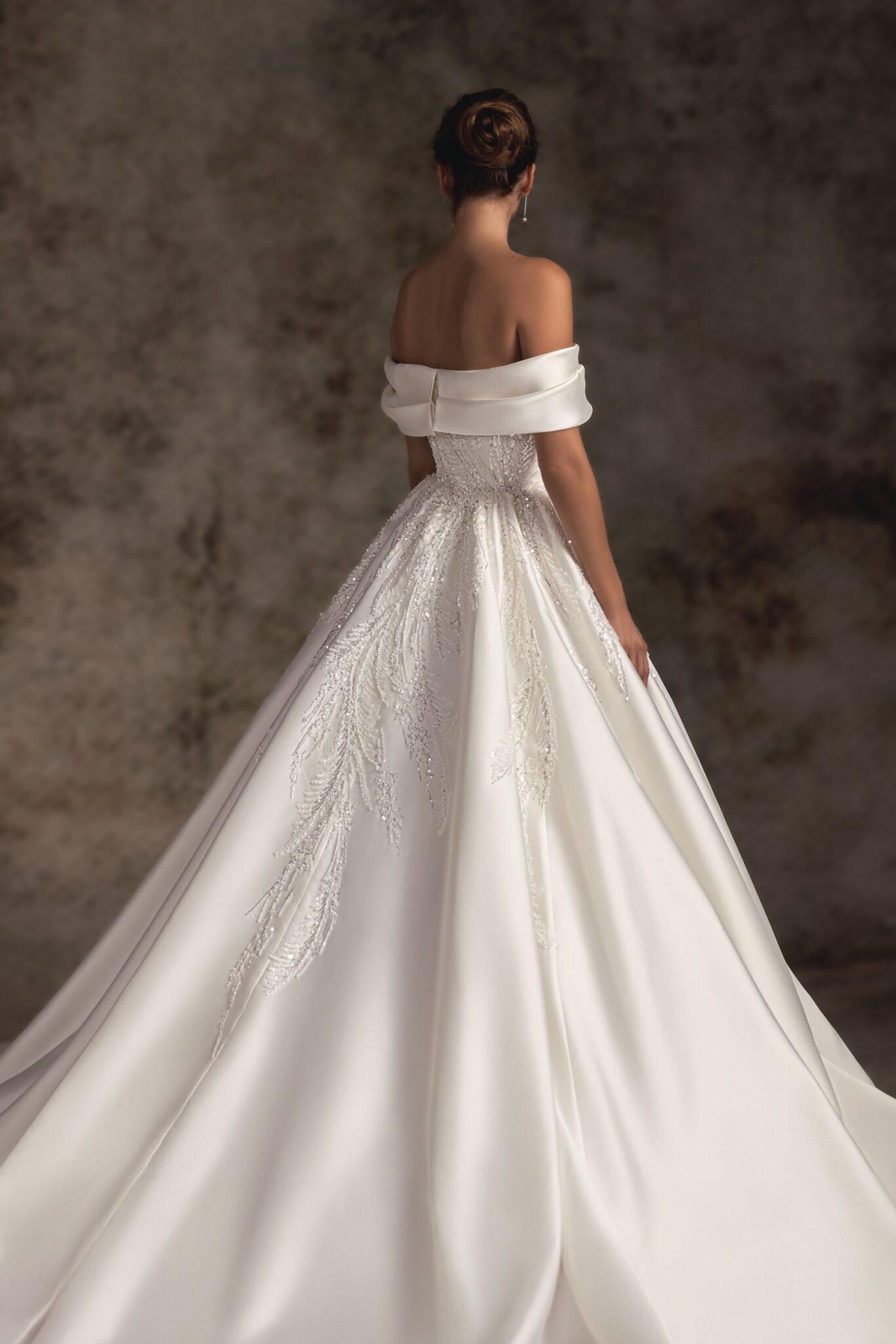 Ця бальна сукня зі стильного атласу прикрашена ніжною ручною вишивкою та має чарівний виріз на плечі, який переходить на спину з двома м’якими складками. Витончений облігаючий корсет переходить у величезну повну спідницю з атласу, завершену шлейфом у формі кінчика.