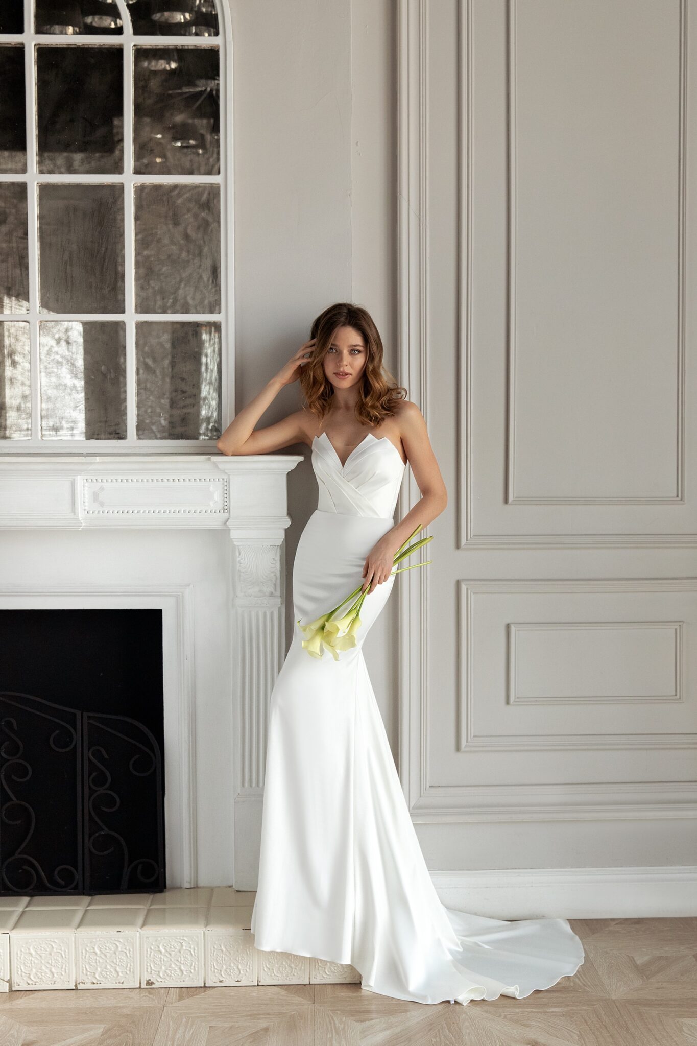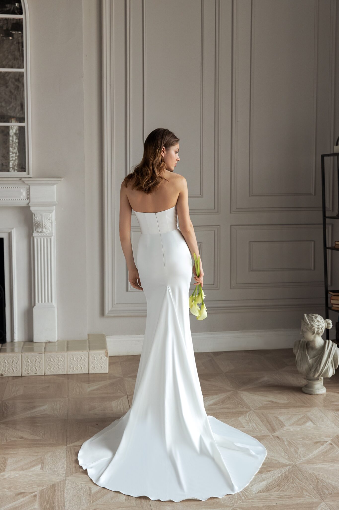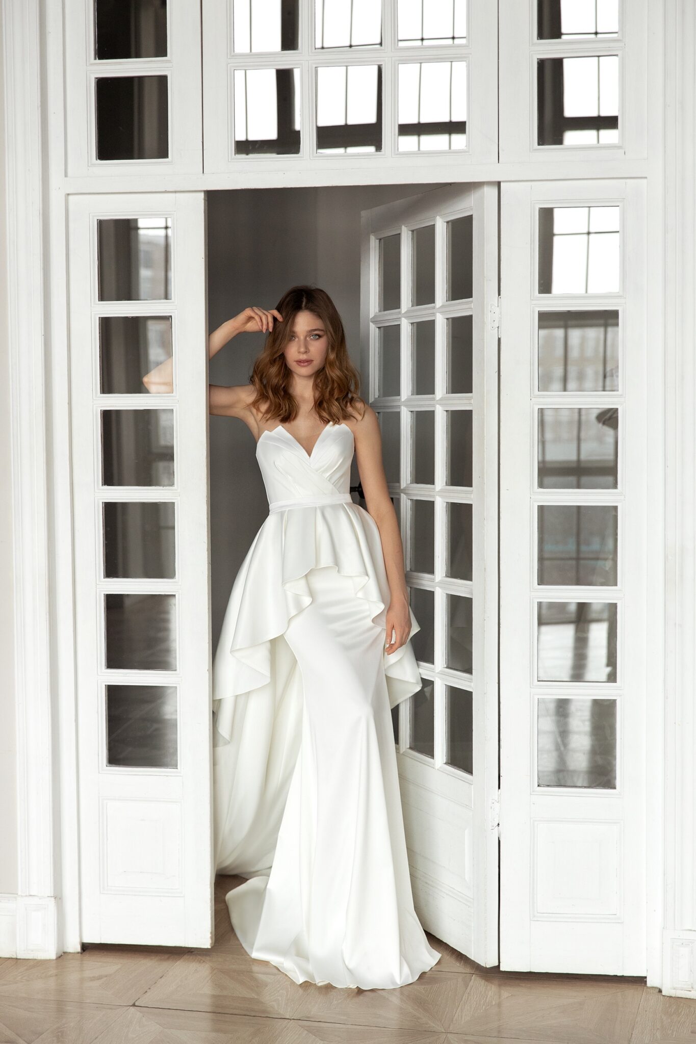Весільна сукня “Edit” виготовлена зі сяючого атласу та прикрашена асиметричними елементами. Сукня з силуетом русалки прикрашена цікавим декольте. Знижена лінія корсету робить видимою спину нареченої. Є додаткова спідниця з асиметричною передньою частиною та довгою шлейфом. Цей елемент закріплений на талії та створює цікавий силует.