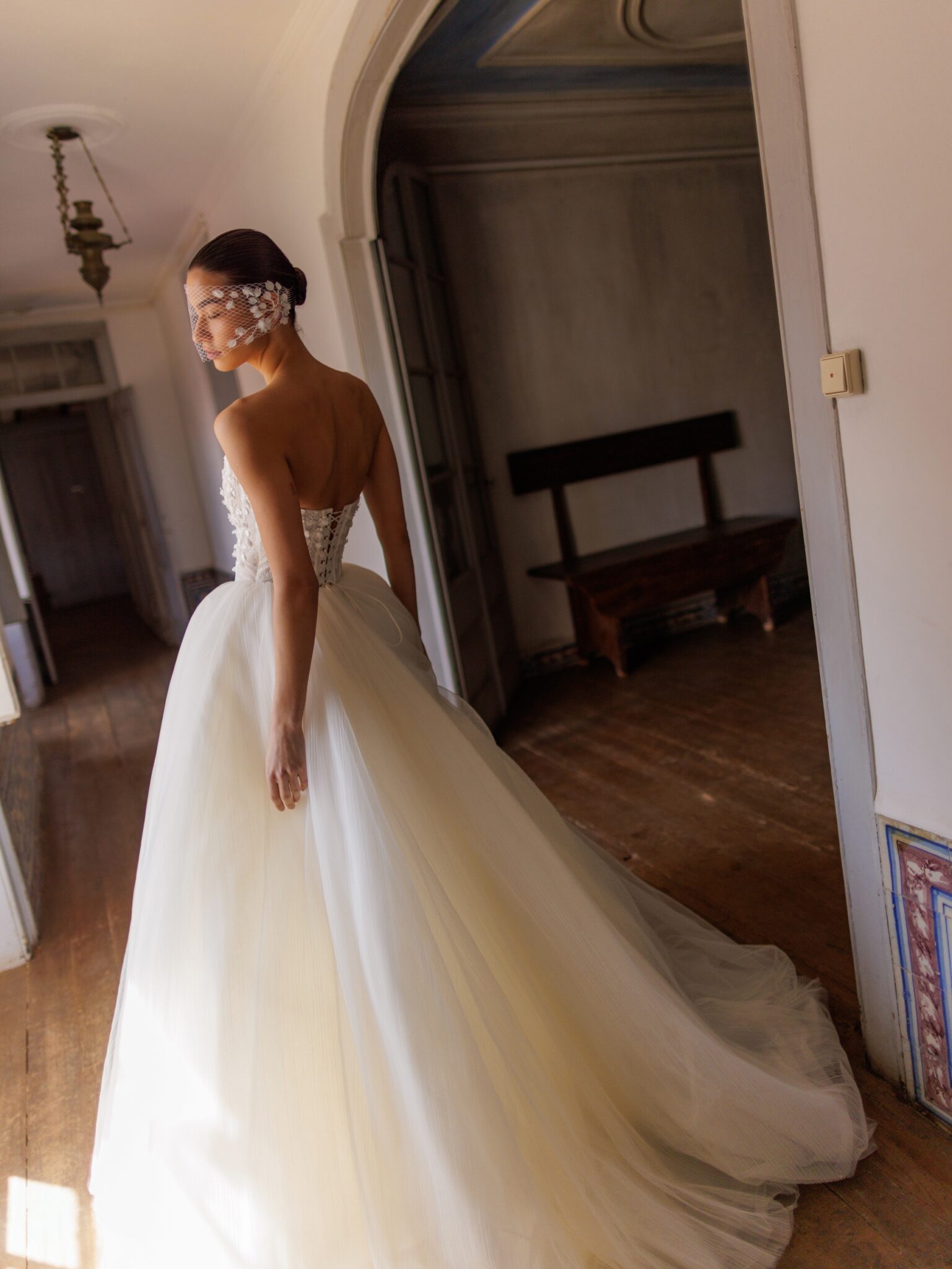 Об’ємна фатинова спідниця доповнена шарами кремової сітки, що додає силуету глибини та легкості. Сукня без шлейфу, що робить її одночасно елегантною та практичною для легкого руху.