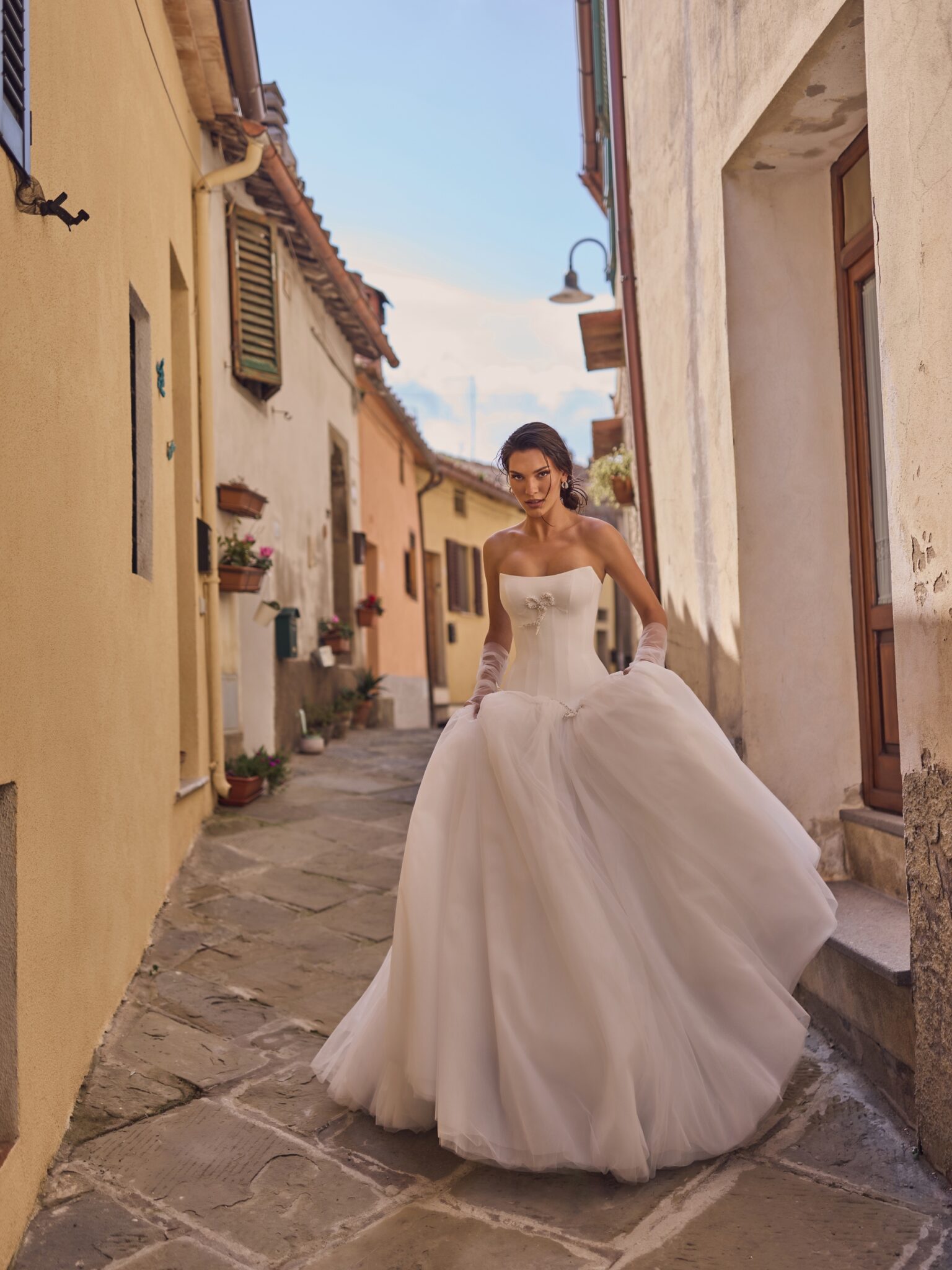 Спідниця виготовлена з декількох шарів м’якого фатину, що створює легкий ефект плавання при кожному русі. Вбудована підкладка забезпечує повну непрозорість та комфорт протягом усього дня. Ідеально підходить для наречених, які прагнуть елегантності з відтінком сучасної фантазії.