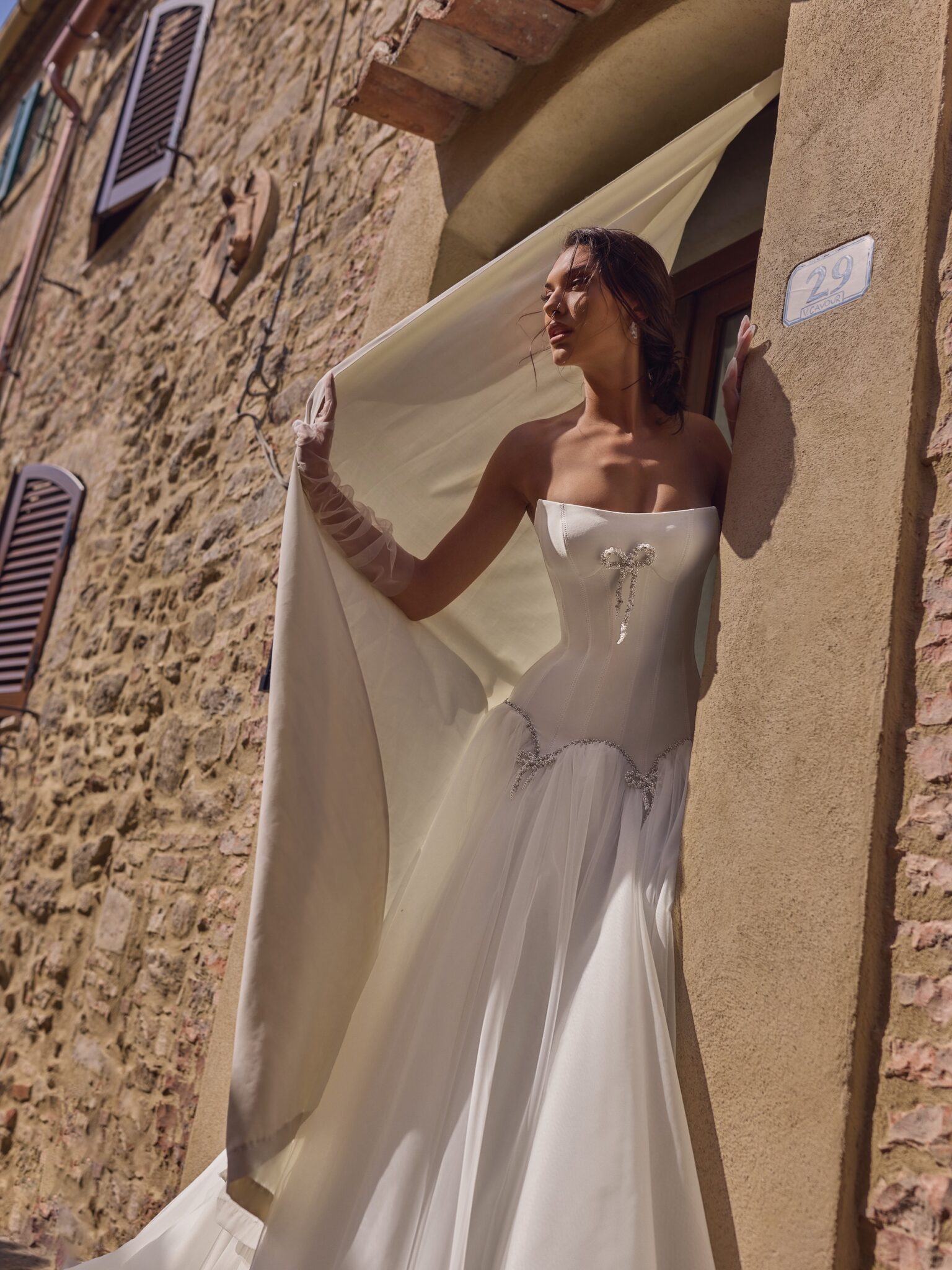 Внутрішній корсет зашнуровується для ідеальної посадки, а сама сукня застібається на потаємну блискавку ззаду. Прозорі, легкі рукавички, що додають сукні делікатності та витонченості, входять до комплекту. Посередині корсету розміщений бант, прикрашений перлинами, а передній та задній шлейфи корсету оздоблені вигадливими деталями з перлів та кришталю.