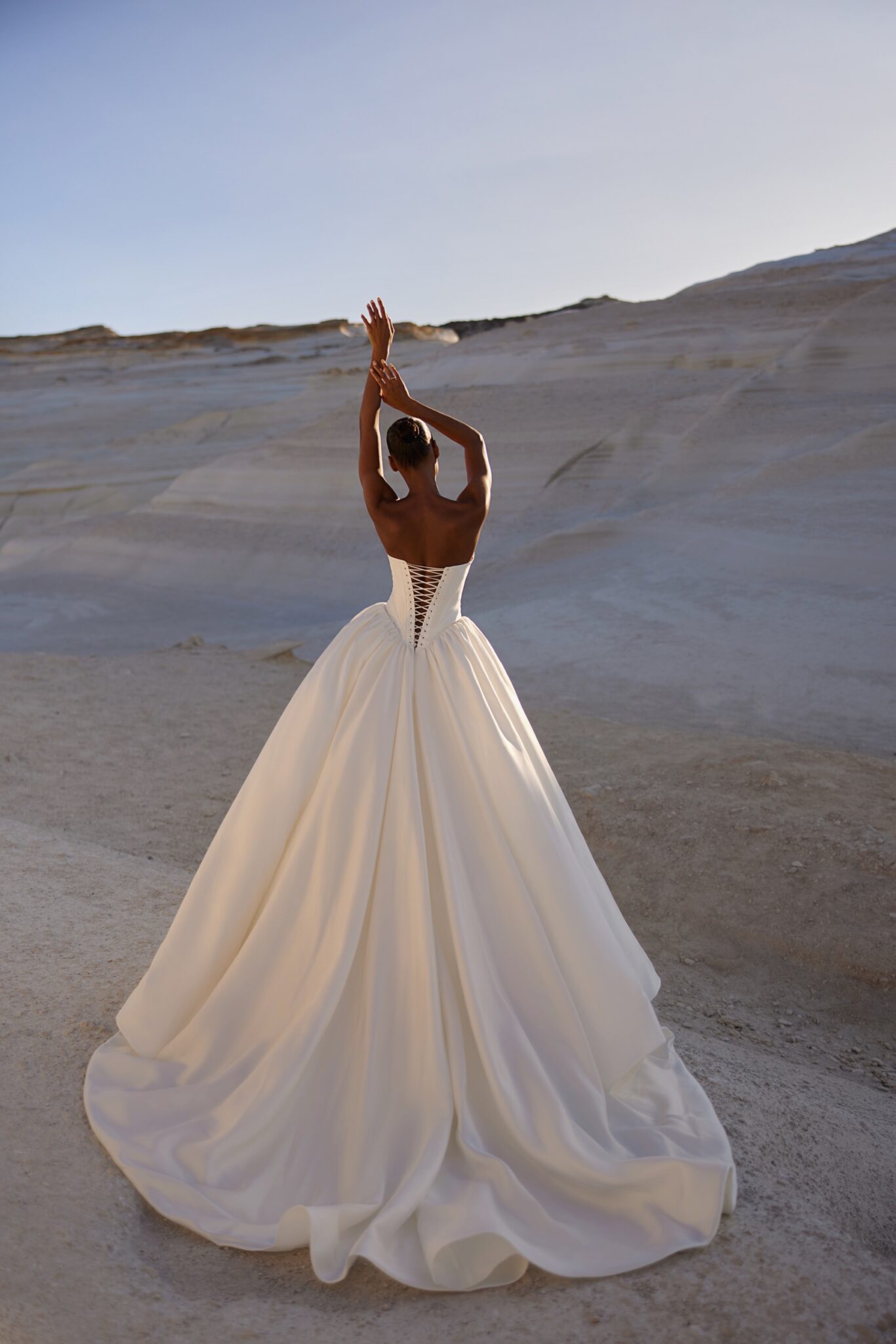 Сукня принцеси з яскравими деталями. Об’ємний бант, що формує лінію плечей і створює об’єм у верхній частині сукні, врівноважується простим жорстким корсетом і заправленою пишною спідницею, що вільно спускається до підлоги.