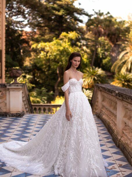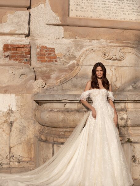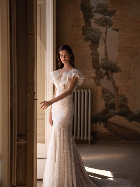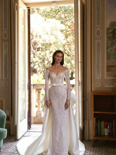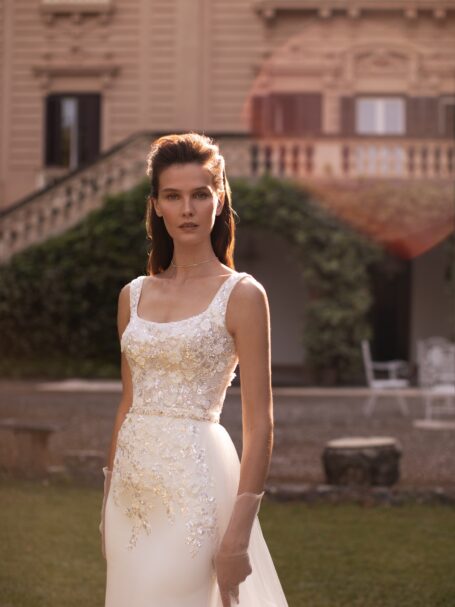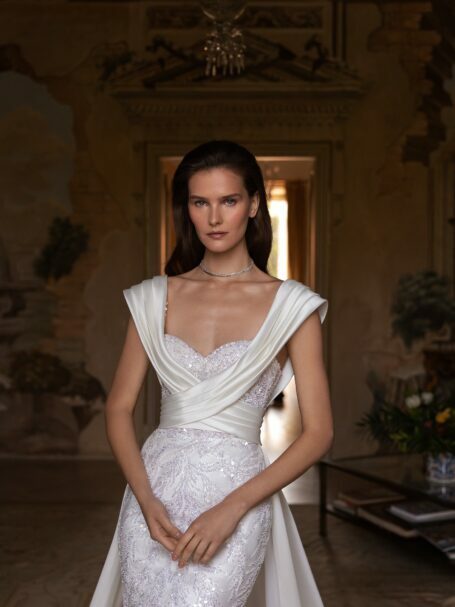 Ця вишукана сукня в стилі русалка з сатинового матеріалу має великі аплікації симетричних квітів з мережива на вирізі з ніжно опущеними ремінцями. Облягаюча спідниця з драпуванням стає ширшою від колін та може доповнюватись об’ємною додатковою сатиновою спідницею з шлейфом у вигляді острівця.