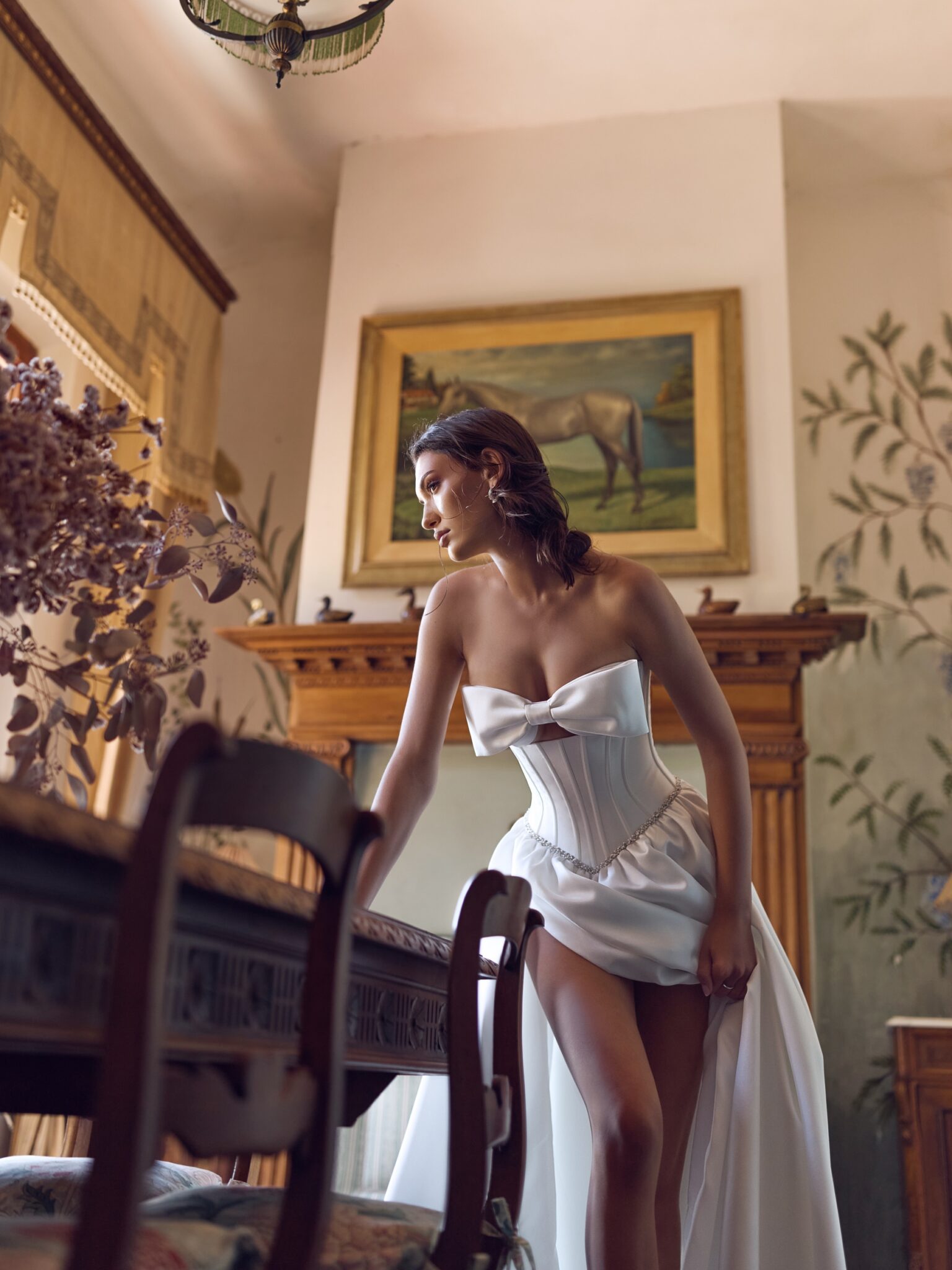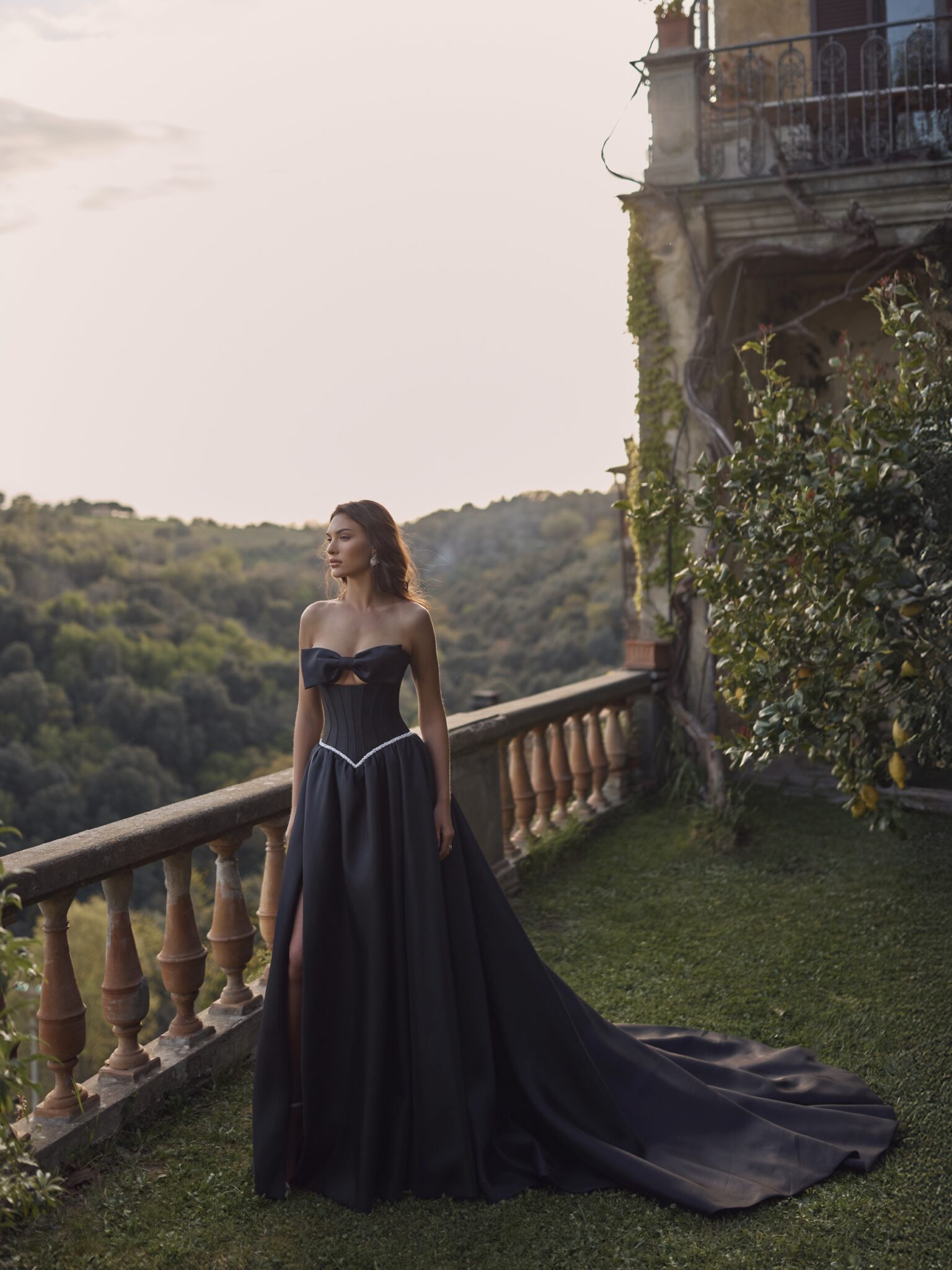 Корсетний ліф зашнуровується ззаду для ідеальної, регульованої посадки, а талія красиво підкреслена блискучим кришталевим поясом. Декольте залишено чистим і сміливим – ніякої ілюзорної сітки, лише скульптурні чашечки, делікатно прикрашені чарівним бантиком, створюючи м’який і романтичний фокус.