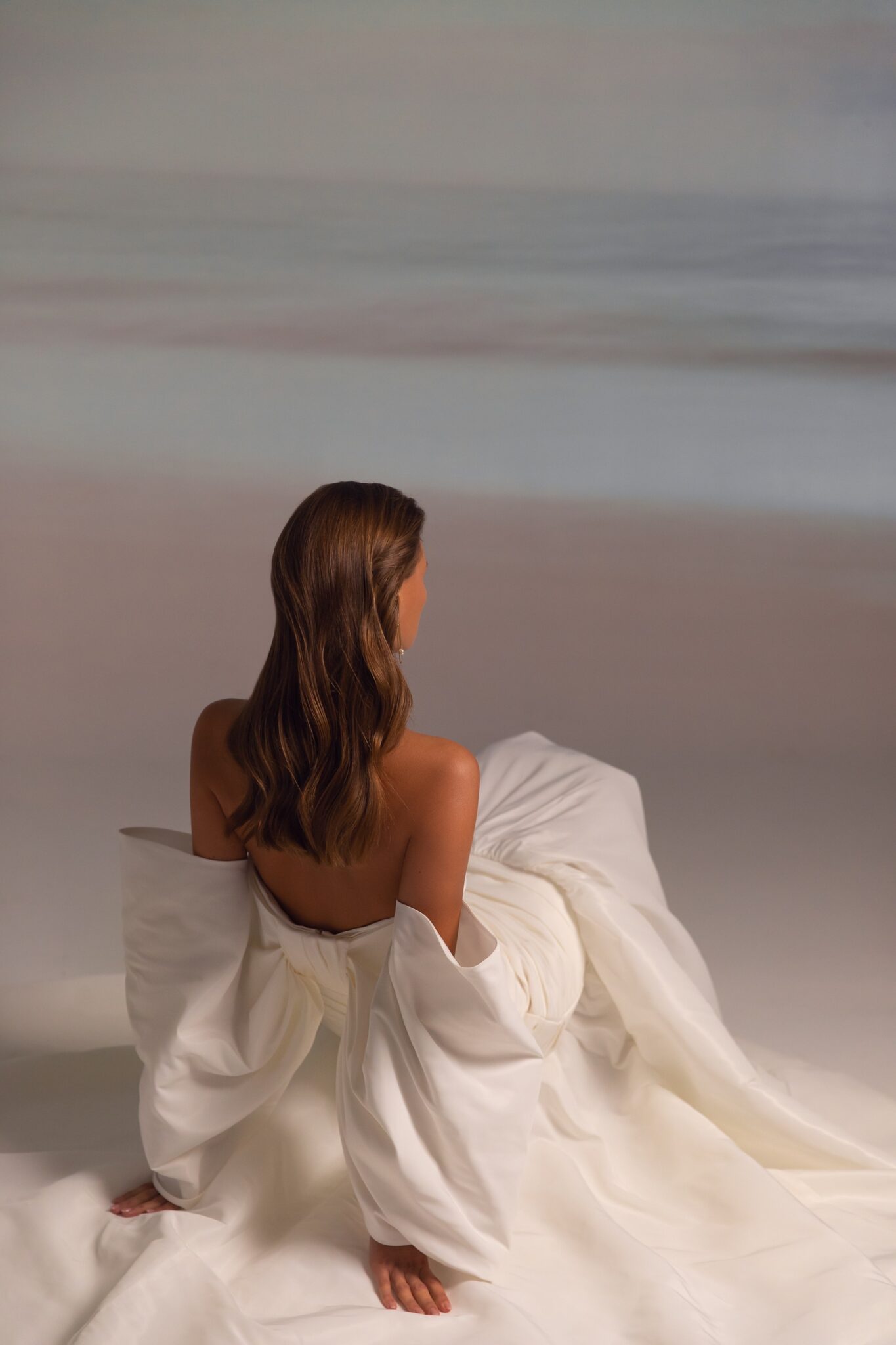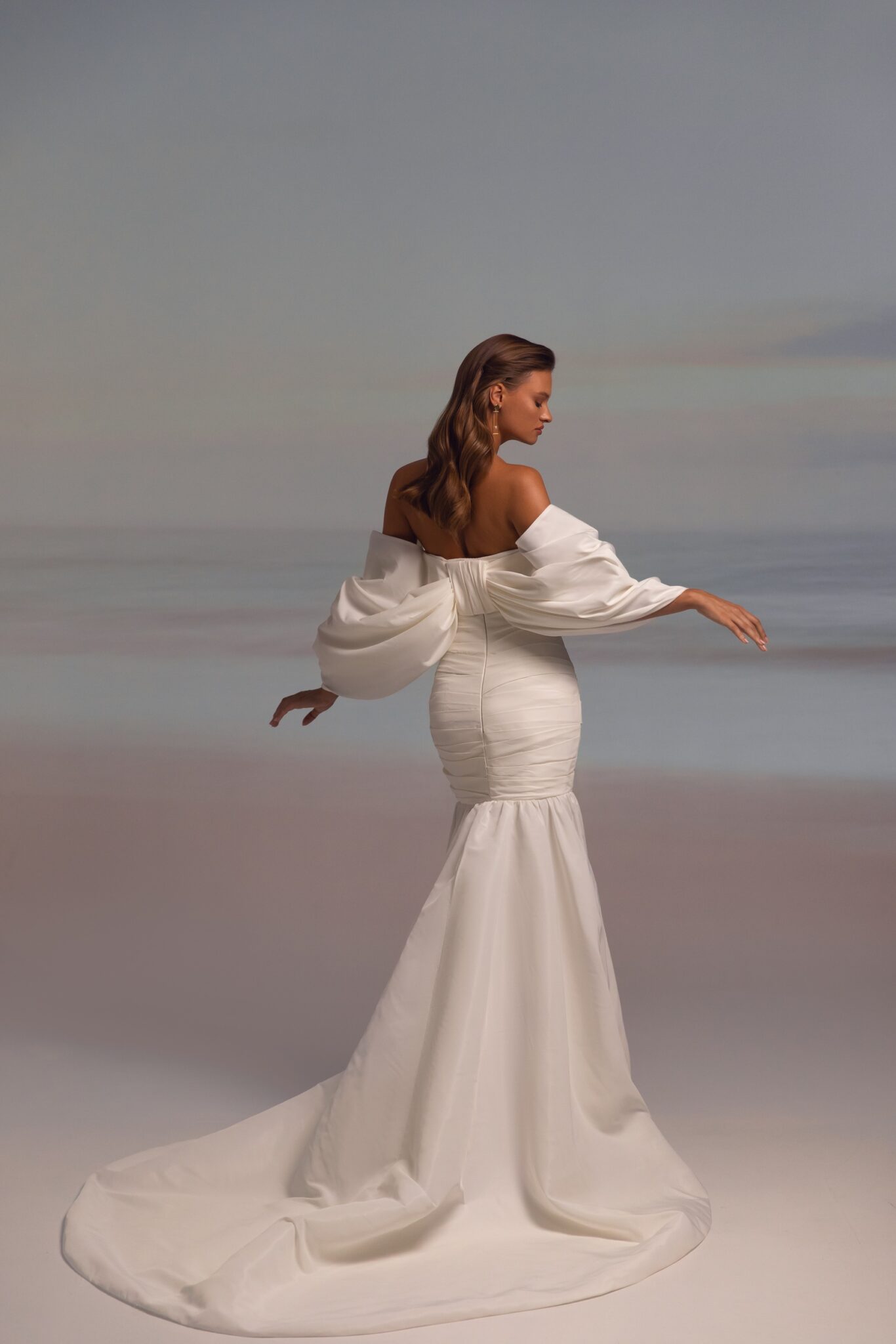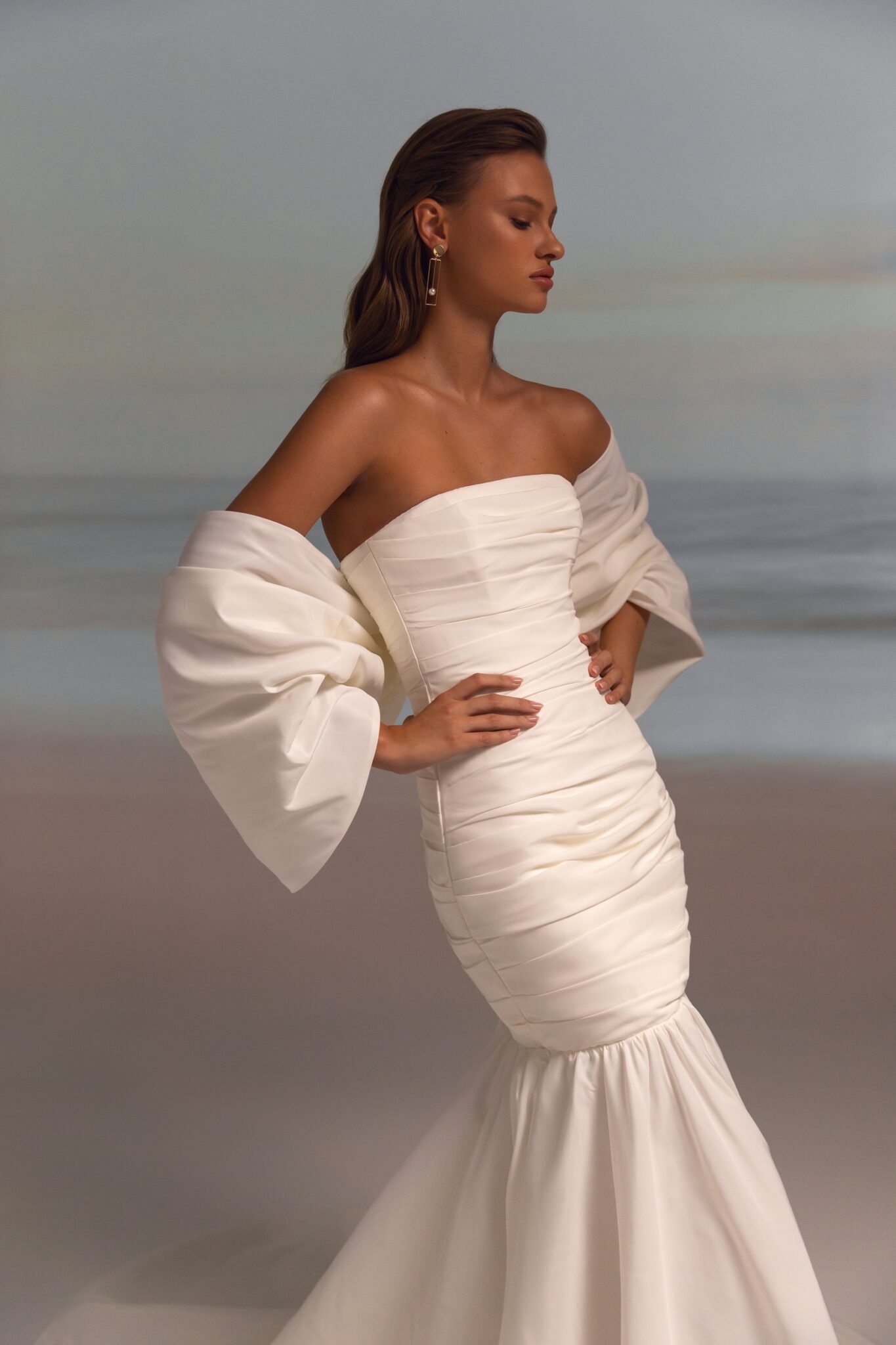 Екстравагантна дизайнерська весільна сукня. Сукня має корсет без брителей, прикрашений драпіруванням, що переходить до стегон. Розкішний об’ємний бант прикрашає спину сукні і створює чудові рукави. Спідниця облягає стегна і стає розкльошеною від колін вниз. Спідниця закінчується фантастичним шлейфом.
