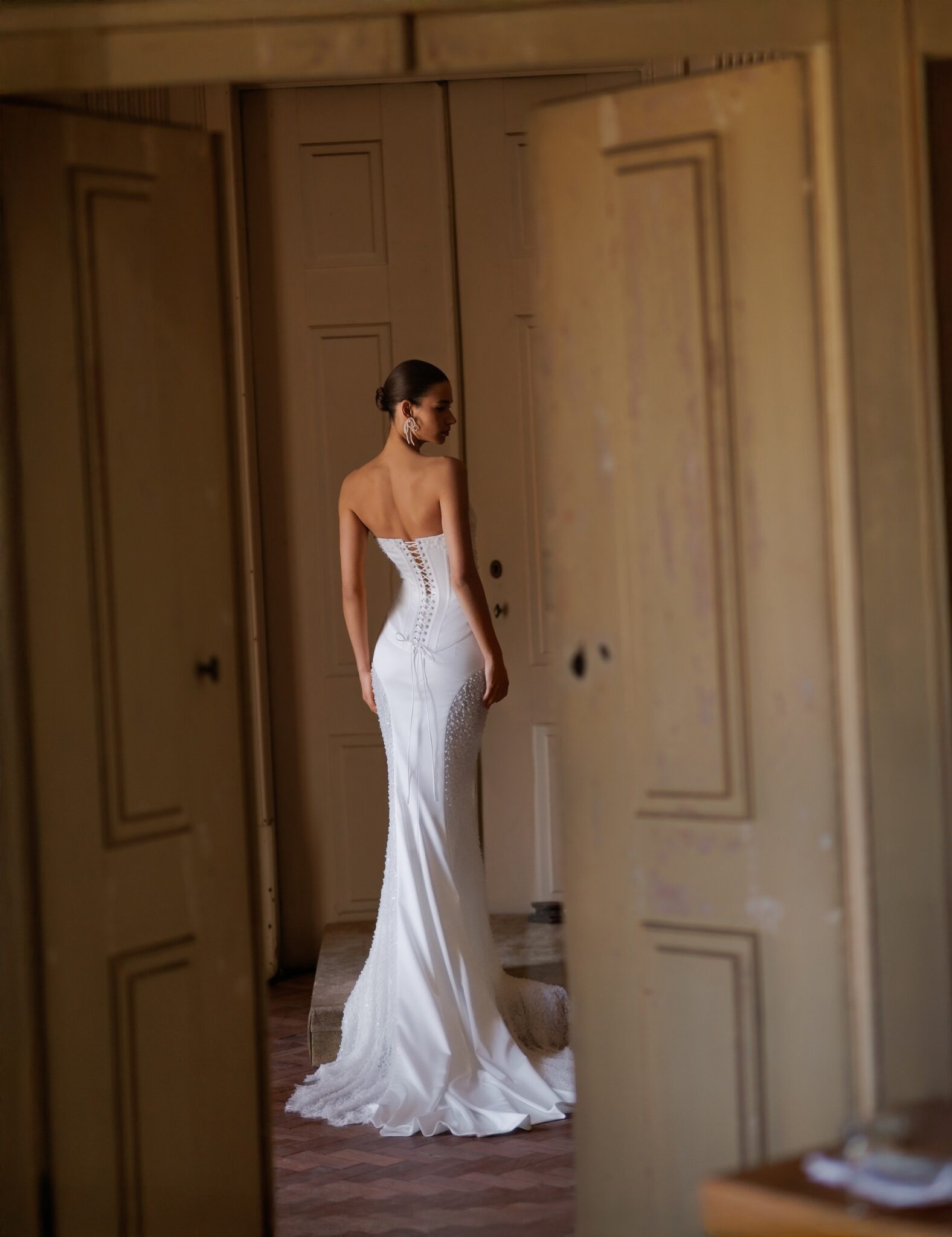 Структурований корсет гарно оздоблений ніжним мереживом та вишитими вручну перлинами, створюючи елегантний та романтичний образ. Довга спідниця виготовлена з розкішного атласу та має мереживні бокові панелі з обох боків, що тонко підкреслюють фігуру та надають їй витонченої, витягнутої форми.
