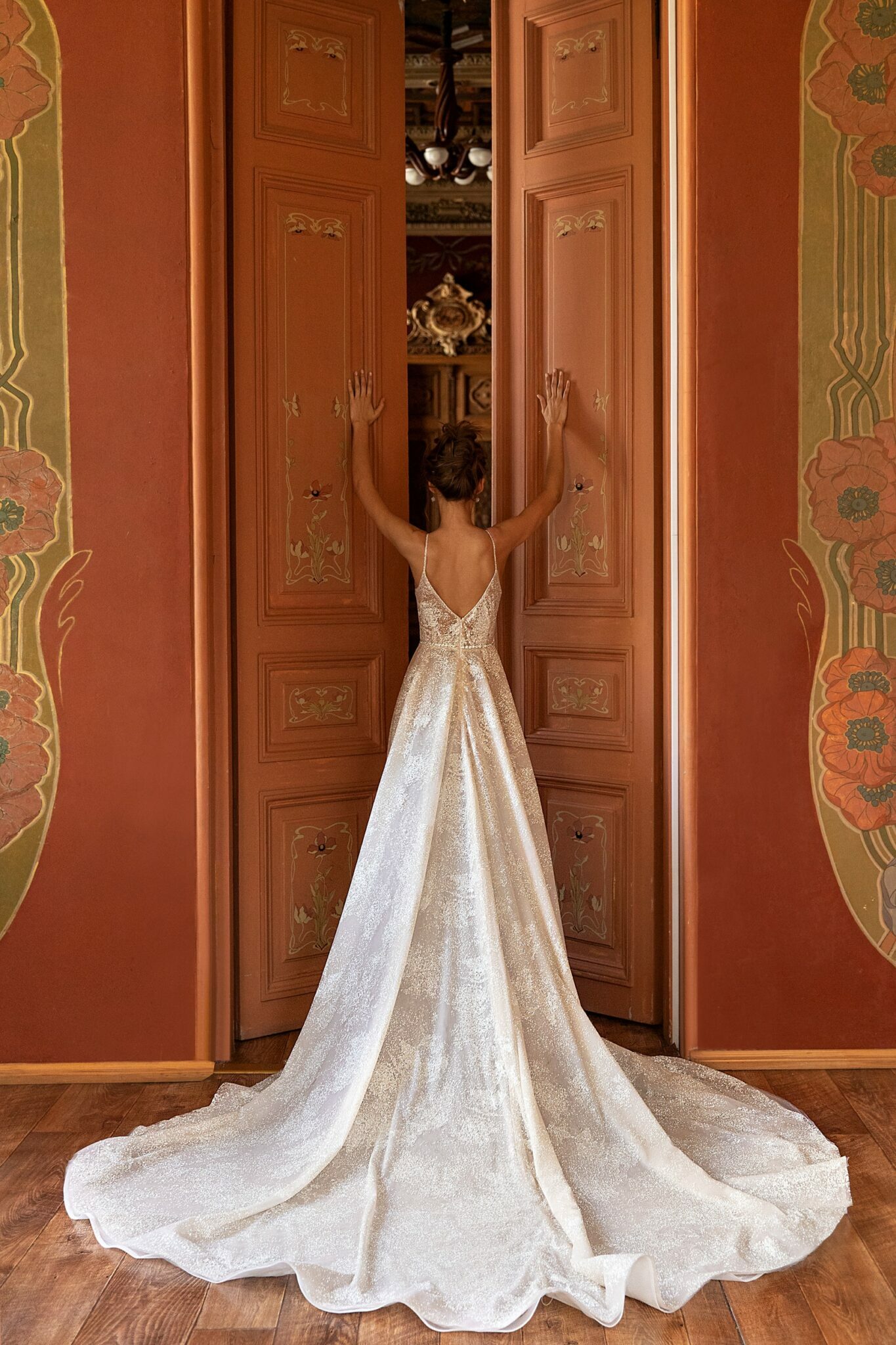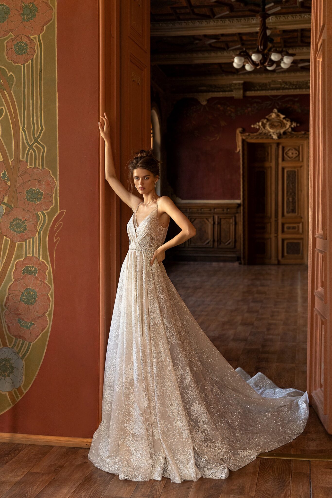 Galaxy – це весільна сукня у стилі “рибка” з довгим шлейфом. Сукня виготовлена з бежевого вуалі з білим квітковим орнаментом. Вона повністю вишита намистинами та паєтками. V-подібний виріз декольте та глибокий виріз на спинці роблять образ ніжним. Спідниця виготовлена з тієї ж блискучої тканини та вуалі, переходячи у довгий шлейф.
