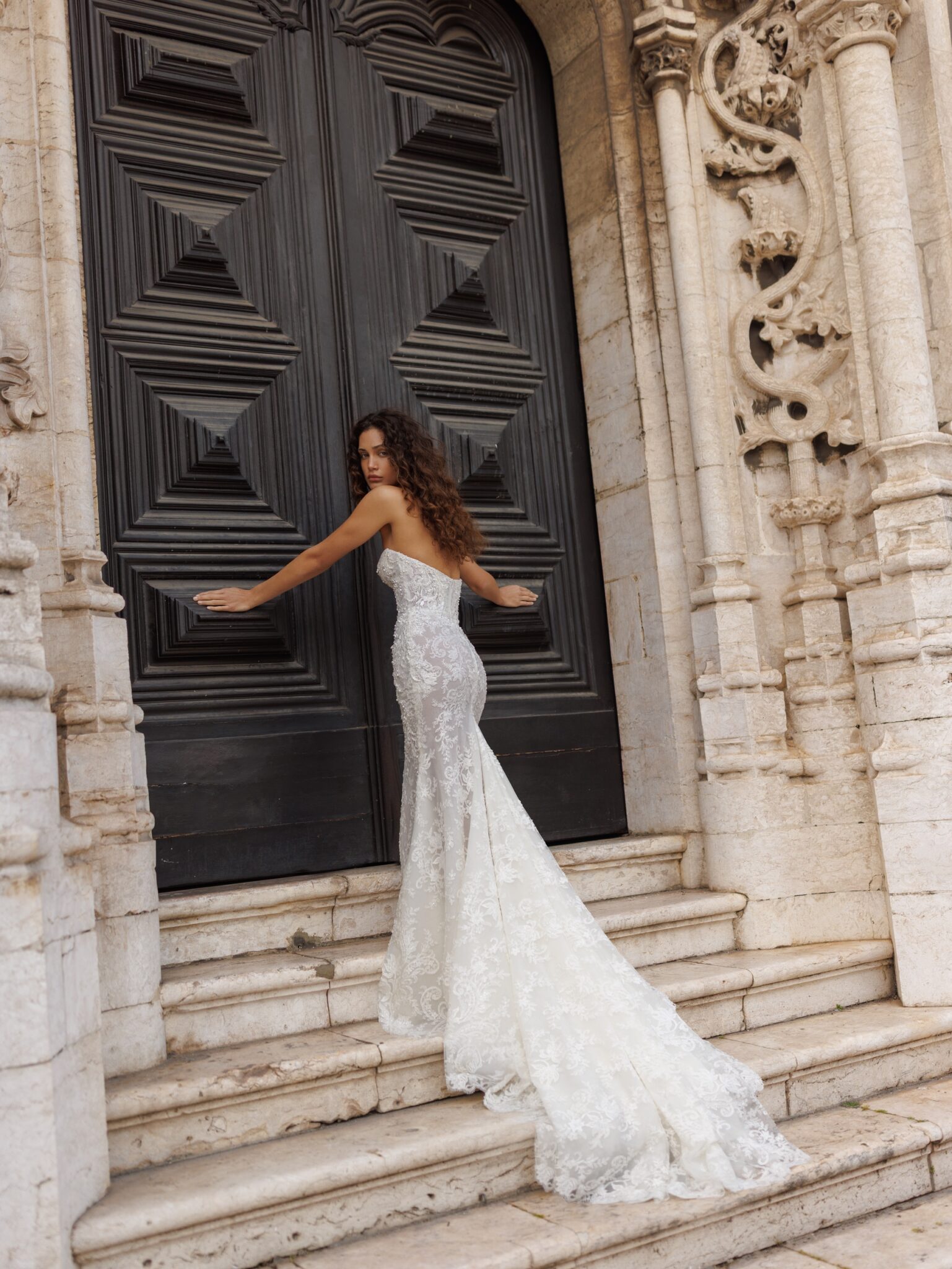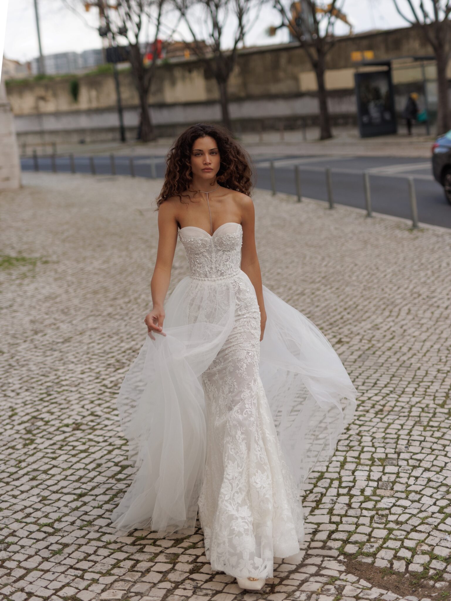 Для посиленої підтримки та структури сукня має вбудований внутрішній корсет, який непомітно застібається на блискавку. Без шлейфу сукня перетворюється на позачасовий класичний силует. Знімний шлейф елегантно витончений, пропонуючи потрібну кількість драматизму, не перевантажуючи образ.
