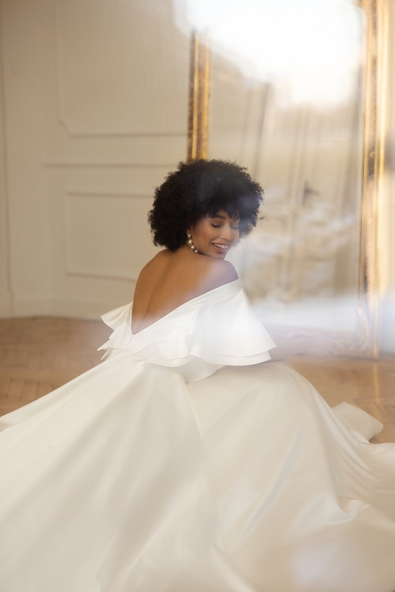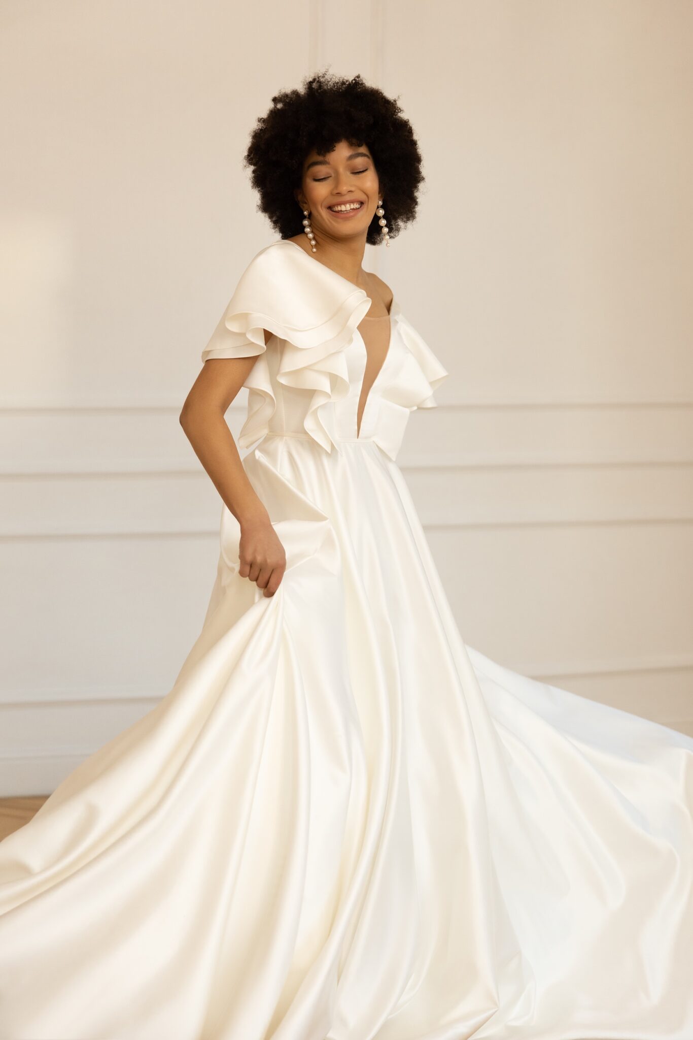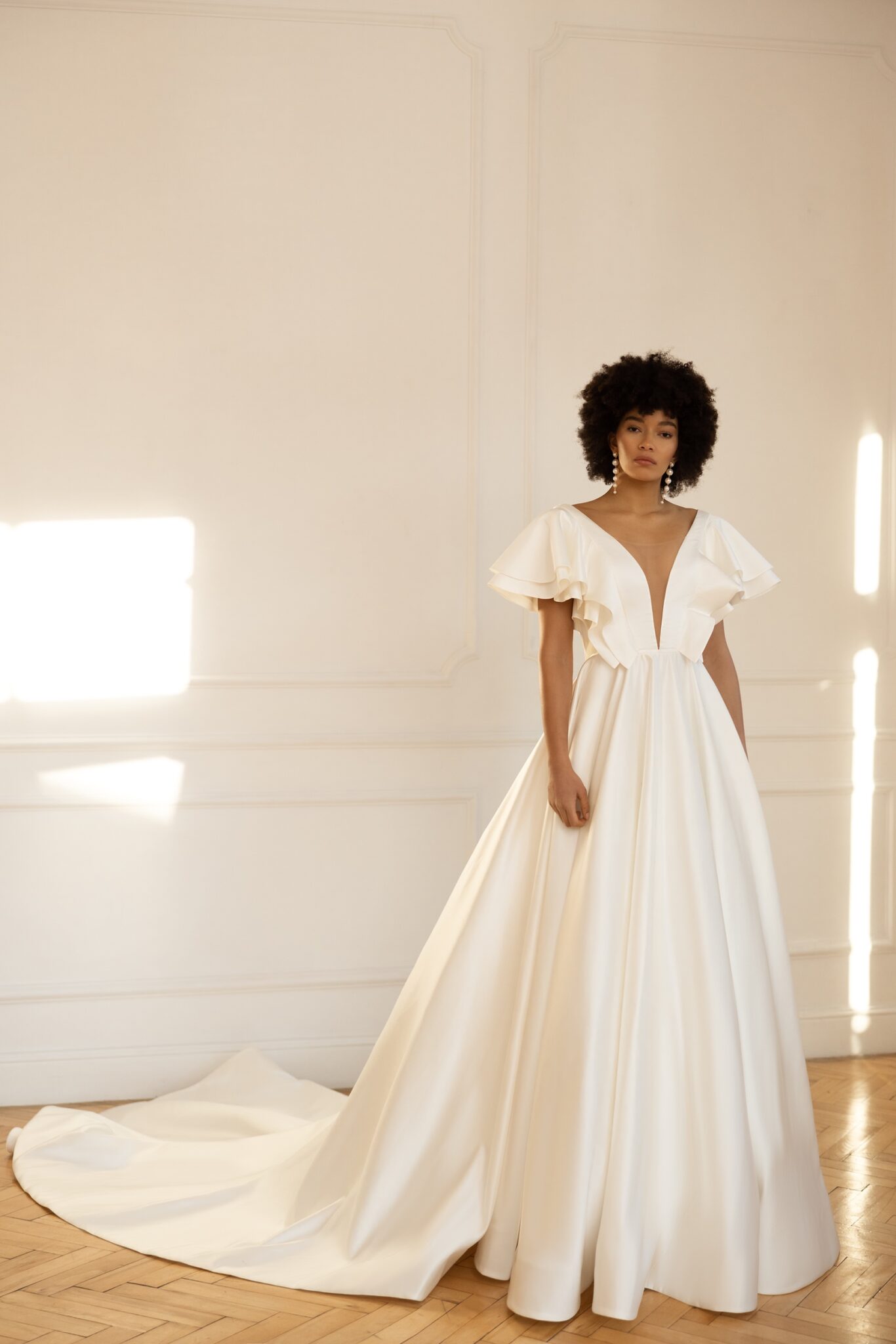 Ця велична сукня повністю пропонує елегантний образ нареченої. Виготовлена з м’якої як масло сатинової тканини, стиль включає рукава з оборками та глибокий V-подібний виріз. Низький V-подібний виріз на спині робить цю чарівну сукню ідеальним варіантом для круглих наречених. М’яка спідниця прямого крою з кафедральним шлейфом подовжує силует.