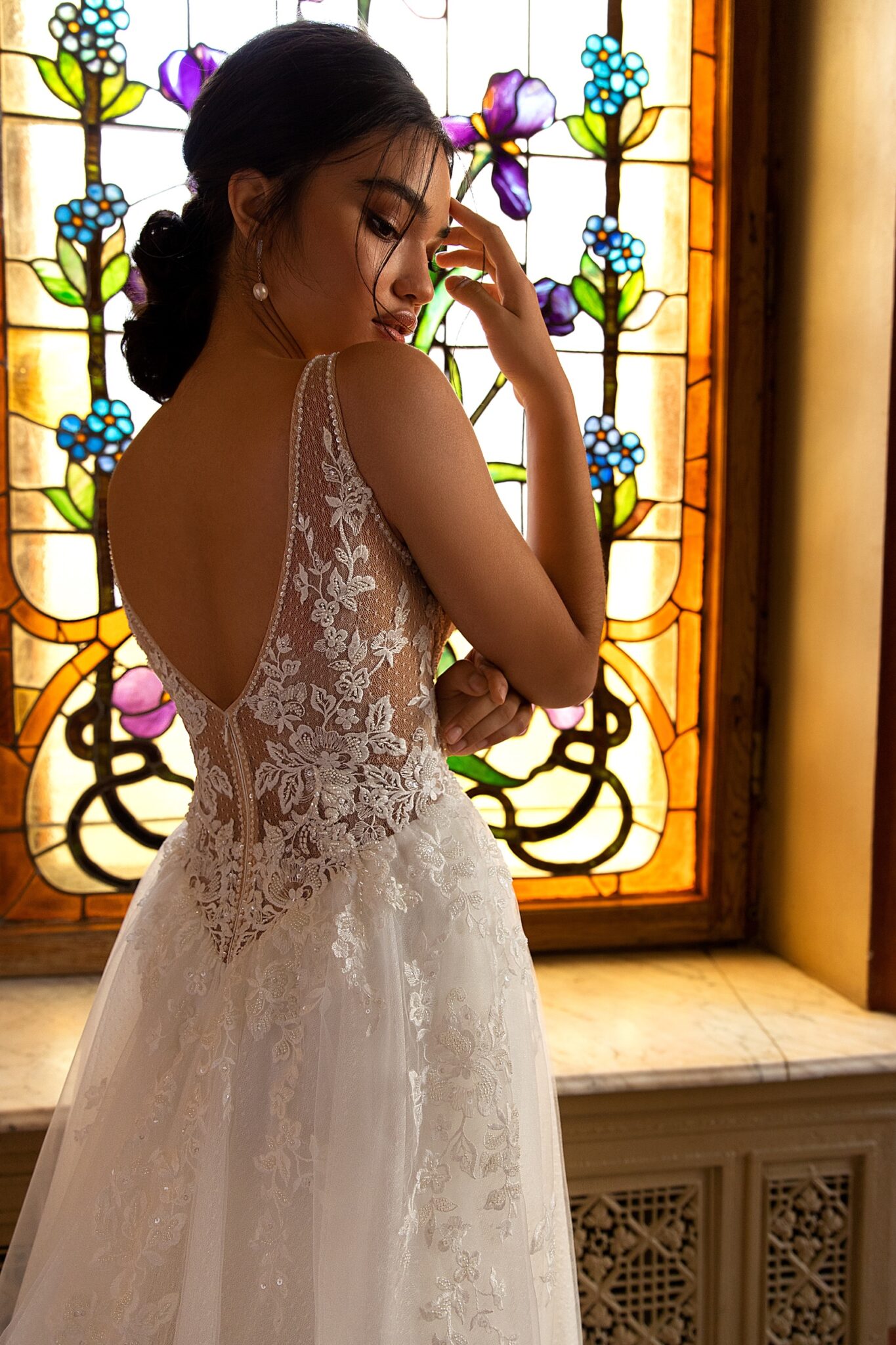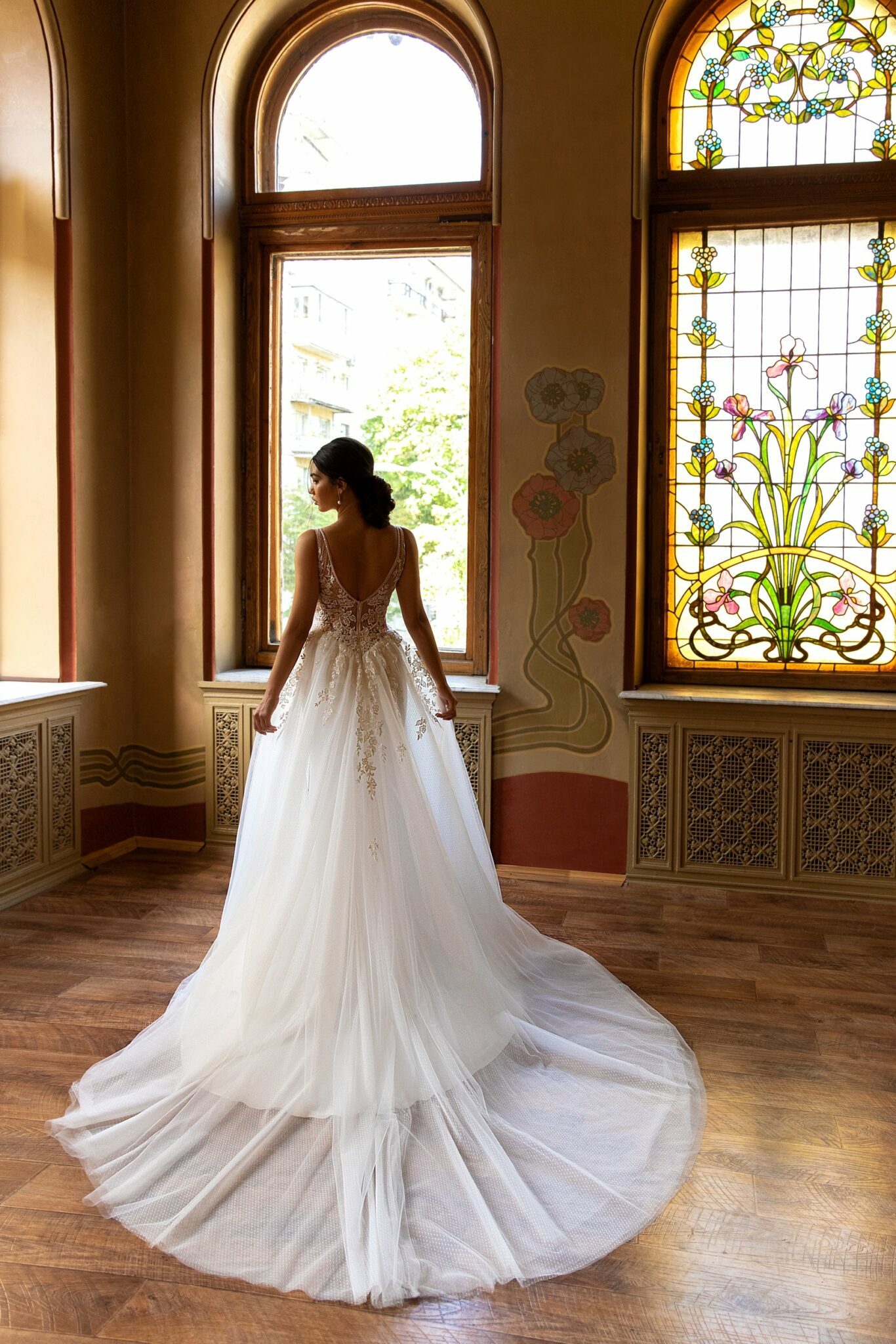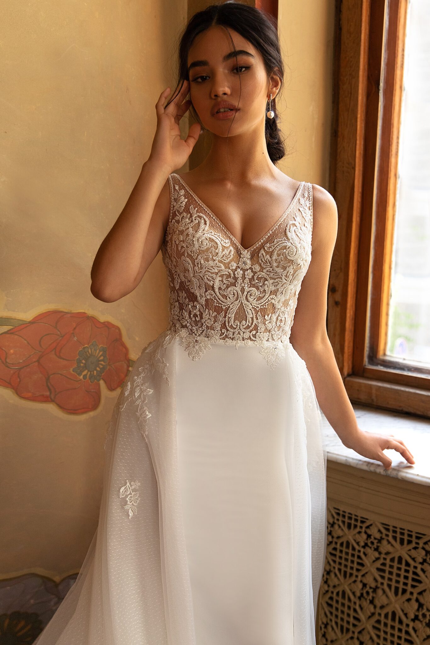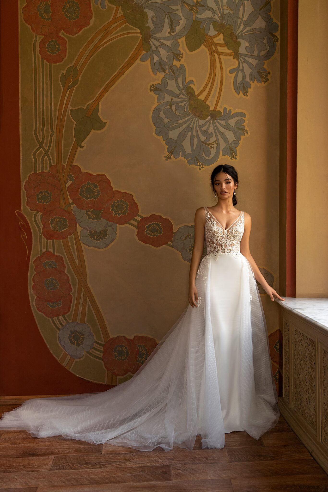 Ніжна весільна сукня Irwin виготовлена з вишуканої тканини з маленькими крапочками. Сукня прикрашена V-подібним вирізом та опущеними плечима. Велика частина сукні прикрашена мереживними квітами. Корсет прикрашений короткими рукавами, виготовленими з вуалі. Спина сукні має чудовий виріз, виконаний з прозорої тканини.