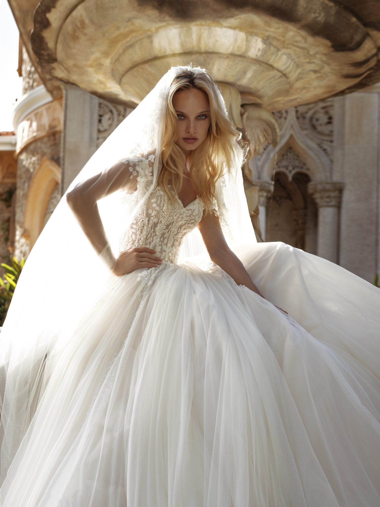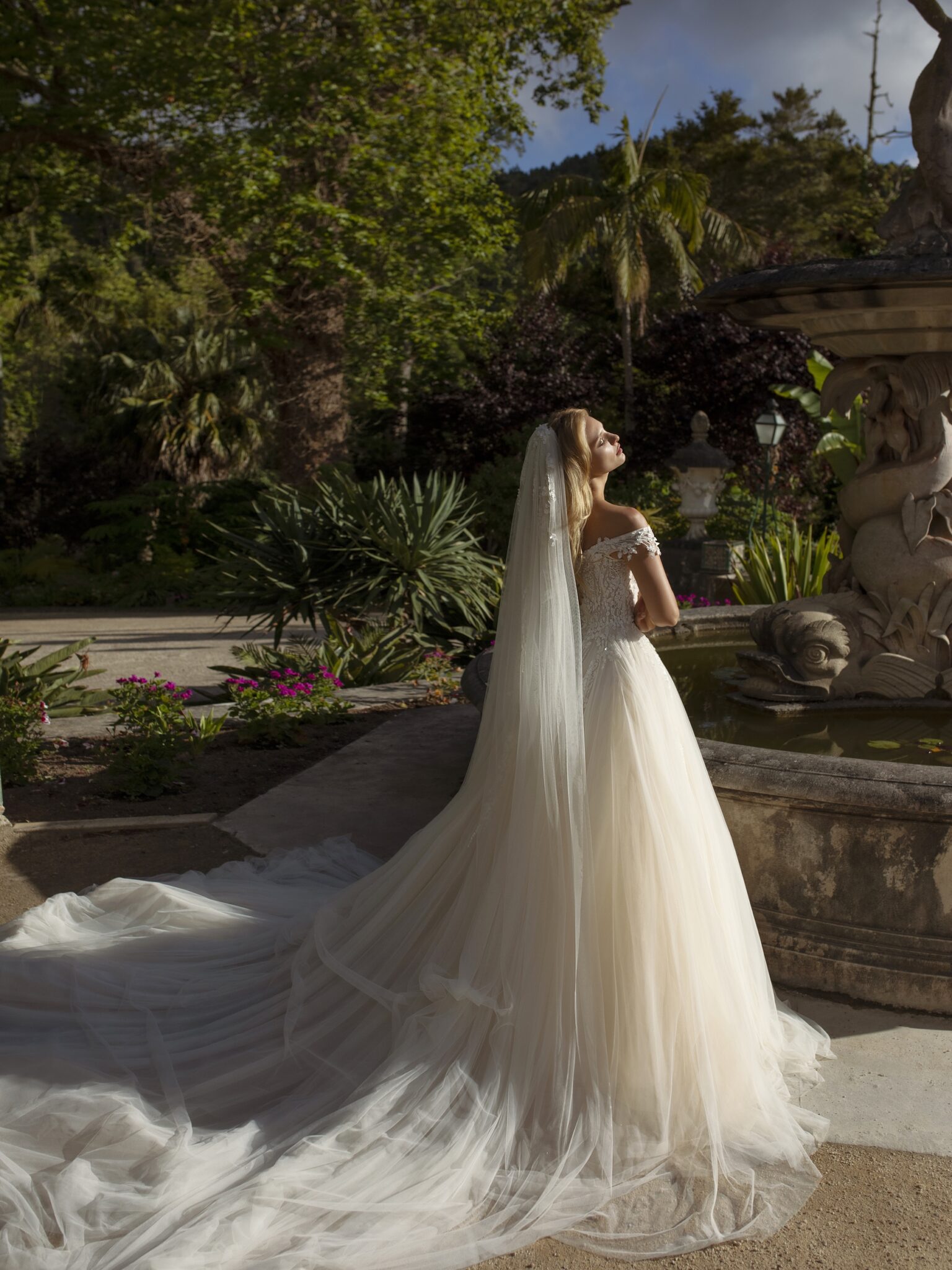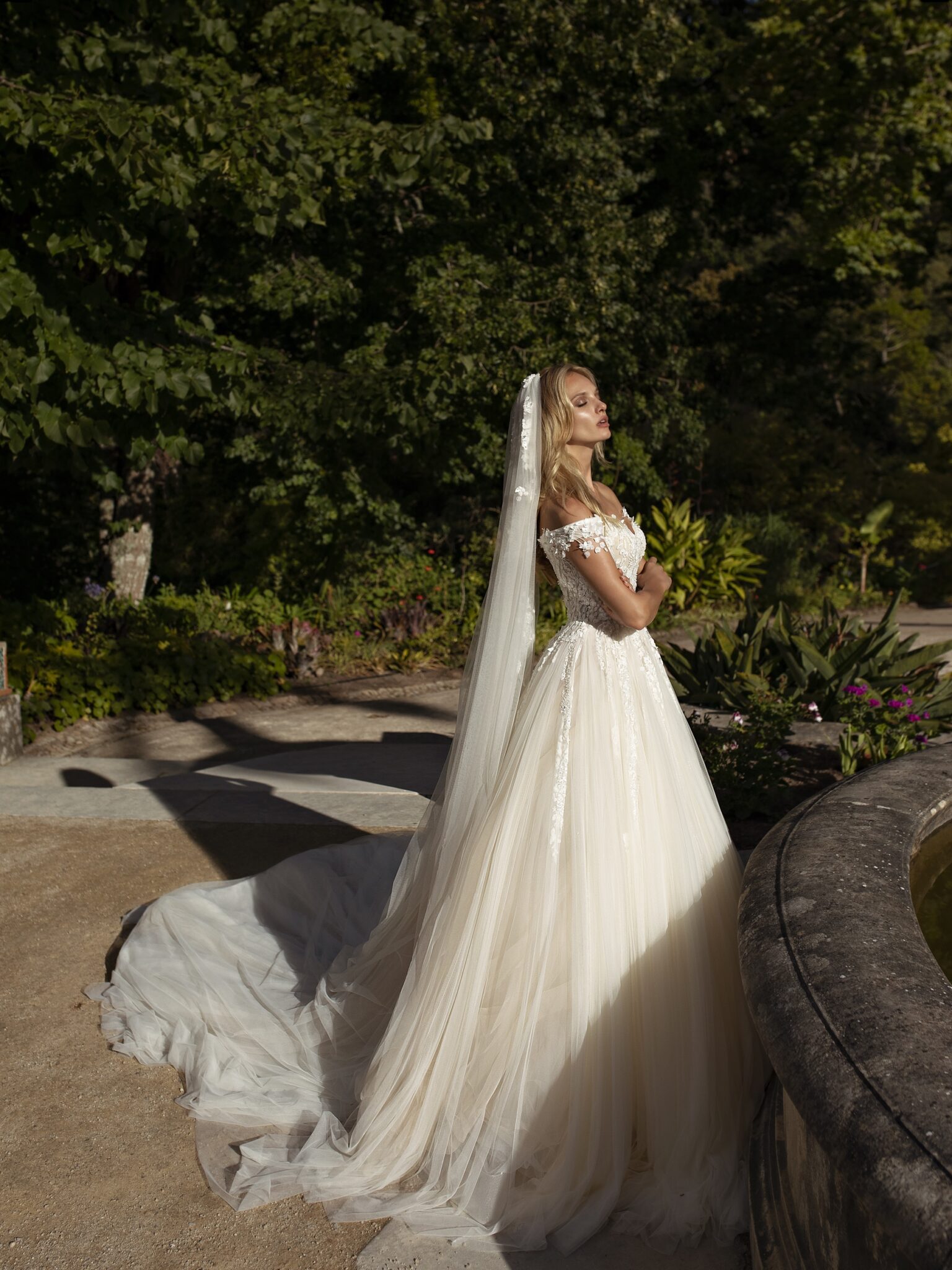 Вражаюча весільна сукня Karin поєднує ніжний вуаль та чудове мереживо. Корсет повністю виготовлений з мережива та прикрашений глибоким V-подібним вирізом і вирізом у формі літери “V” на спинці сукні. Маленькі квіти на корсеті переходять на спідницю з вуалі.