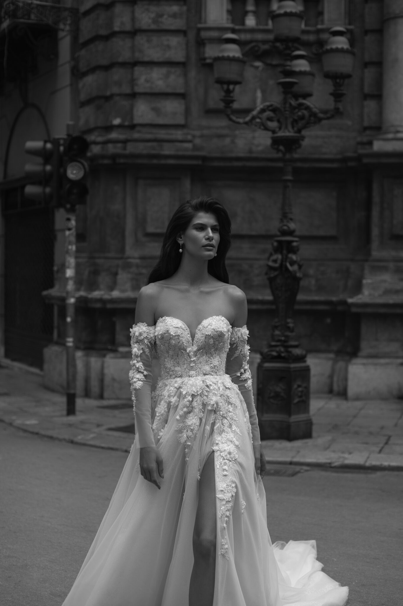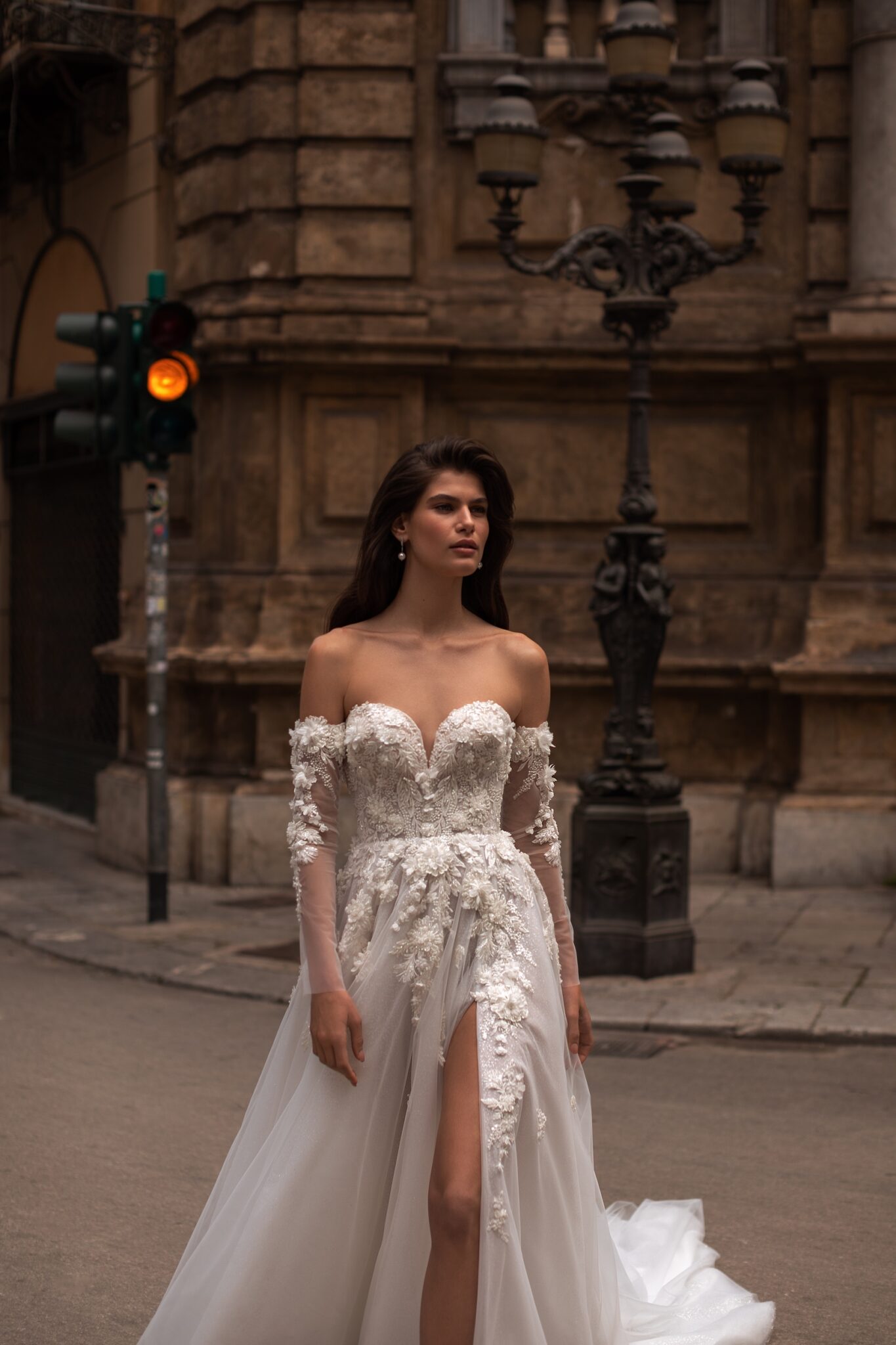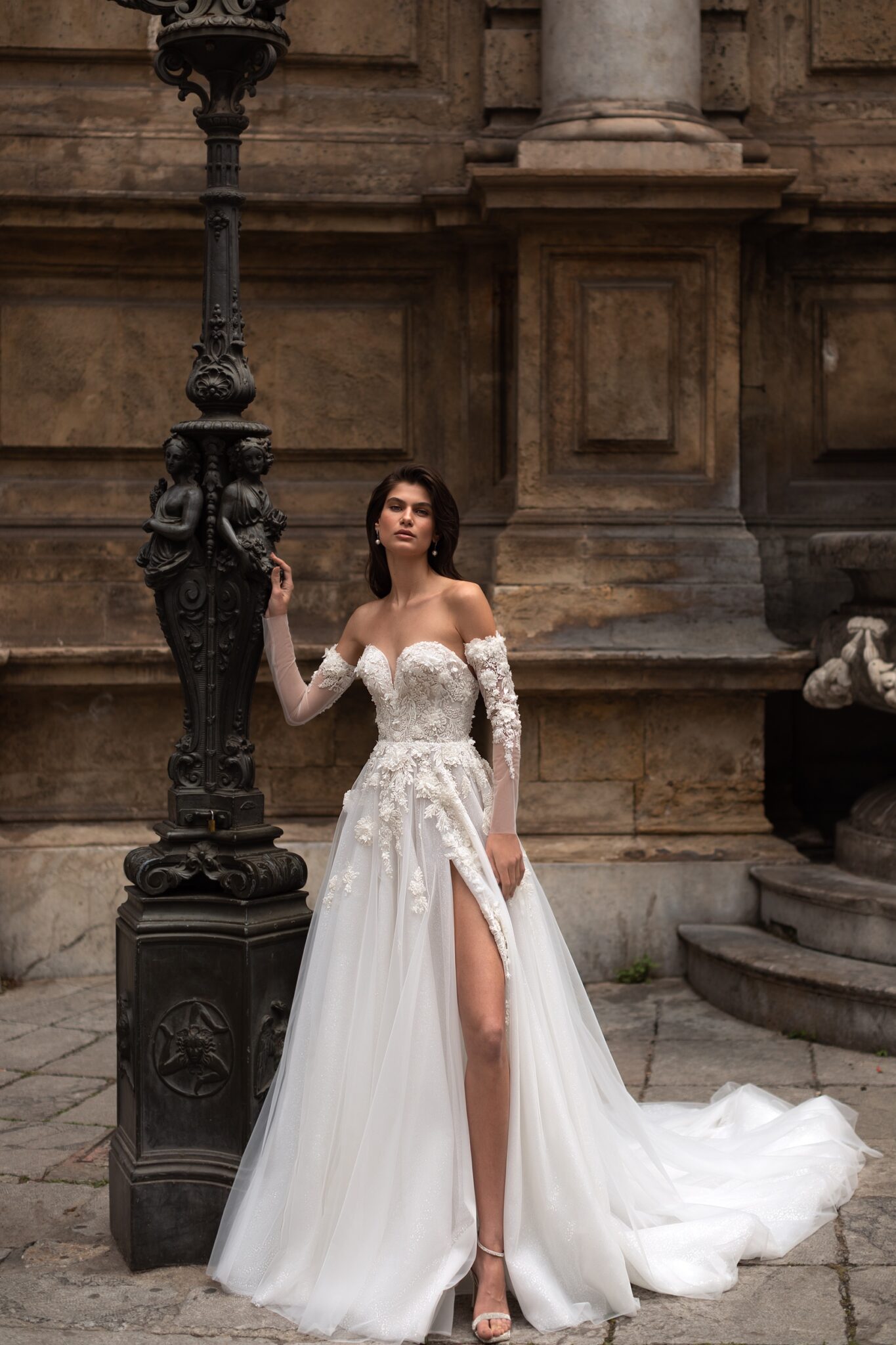 Мереживні аплікації підкреслюють сяючу текстуру тюлі на цій фантастичній весільній сукні А-силуету з вузькими знімними рукавами, прикрашеними квітковою вишивкою. Корсет без бретелей у формі серця прикрашений великими симетричними 3D-квітами та мереживом з бісеру. Об’ємна спідниця з розрізом до стегна оздоблена делікатним, вишитим вручну, квітковим мереживом біля лінії талії та довгим розкішним шлейфом.