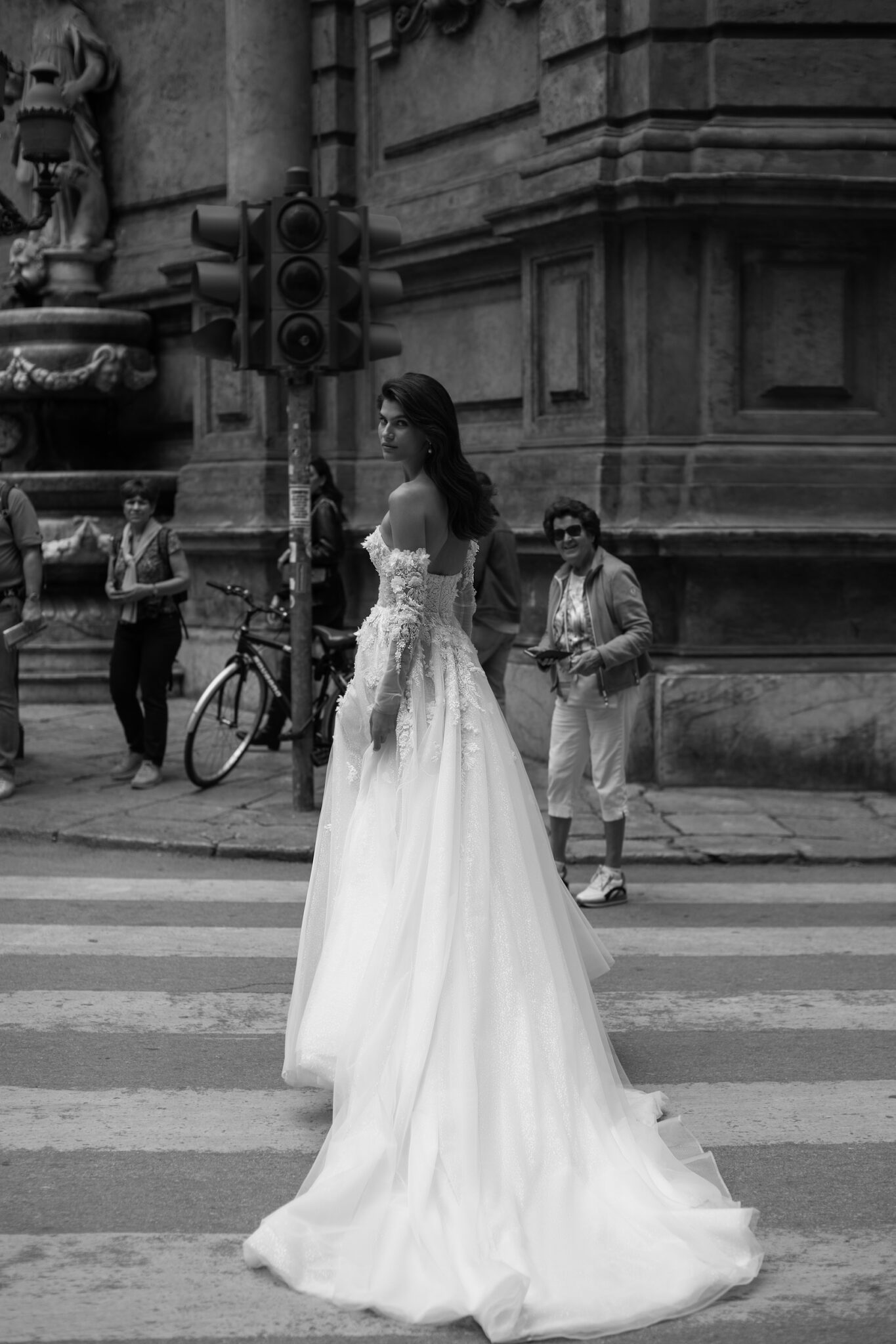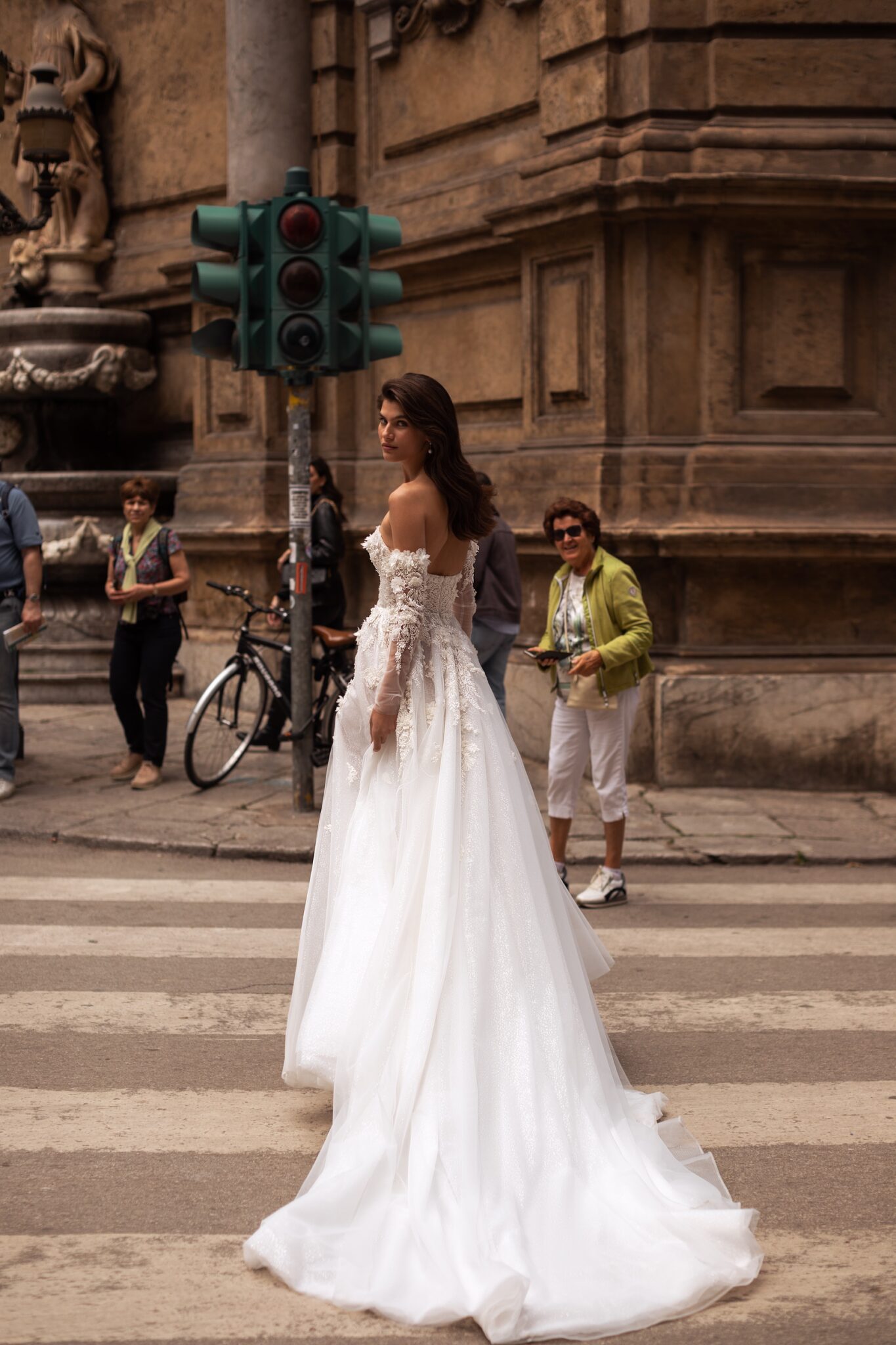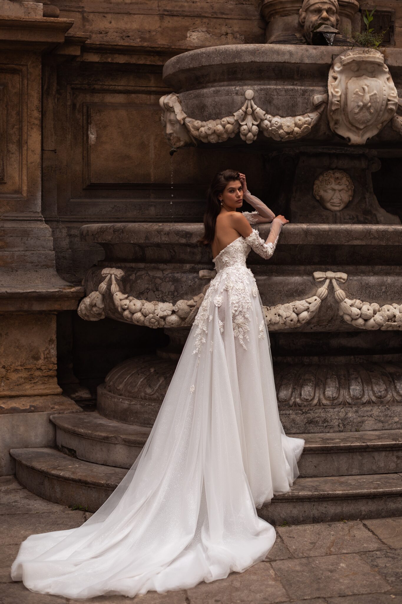 Мереживні аплікації підкреслюють сяючу текстуру тюлі на цій фантастичній весільній сукні А-силуету з вузькими знімними рукавами, прикрашеними квітковою вишивкою. Корсет без бретелей у формі серця прикрашений великими симетричними 3D-квітами та мереживом з бісеру. Об’ємна спідниця з розрізом до стегна оздоблена делікатним, вишитим вручну, квітковим мереживом біля лінії талії та довгим розкішним шлейфом.