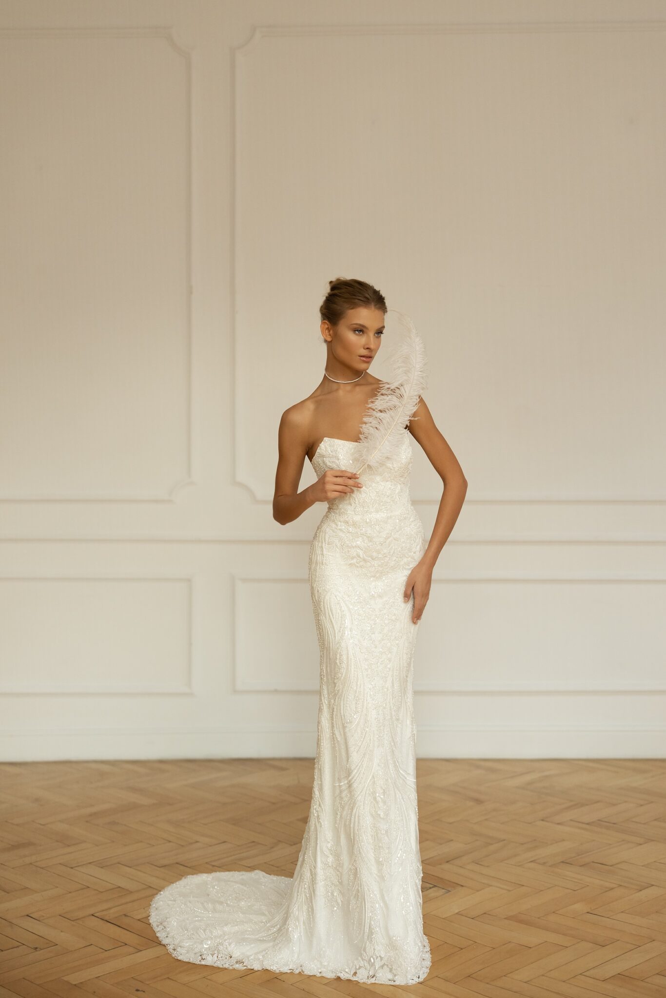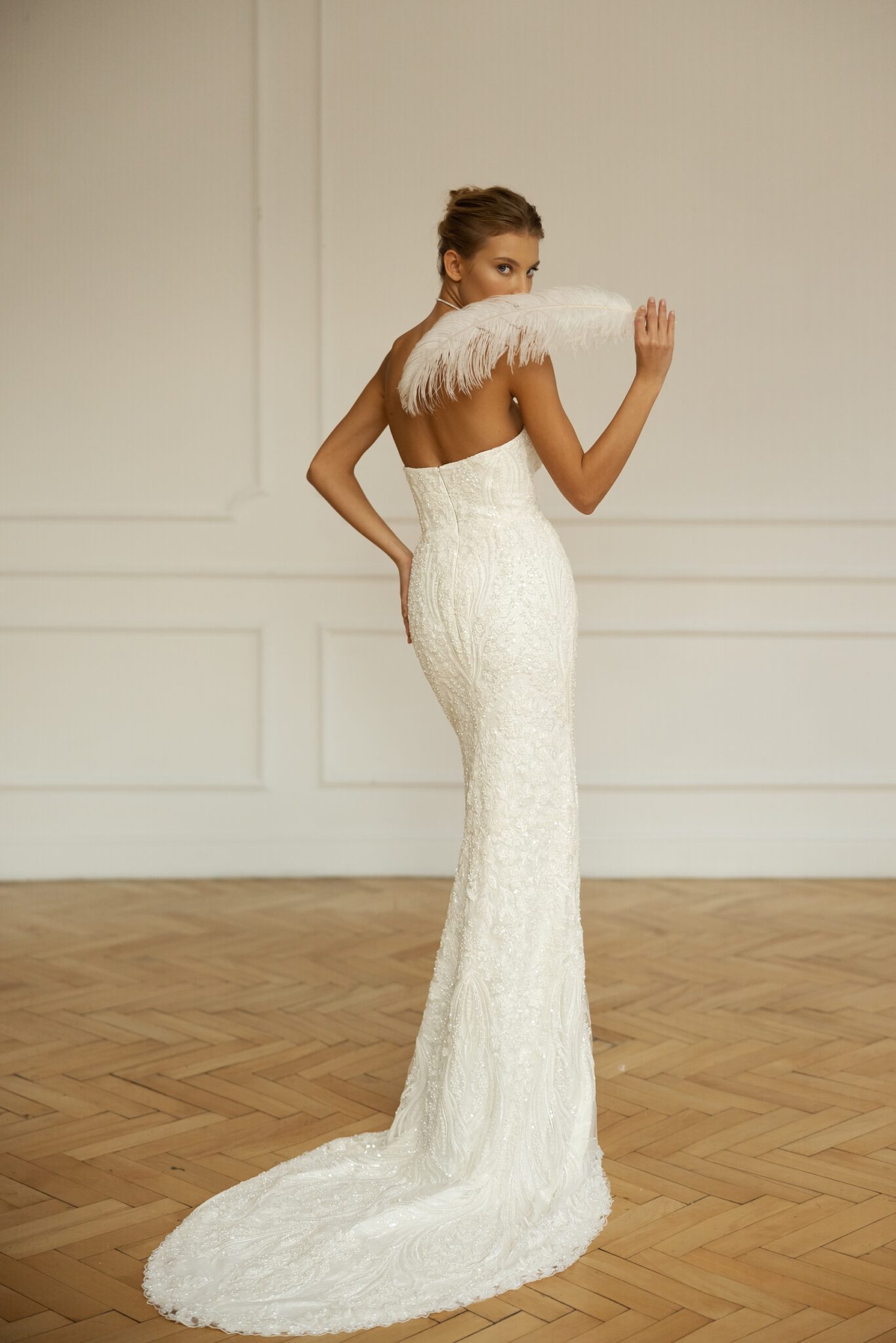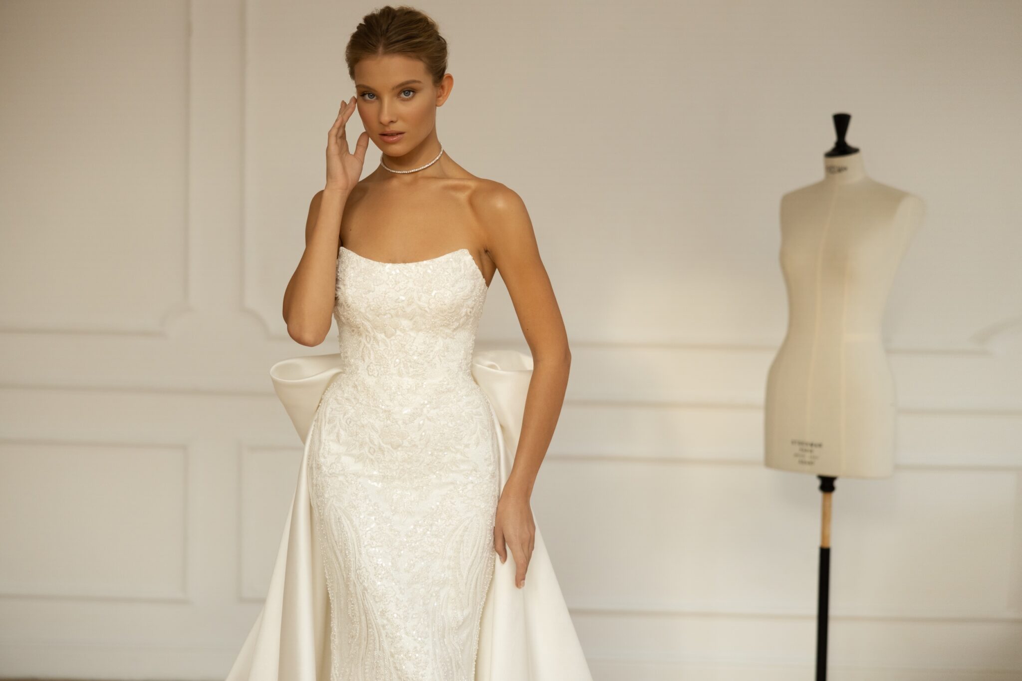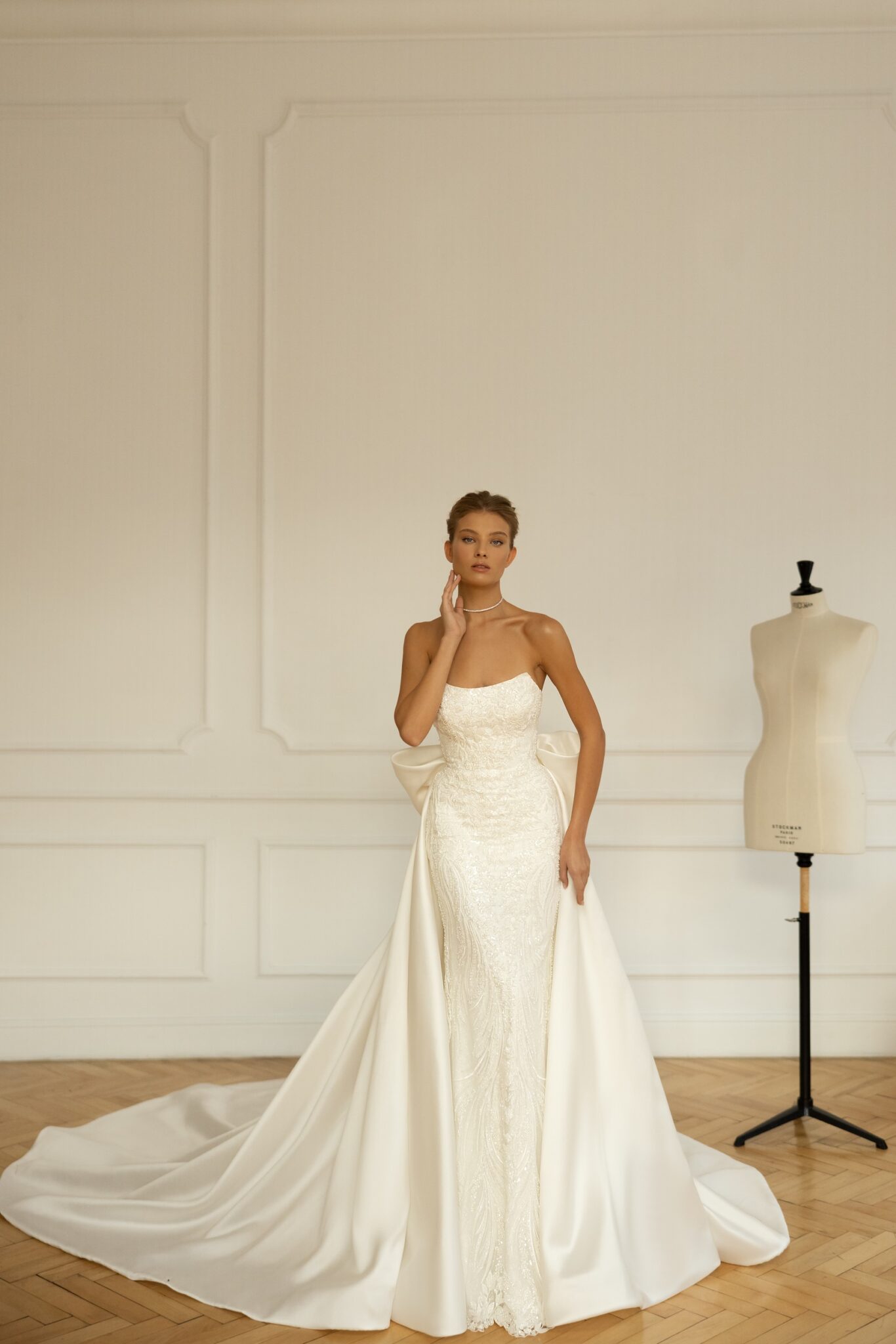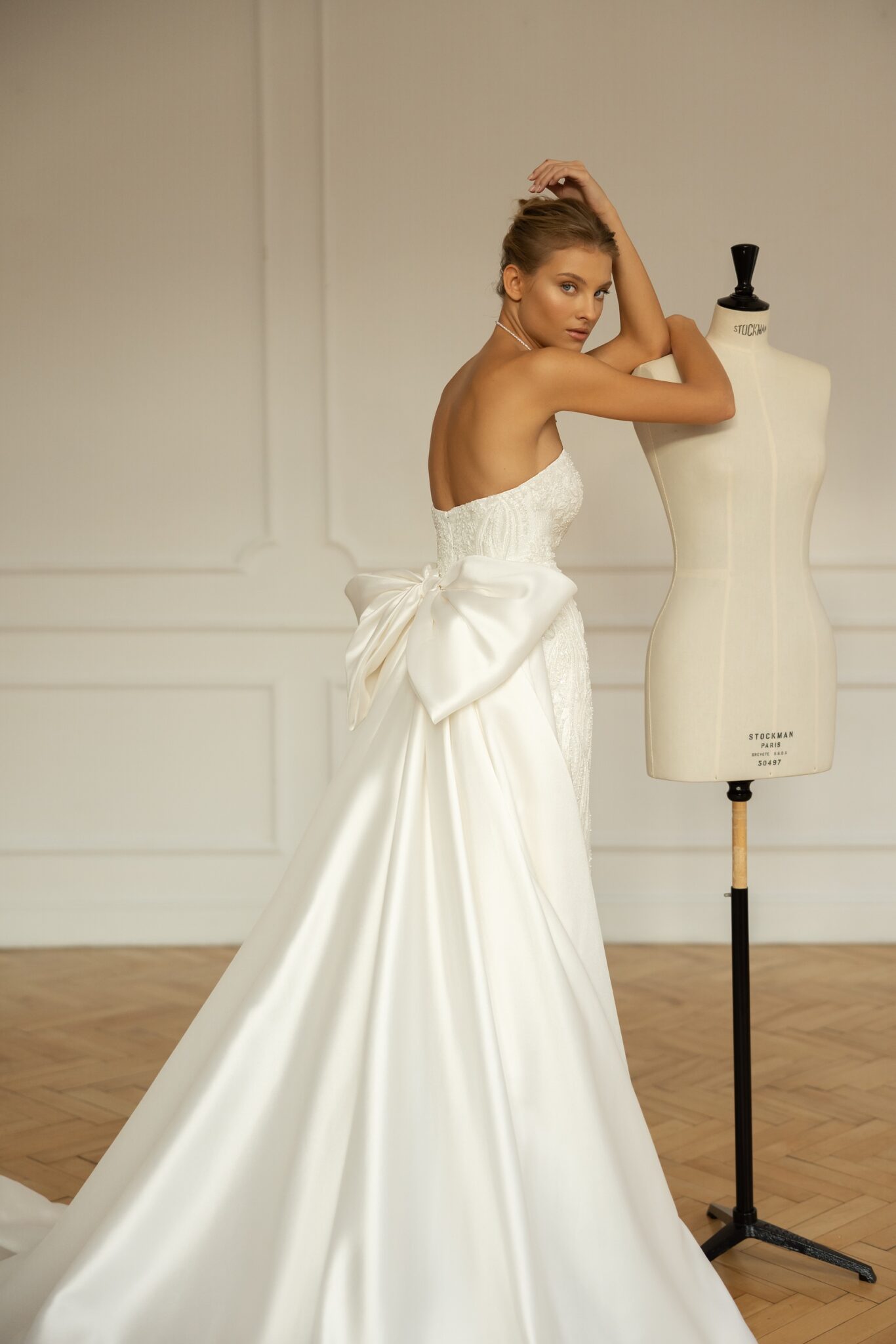 Lanvee — приголомшлива сукня-рибка, розшита бісером та паєтками по усій довжині. Класичний корсет з сміливим прямим вирізом без бретелей привертає всю увагу до нареченої. Витончені лінії спідниці ідеально підкреслюють фігуру, а ефектна верхня спідниця з об’ємним бантом на спинці завершує образ справді королівського весільного образу