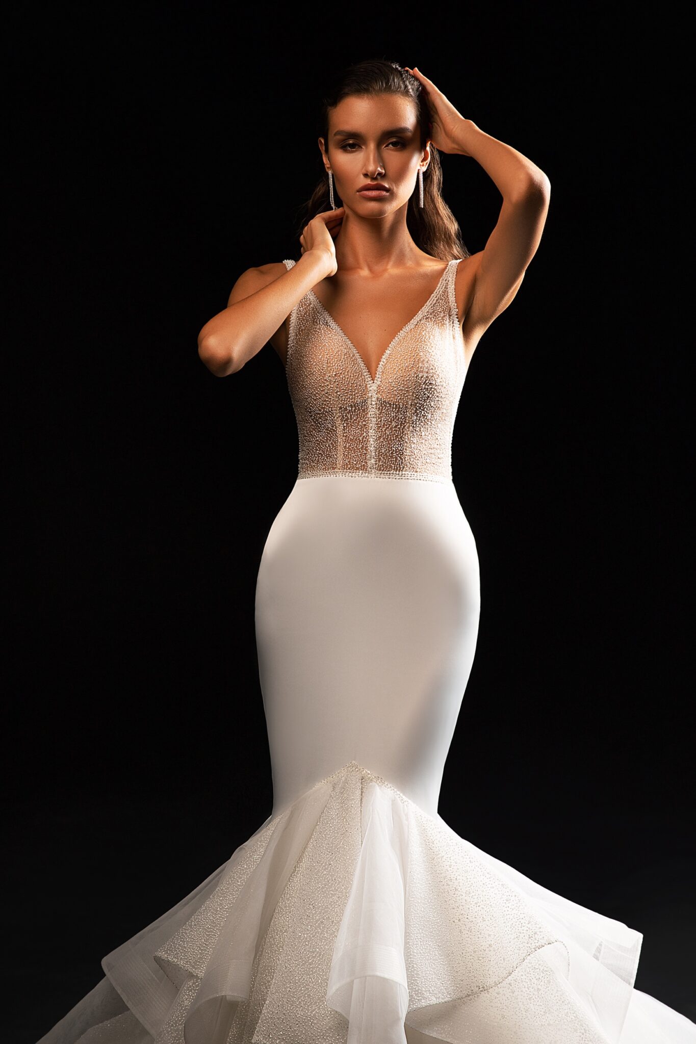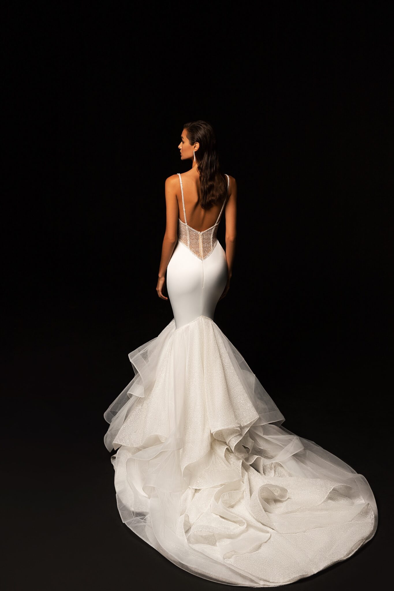 Унікальна сукня з блискучим корсетом і простою спідницею, яка прикрашена оборками. Сукня поєднує в собі елементи силуету “рибка” і унікальний оборковий шлейф.