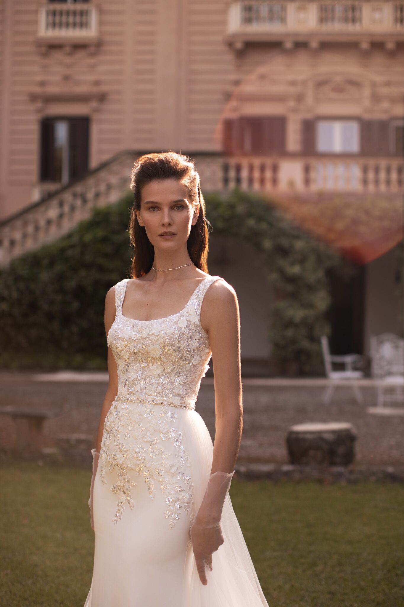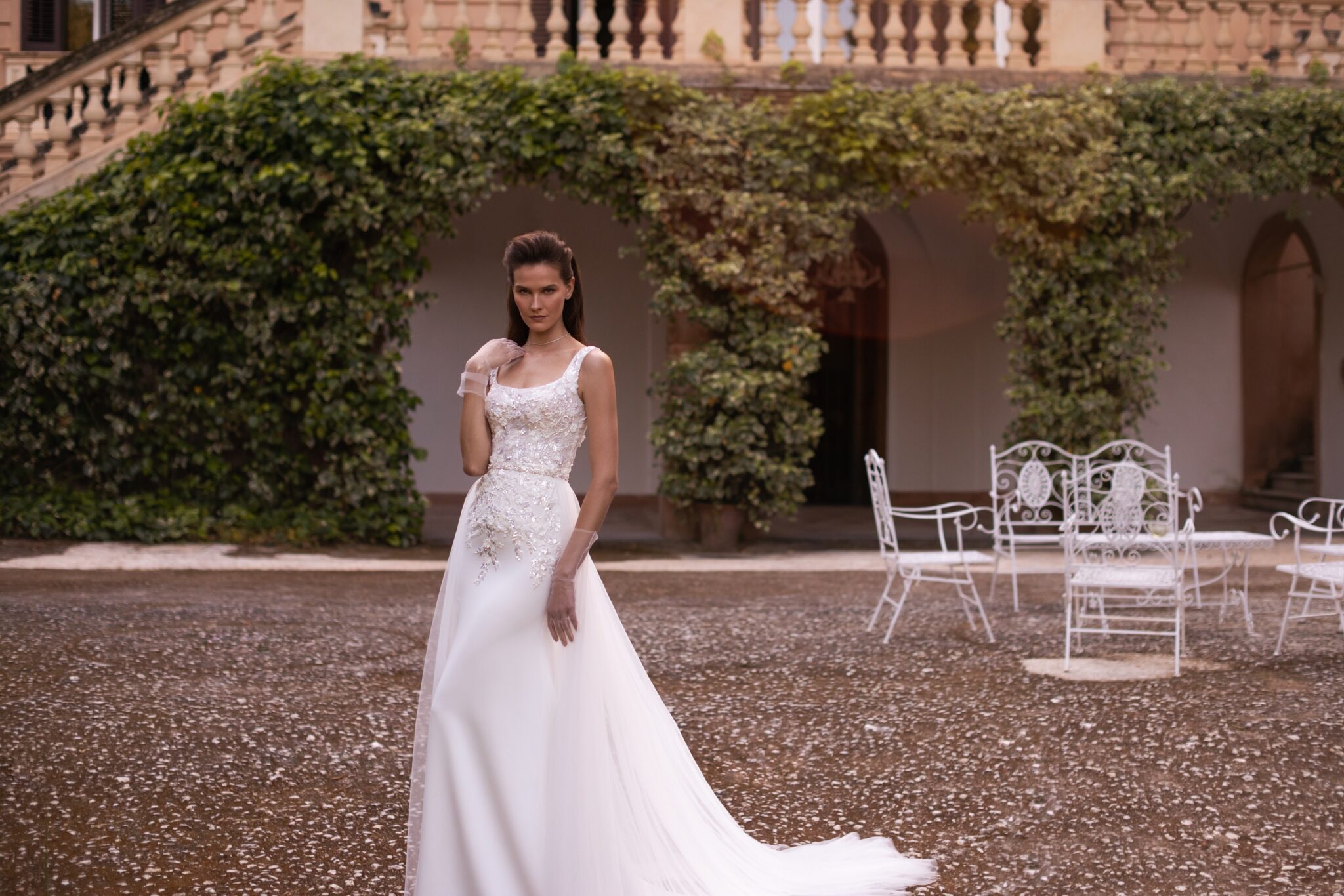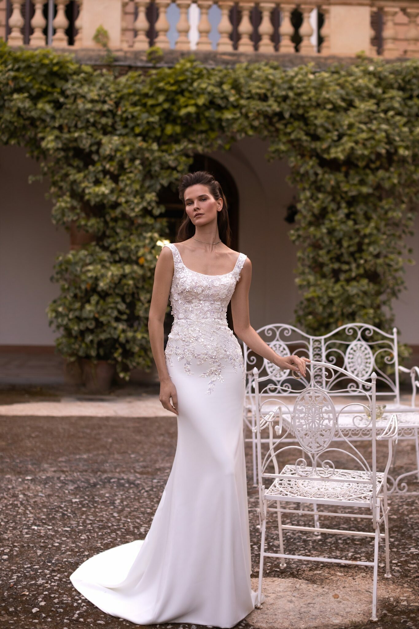 Luana – це супер-приталене весільне плаття у стилі труба, прикрашене розсипаними рукодільними 3D аплікаціями з блискучими бусинами та пайетками. Елегантний виріз човник переходить у прозорі вишиті бретелі, а гладка сукня зі сатину поєднується з легкою облягаючою спідницею з тюлю, яка кріпиться на талії і переходить у охайний шлейф чапельної довжини.