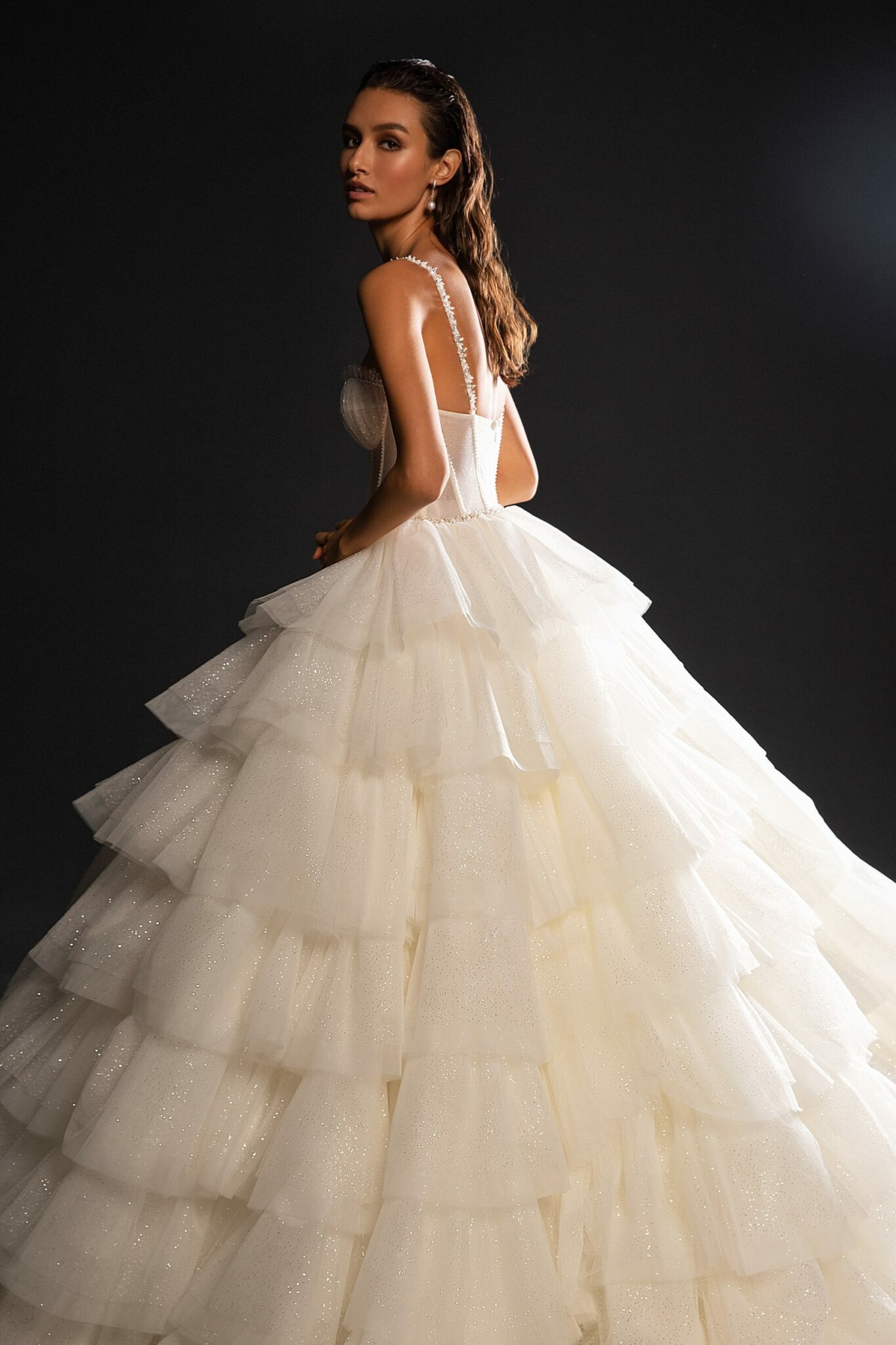 Королівська весільна сукня з чудовим шлейфом з фатинових оборок. Корсет і сама сукня зроблені з блискучих тканин. Облягаючий силует сукні прикрашений сердечкоподібним вирізом і тонкими бретельками на плечах.