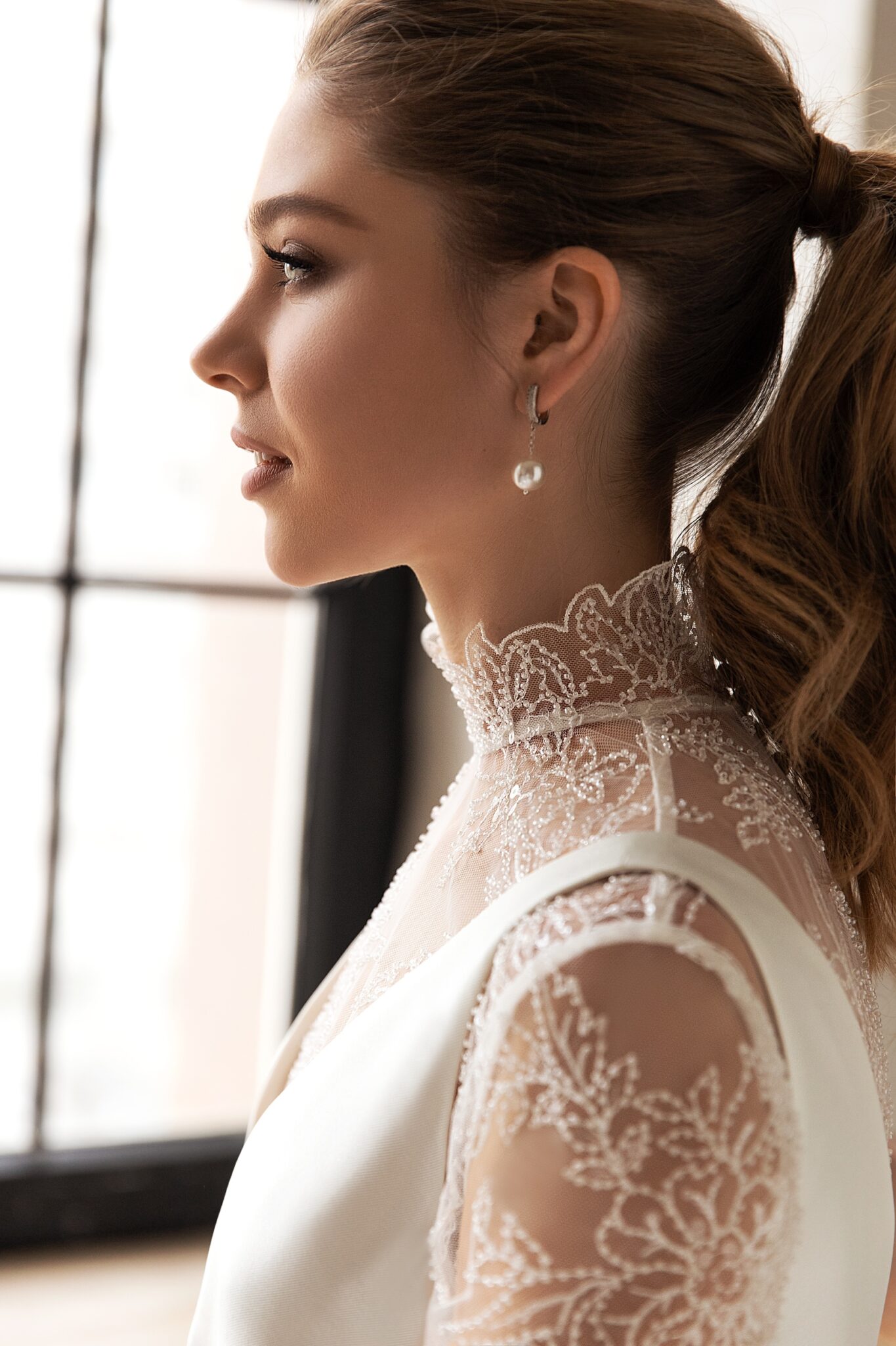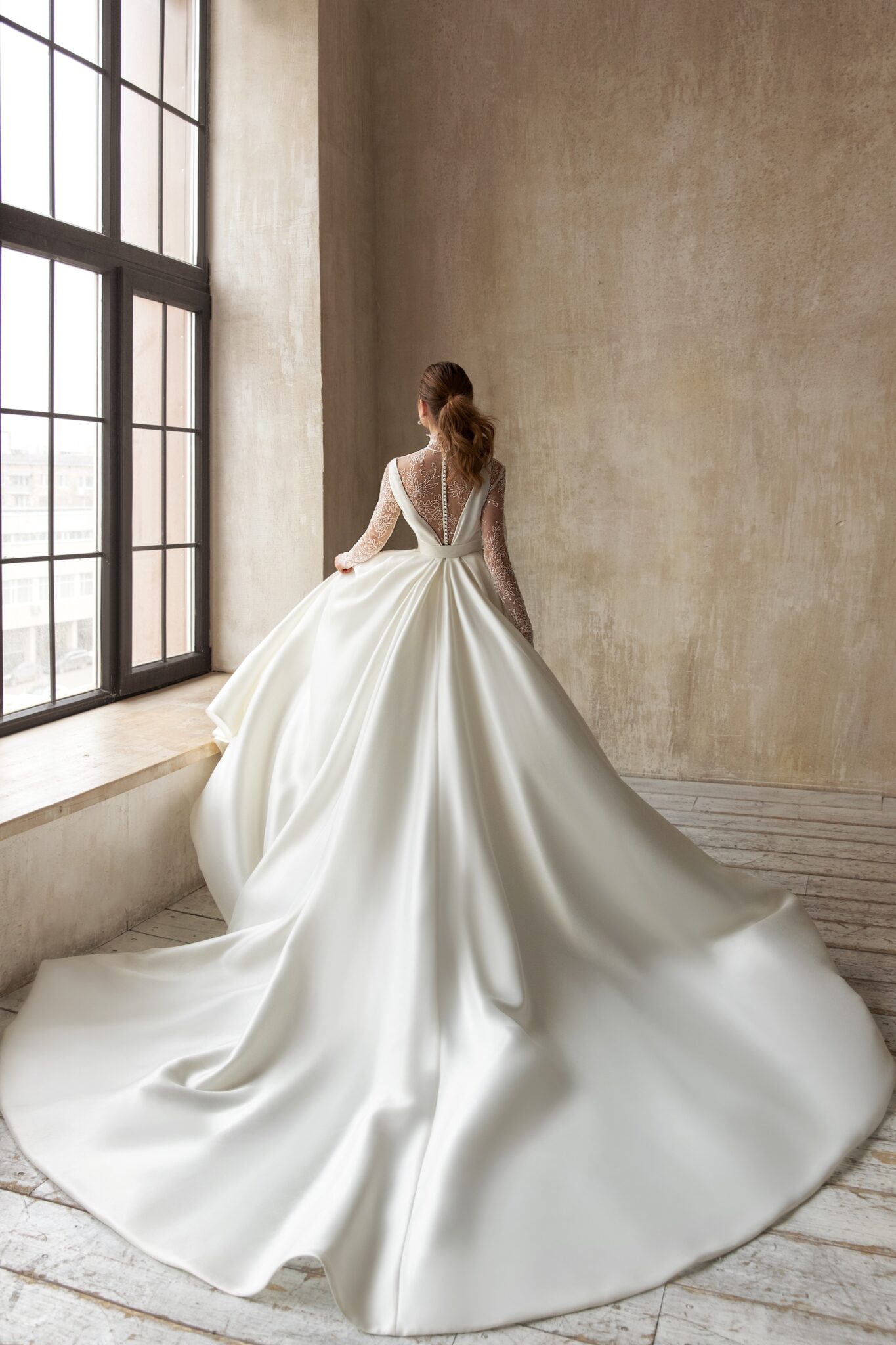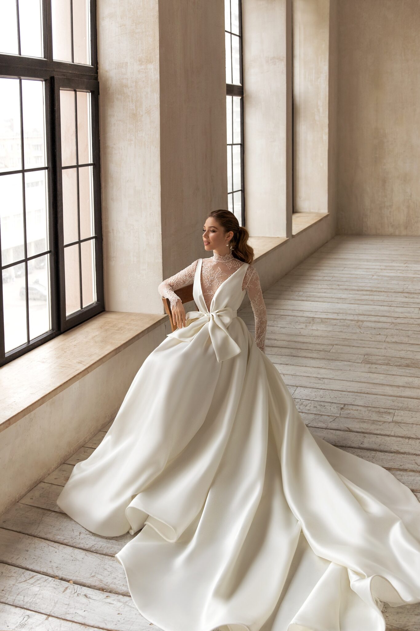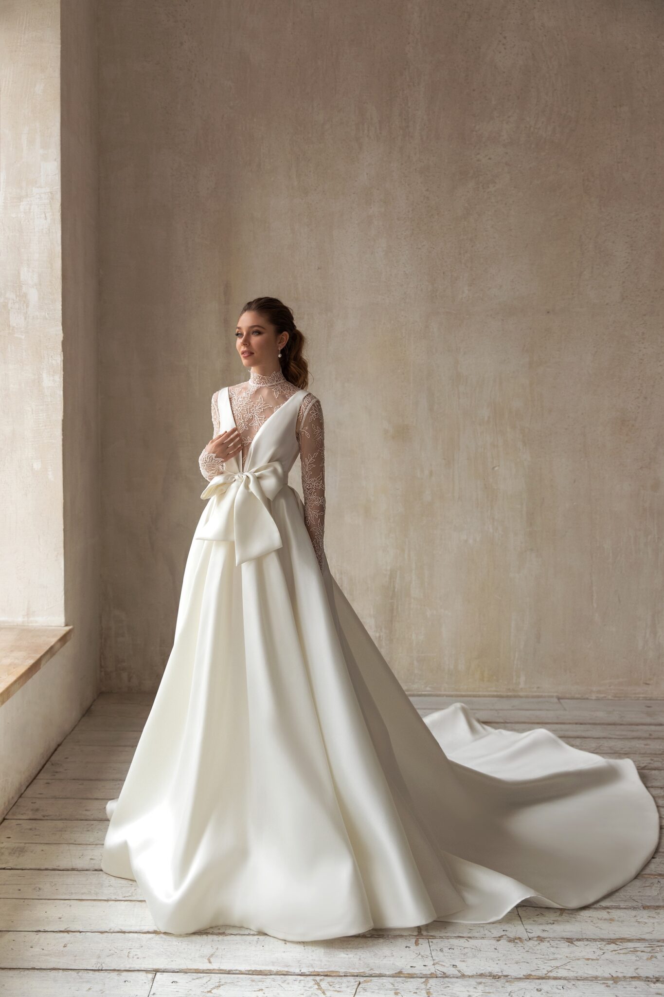 Madgalena – ніжне і делікатне плаття, яке створює романтичний вінтажний образ на весілля. Облягаюче плаття прямого крою зроблене з глянцевої тканини. Корсет на широких бретелях з V-подібним вирізом вишукано підкреслений великим бантом на передній частині плаття. Прозора блузка з високим коміром прикрашена блискучими квітковими візерунками і рядом гудзиків. Пишна спідниця переходить у довгий шлейф.