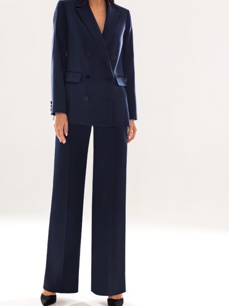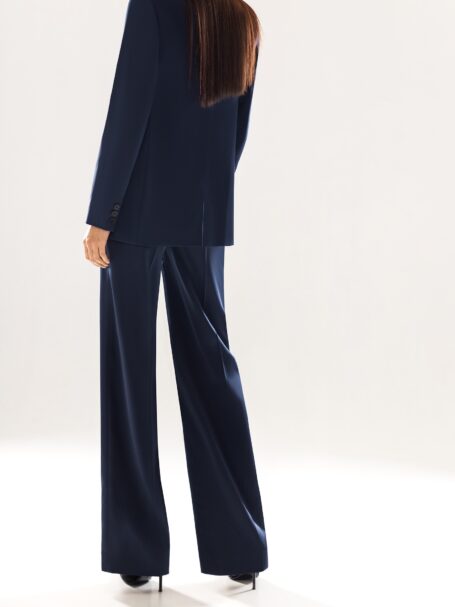Класична блискуча весільна сукня прямого силуету. Верх із V-подібним вирізом з глибоким декольте та декоративним елементом спереду. Сукня прикрашена довгими рукавами з такої ж блискучої тканини. Спідниця облягає стегна і стає більш вільною до колін, закінчуючись акуратним шлейфом.