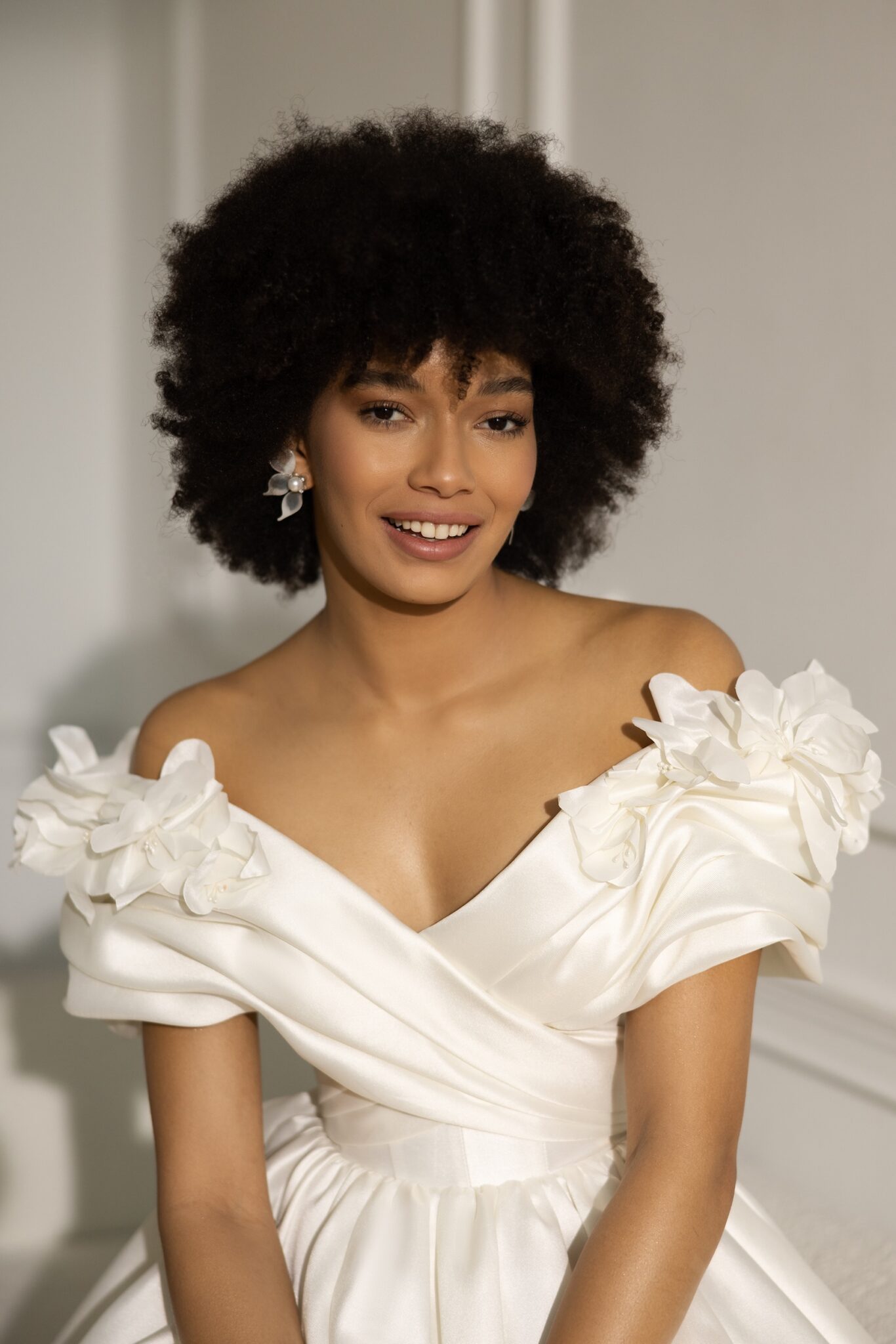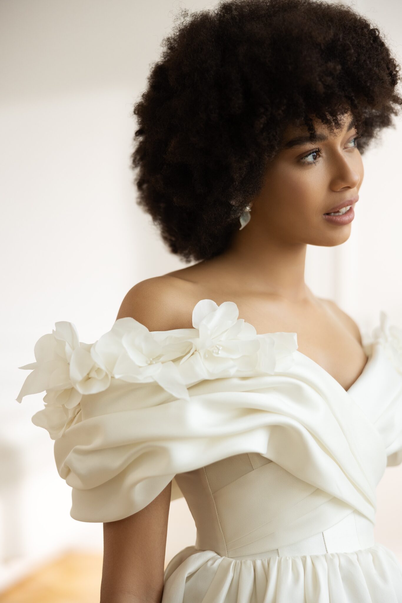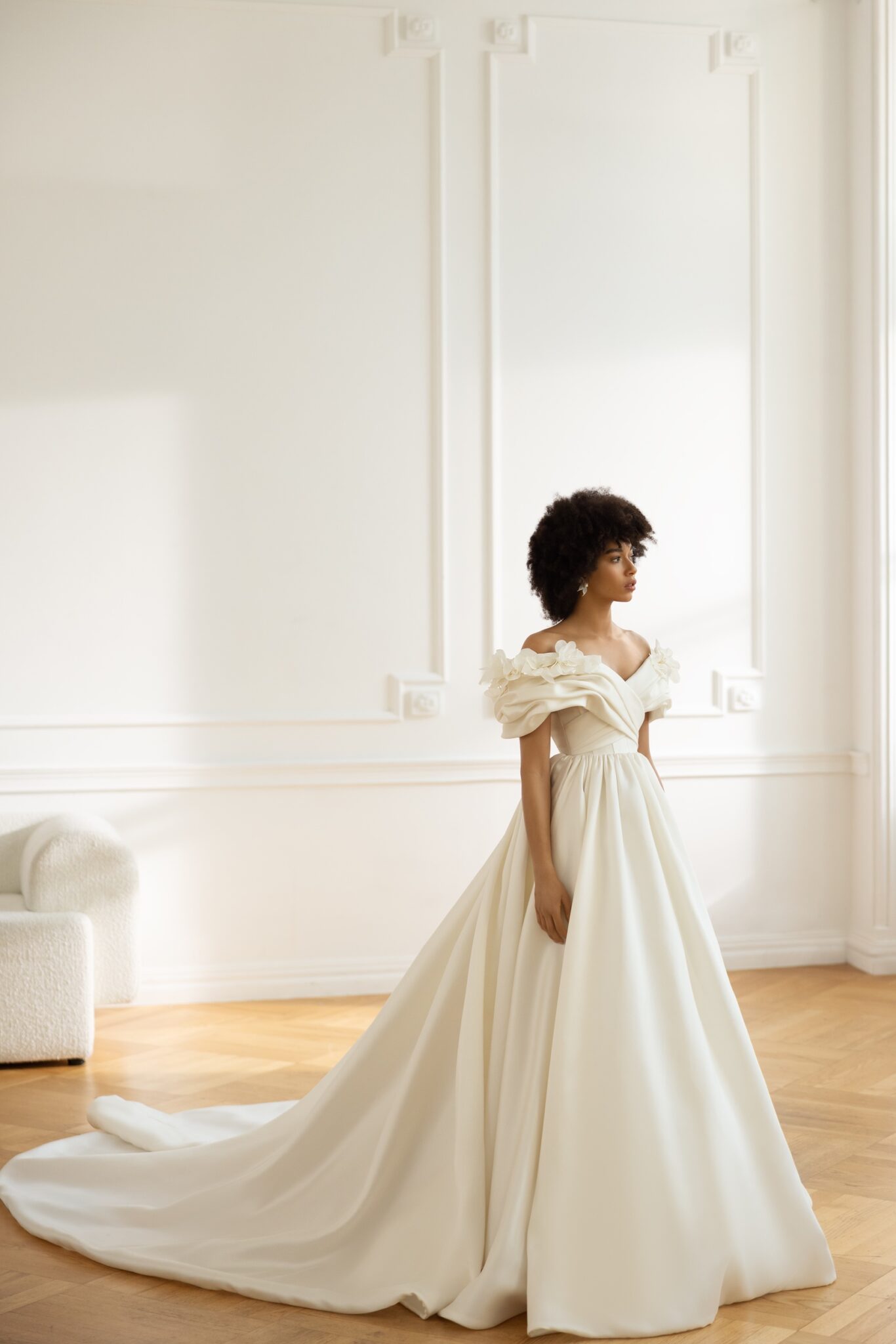 Malwa – сукня класичного крою з опущеною лінією пліч та пишною спідницею. Елегантний виріз, що відкриває плечі та ключиці прикрашений драпіруванням і чудовими об’ємними квітами. Спідниця А-силуету зі складками на талії та довгим шлейфом додає сукні королівського об’єму